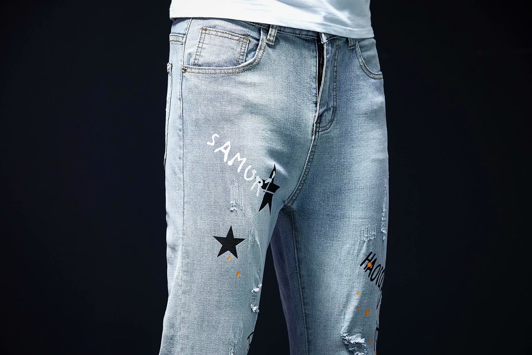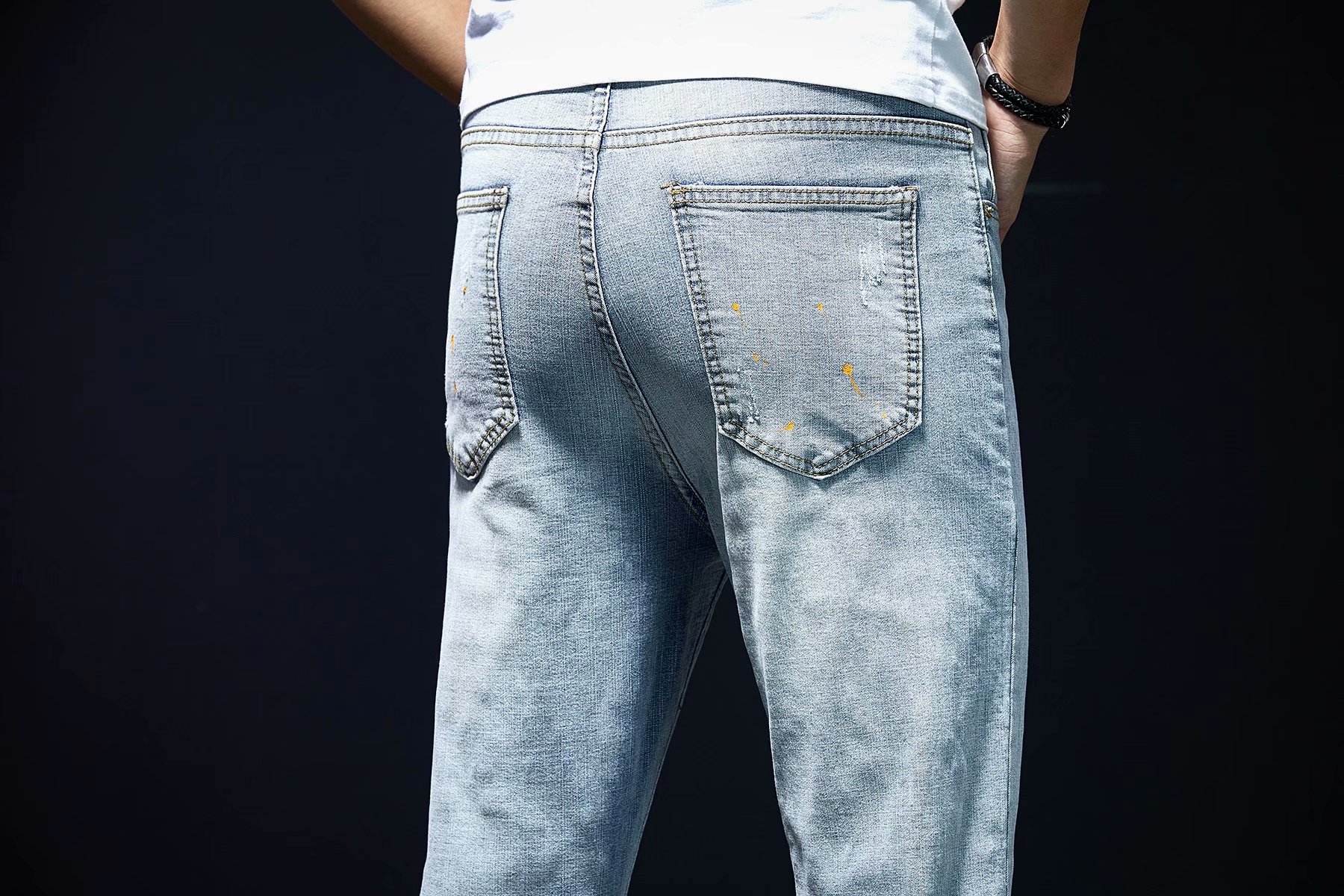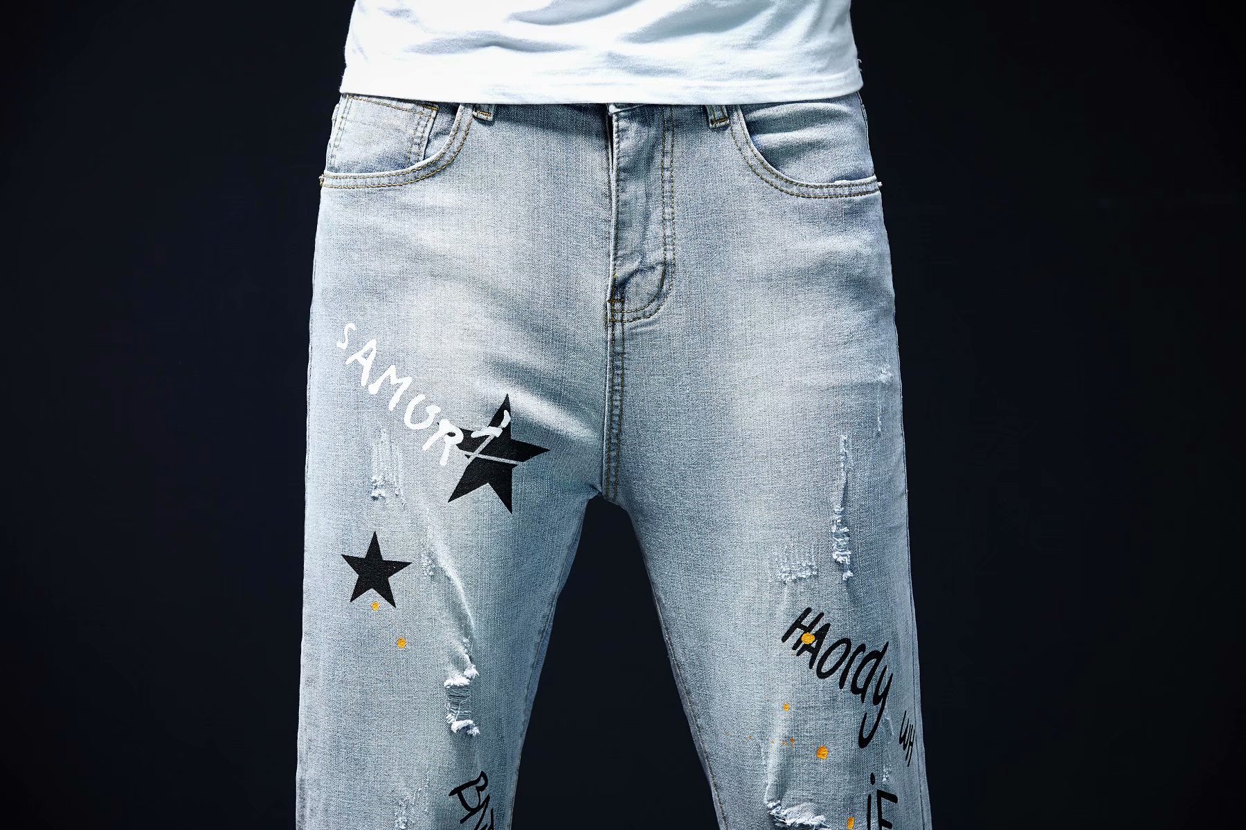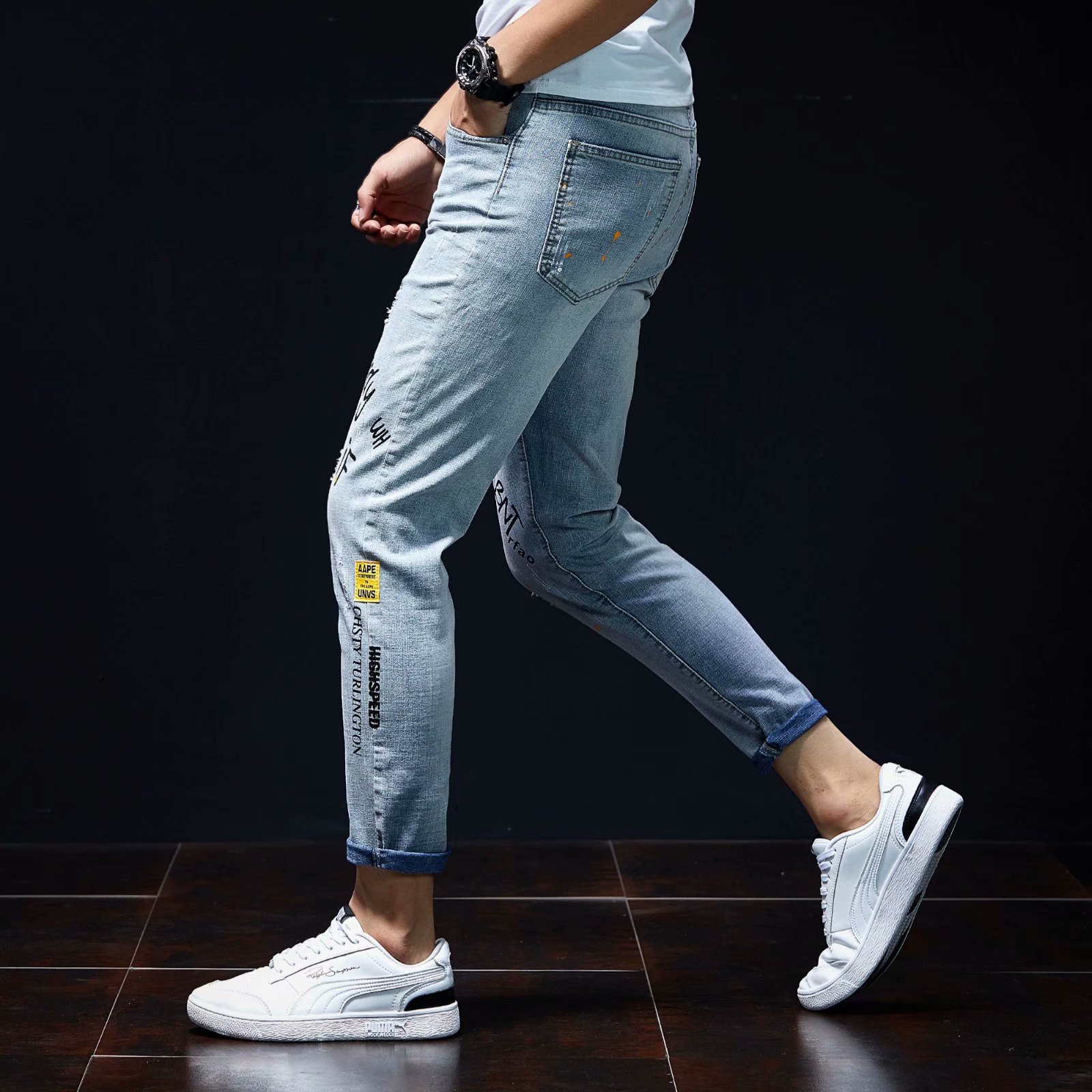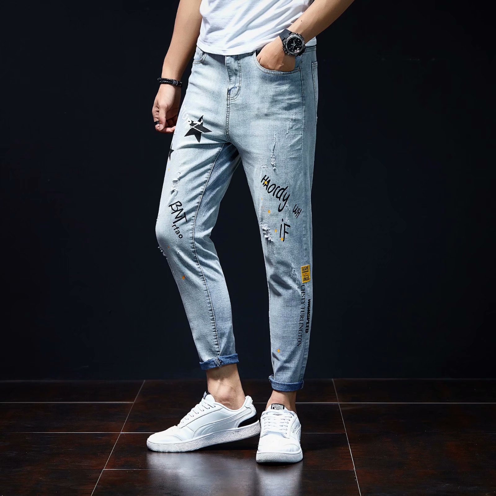 实拍裤男夏天薄款潮牌弹力修身韩版潮流九分裤破洞休闲浅色小脚裤