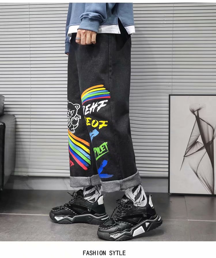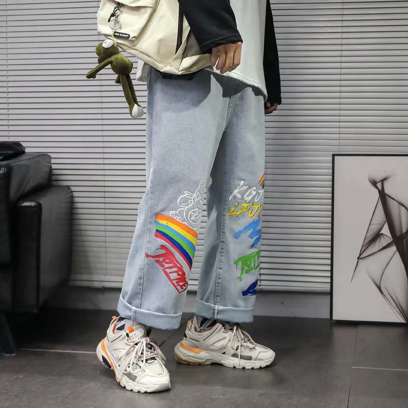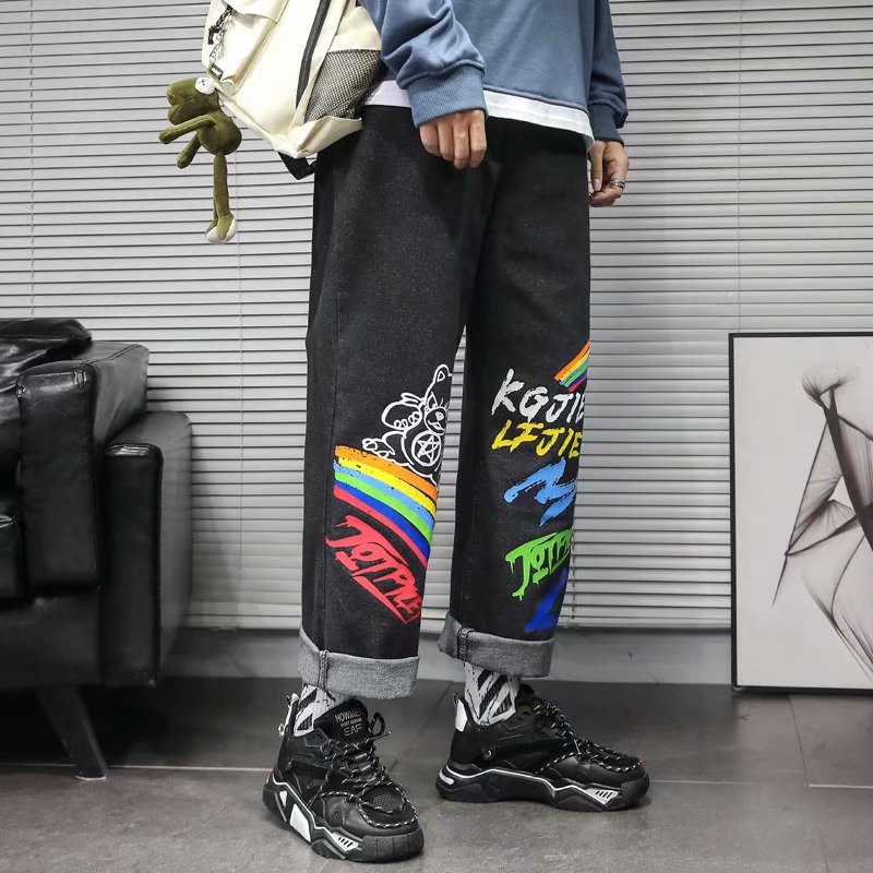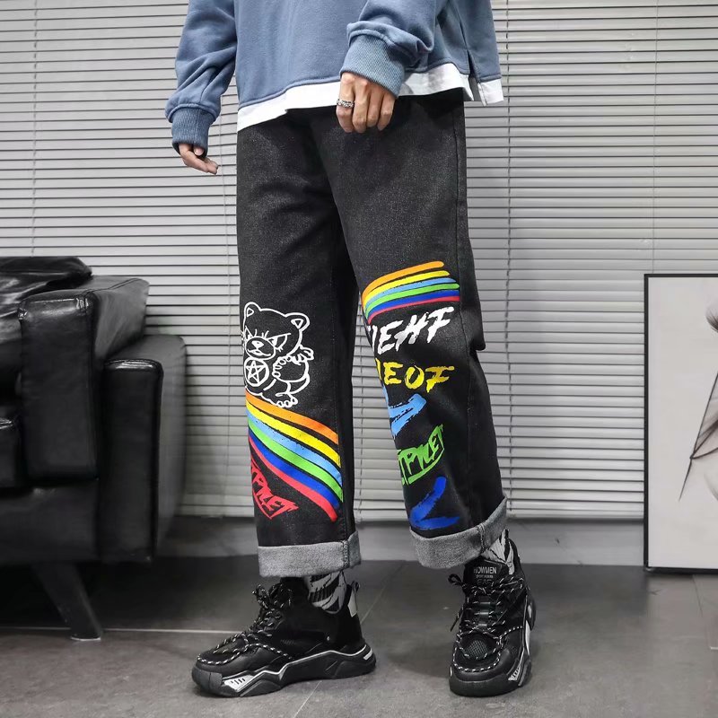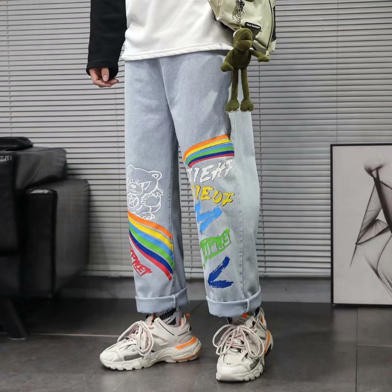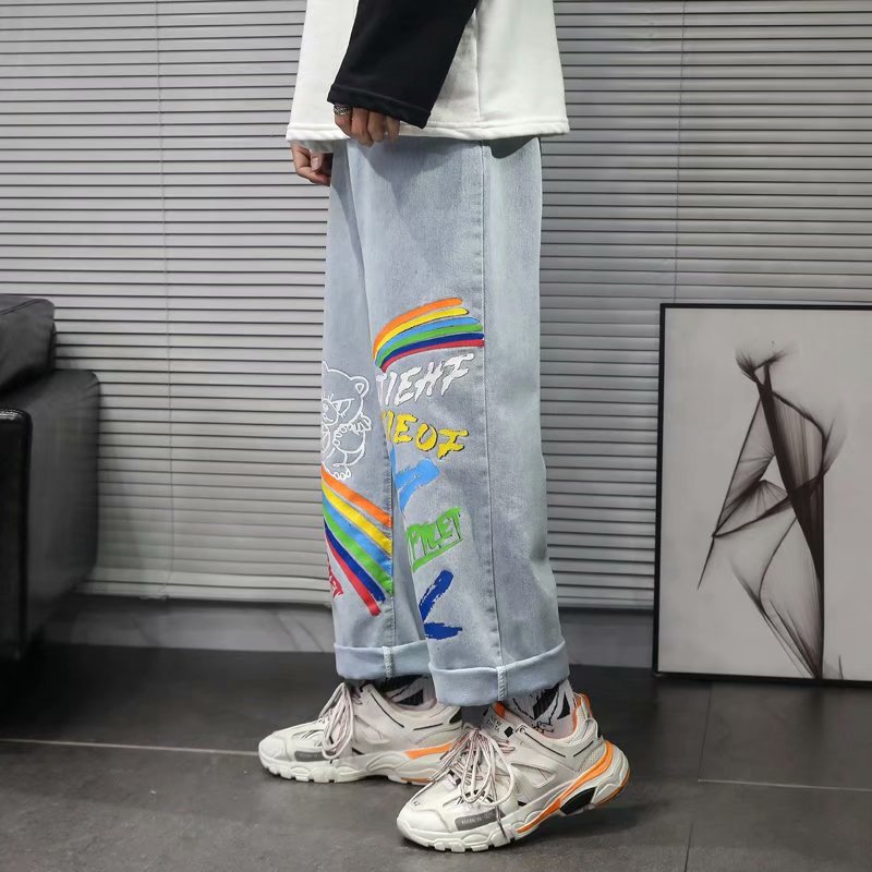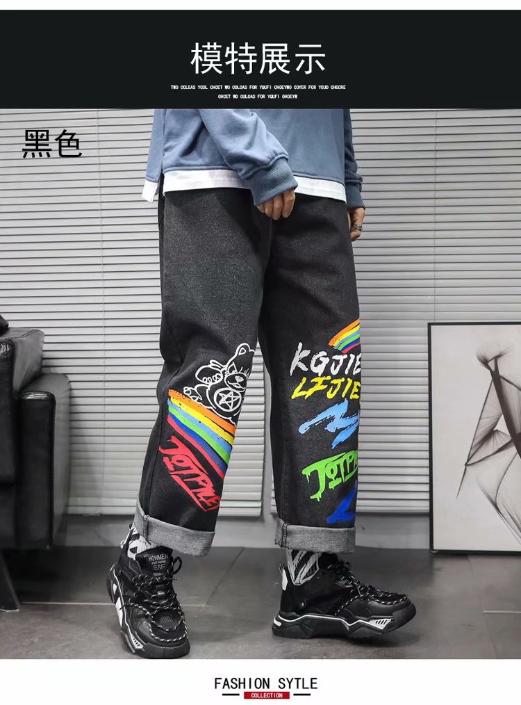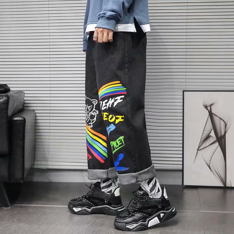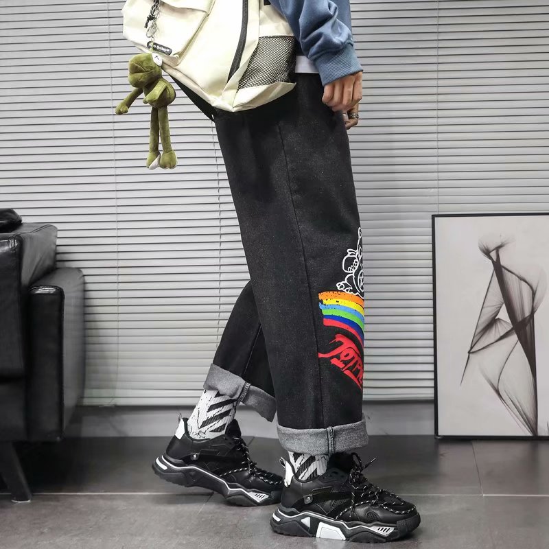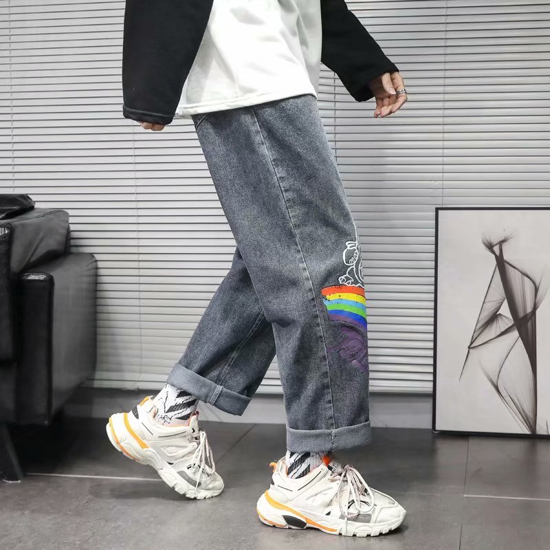 实拍 宽松牛仔裤男潮牌个性百搭裤子韩版潮流情侣装直筒阔腿长裤