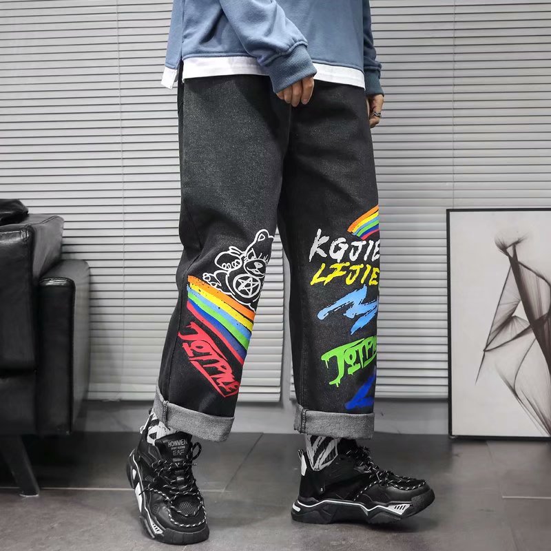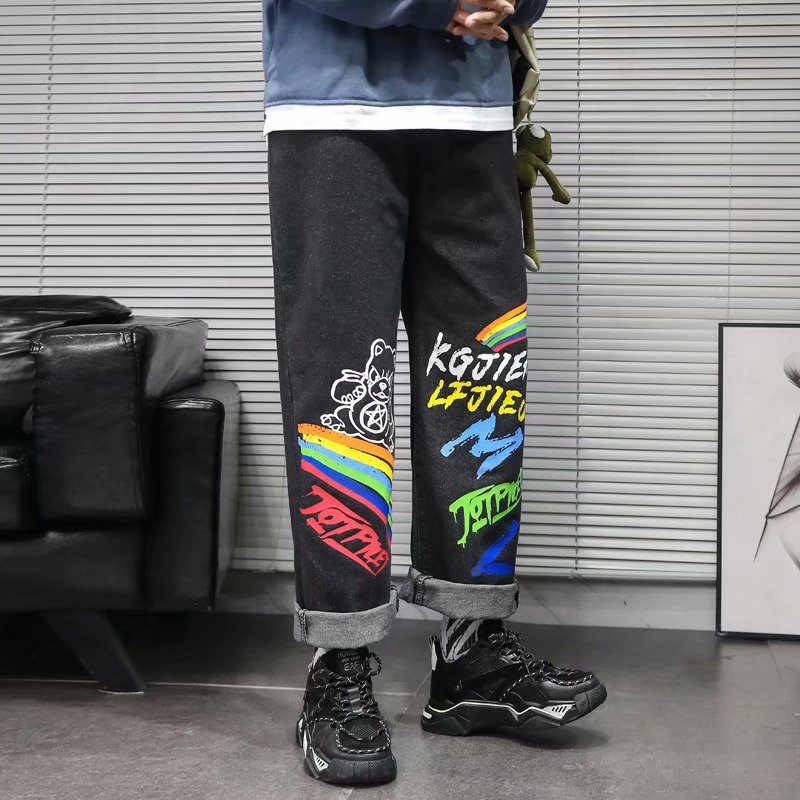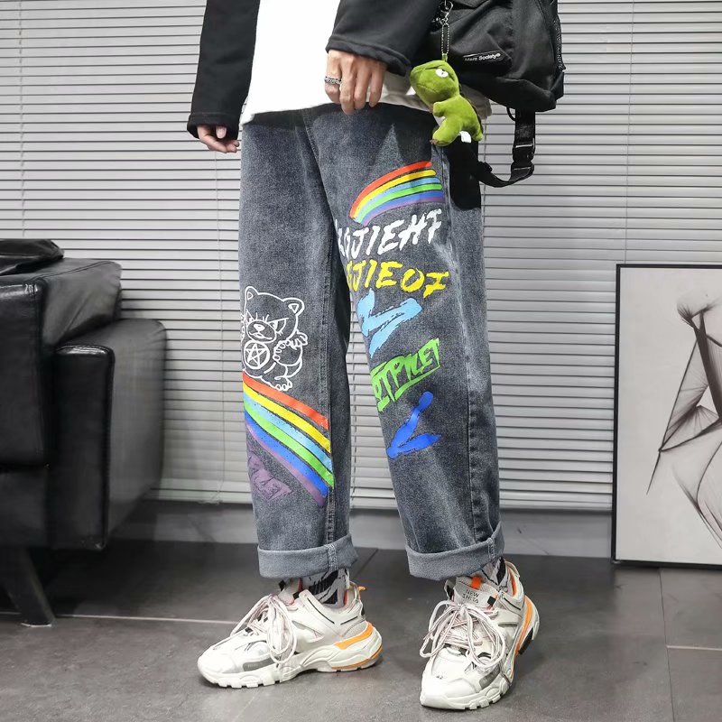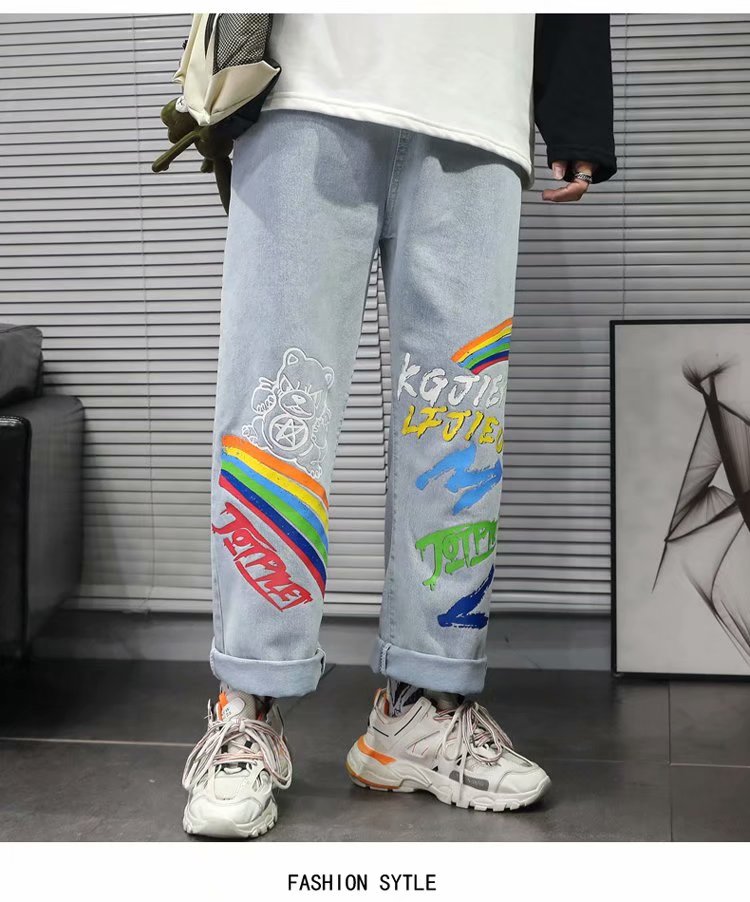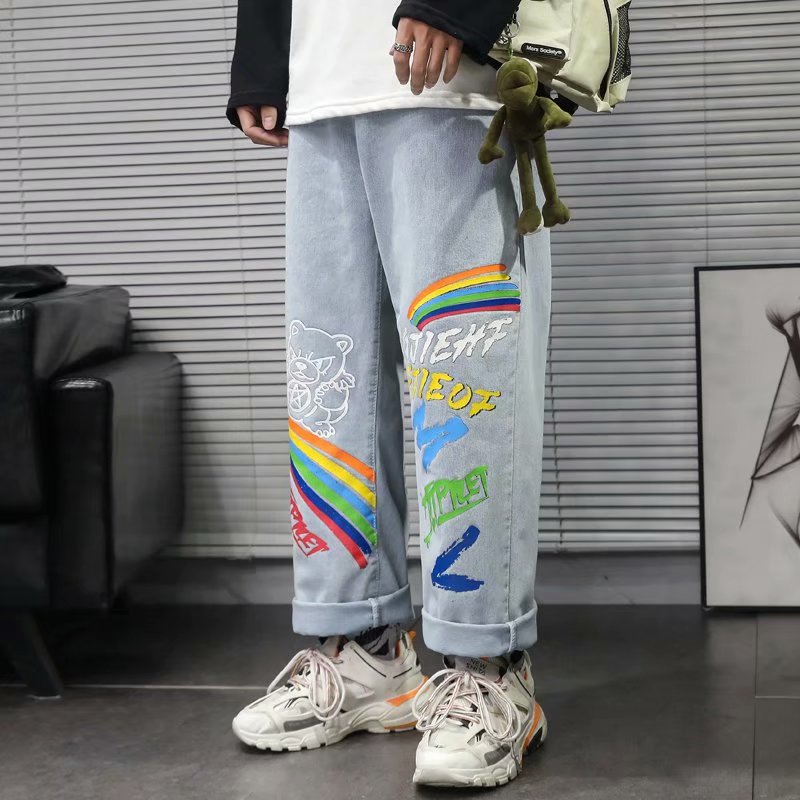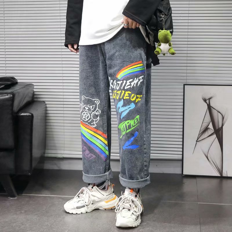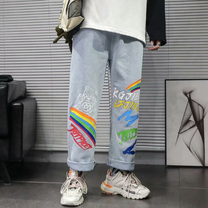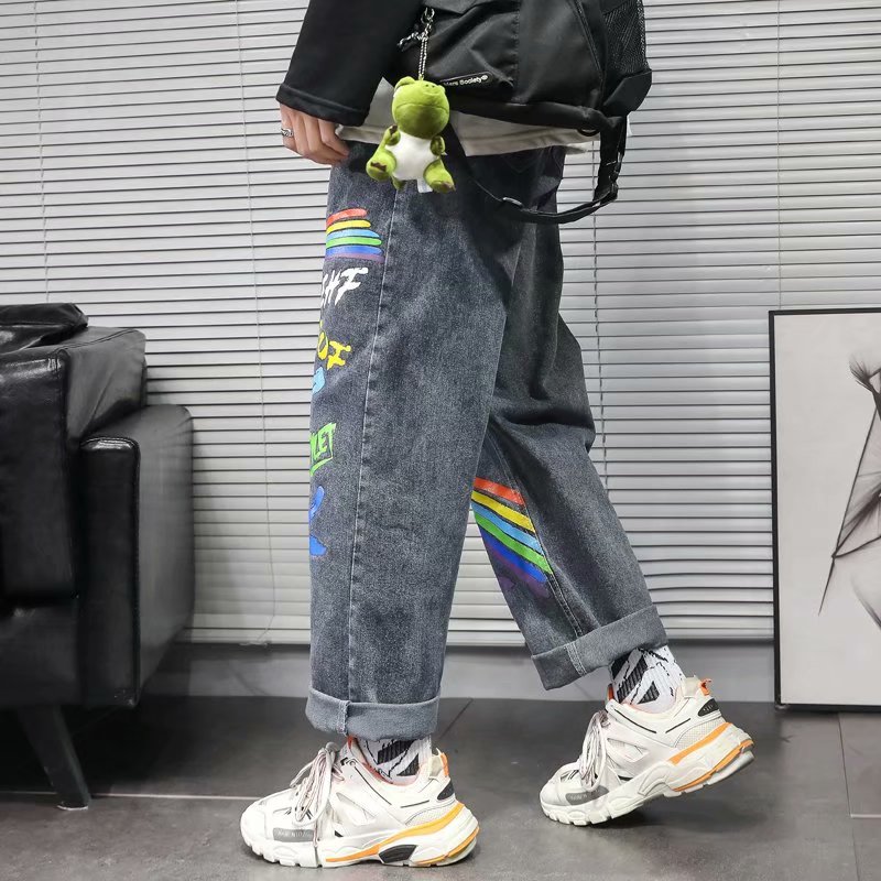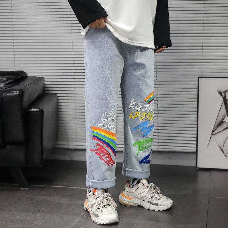 实拍 宽松牛仔裤男潮牌个性百搭裤子韩版潮流情侣装直筒阔腿长裤