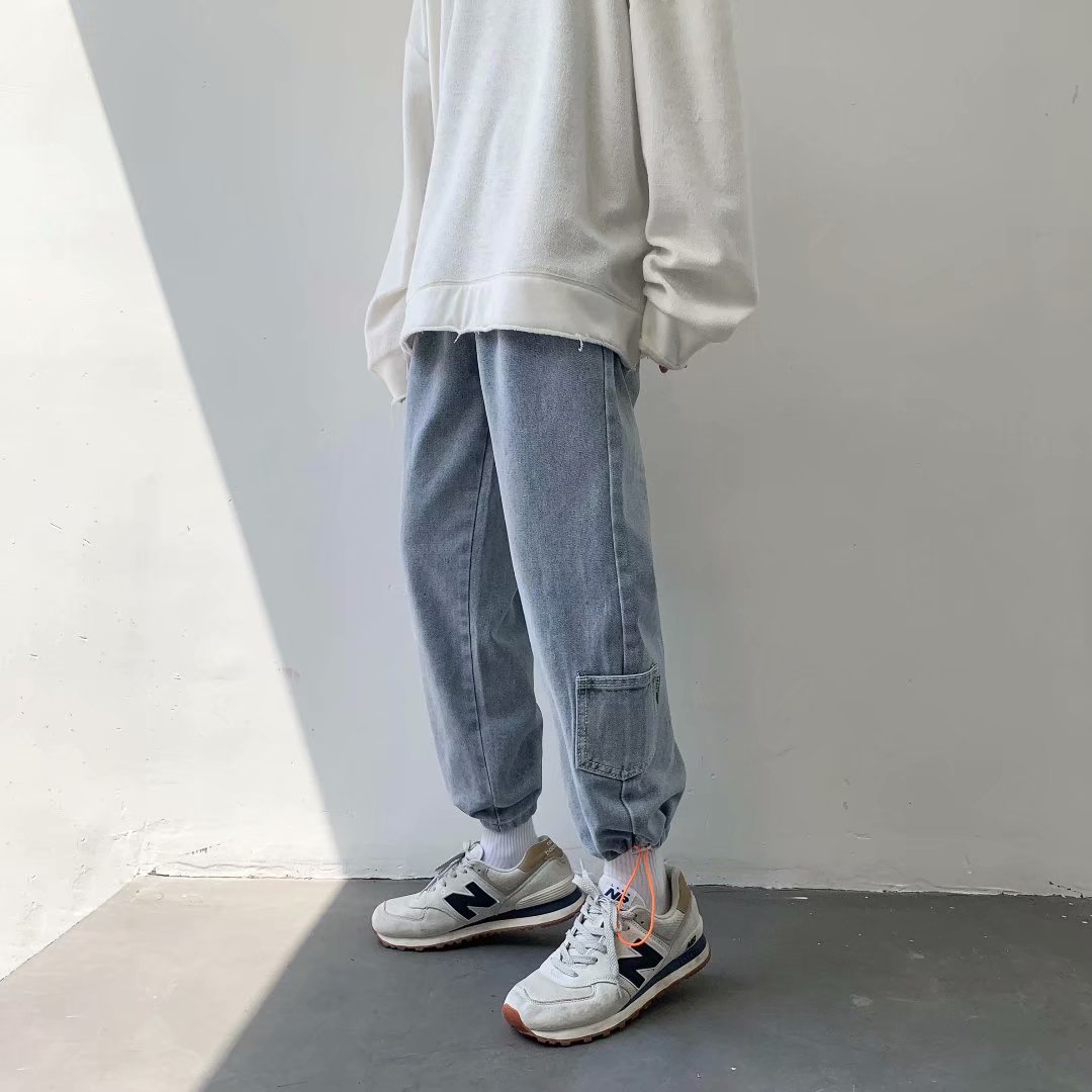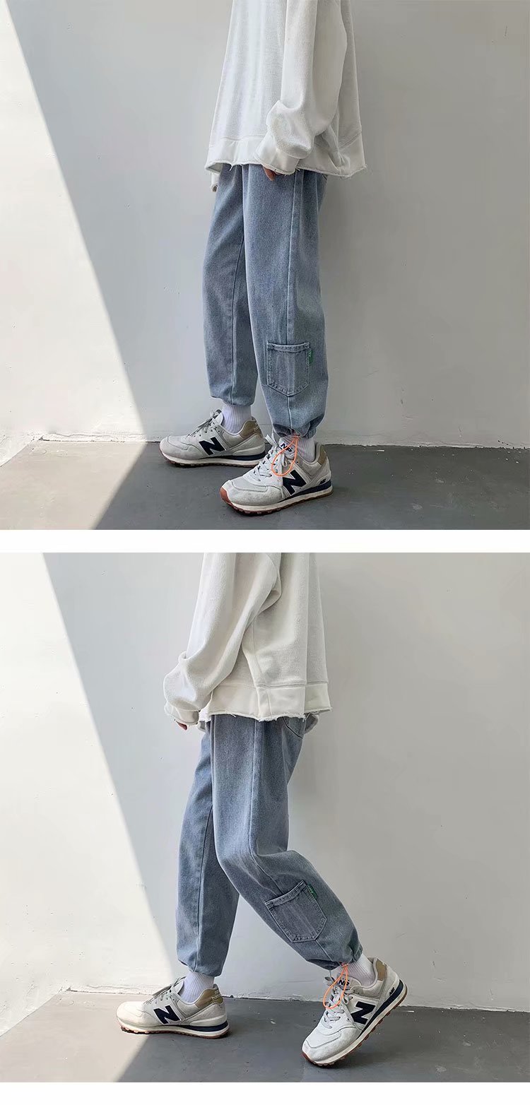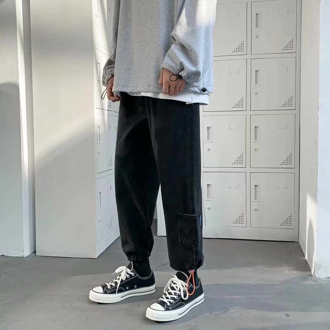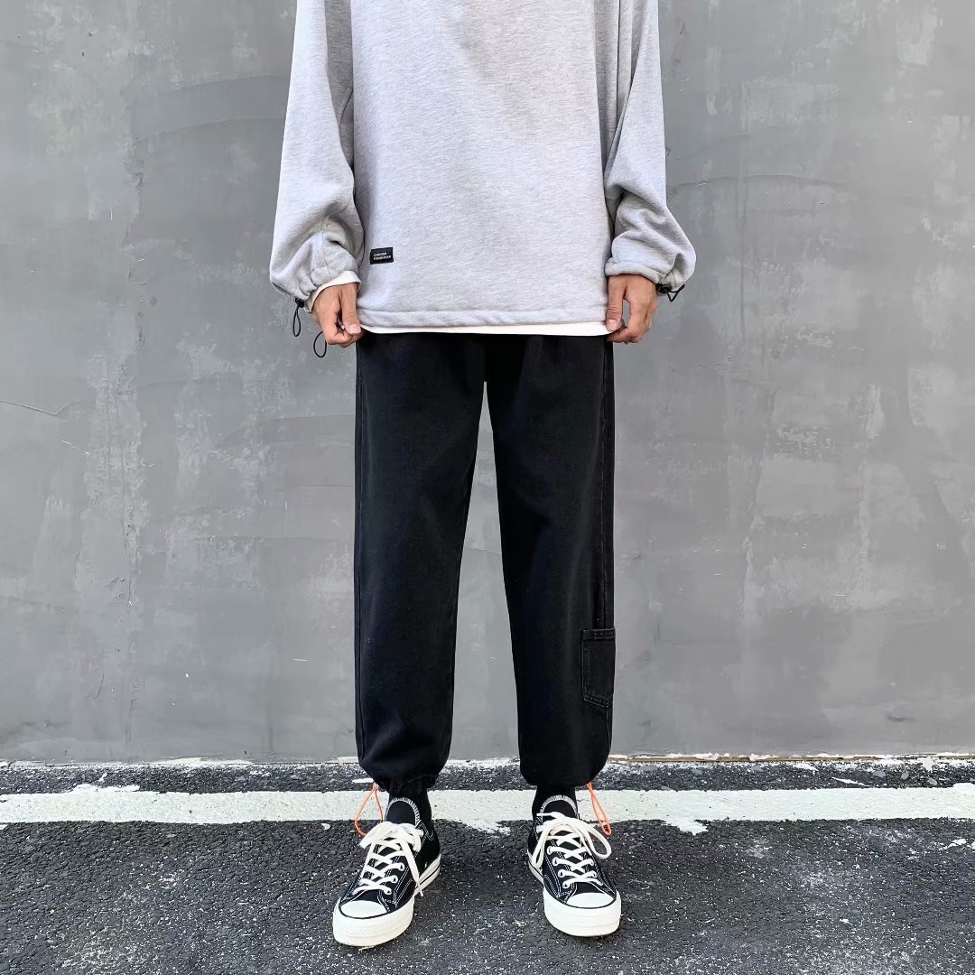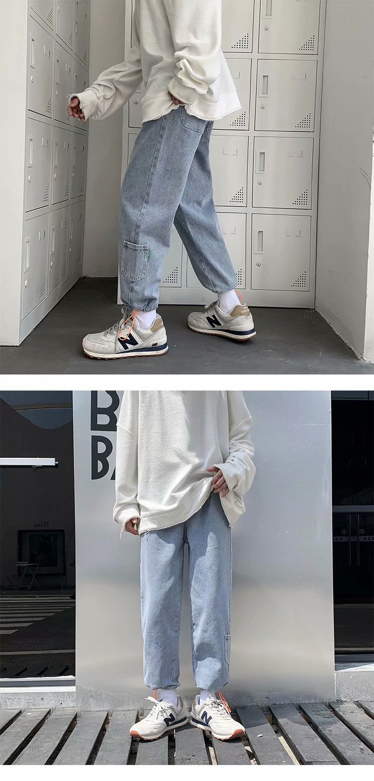 实拍 韩版宽松纯色港风百搭水洗牛仔上衣男日系宽松休闲束脚裤潮