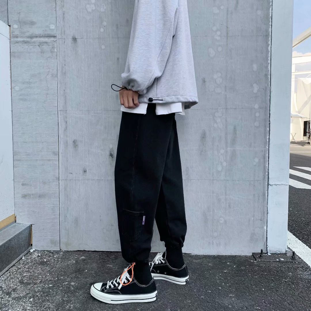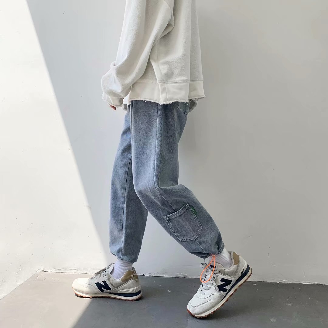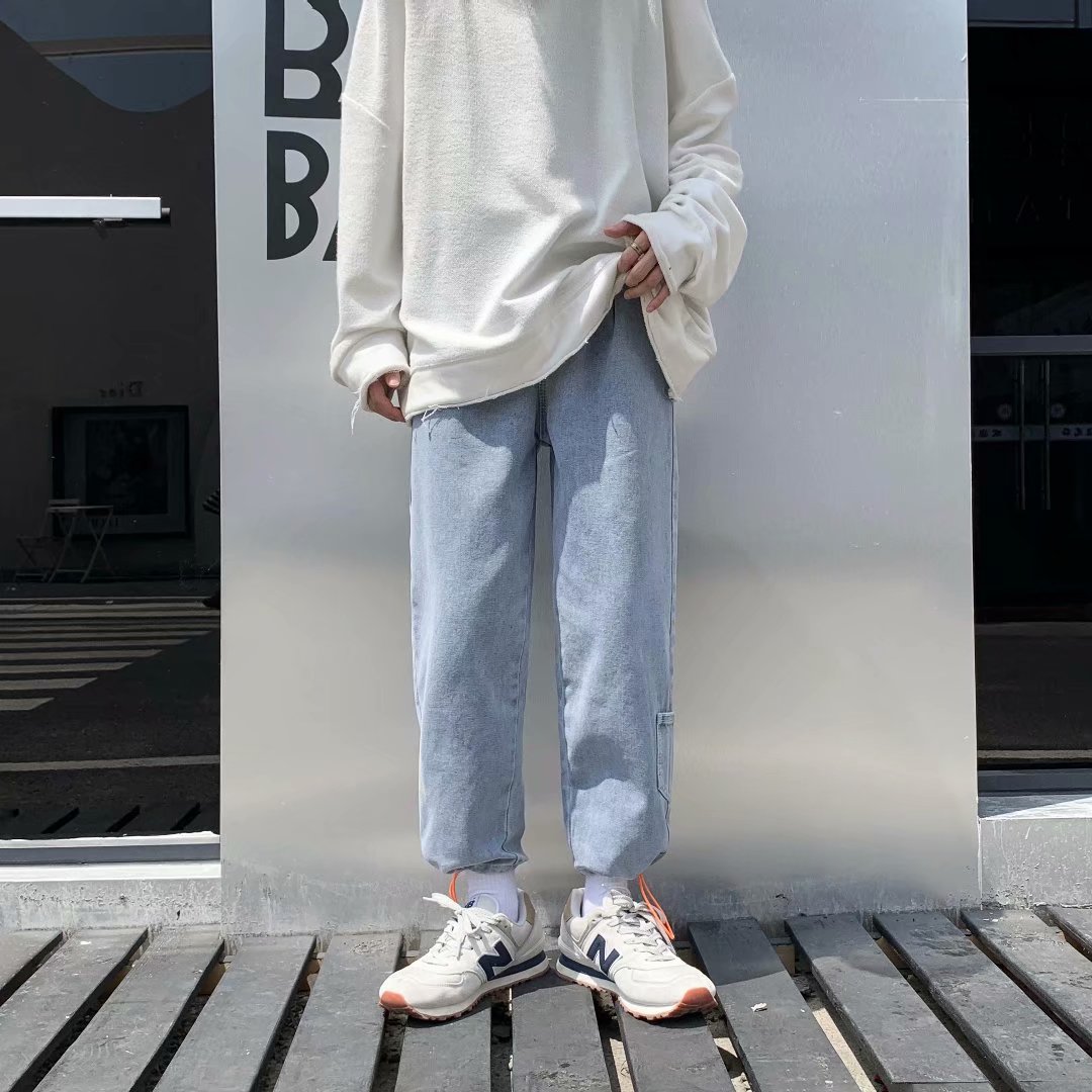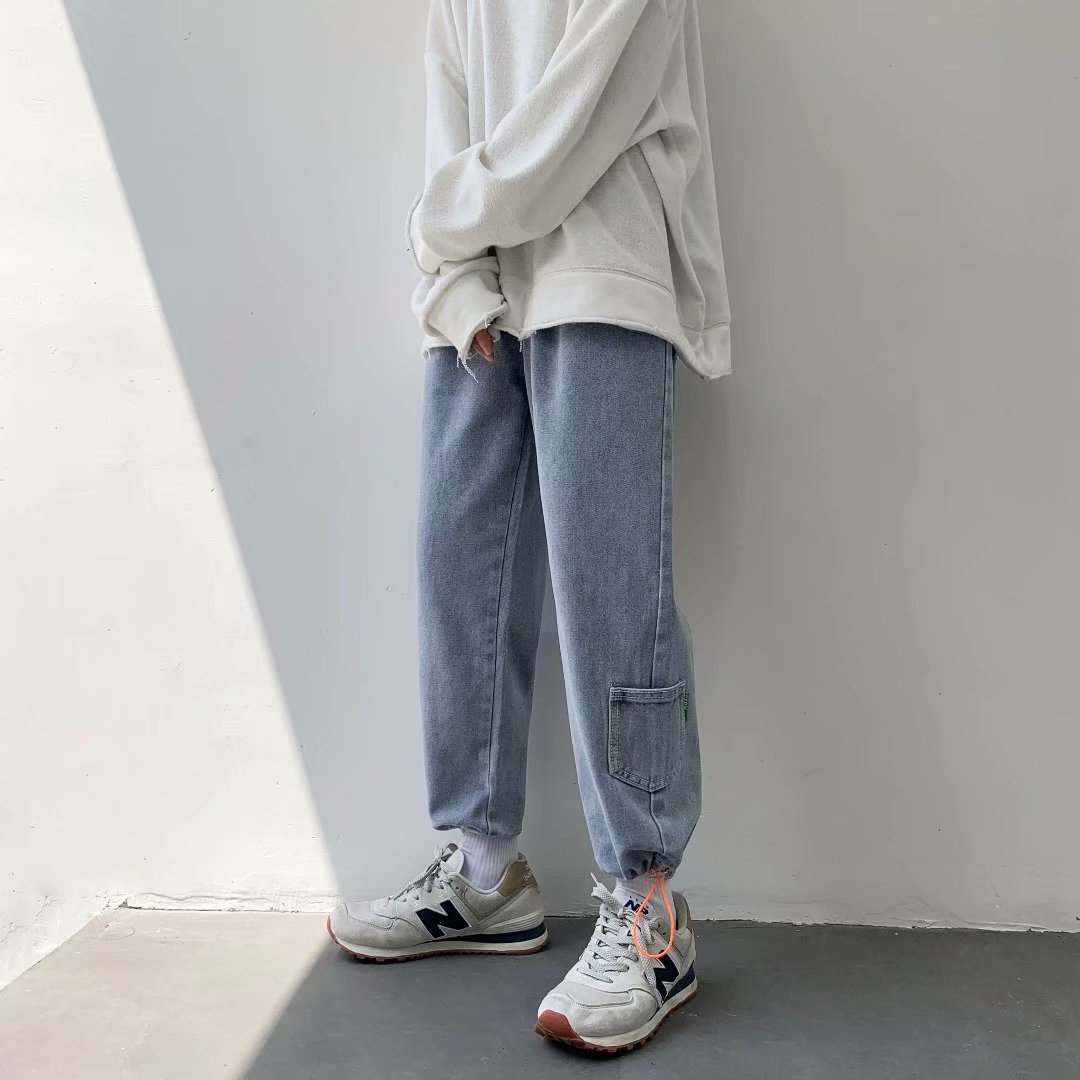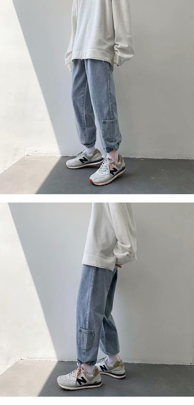 实拍 韩版宽松纯色港风百搭水洗牛仔上衣男日系宽松休闲束脚裤潮