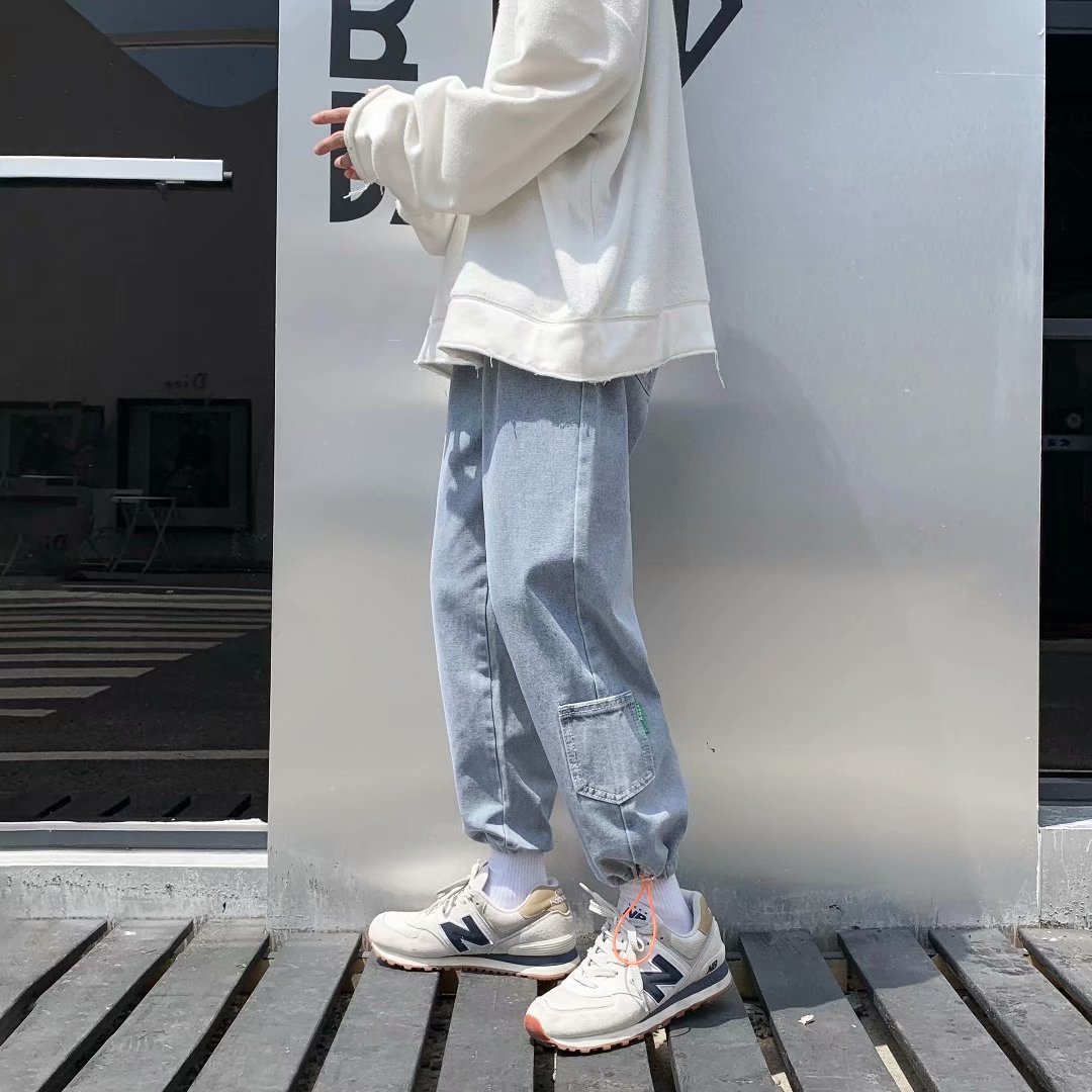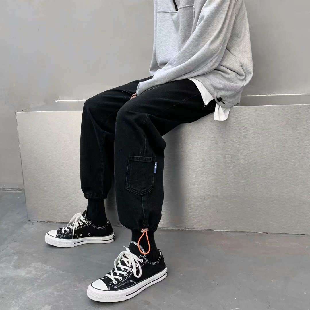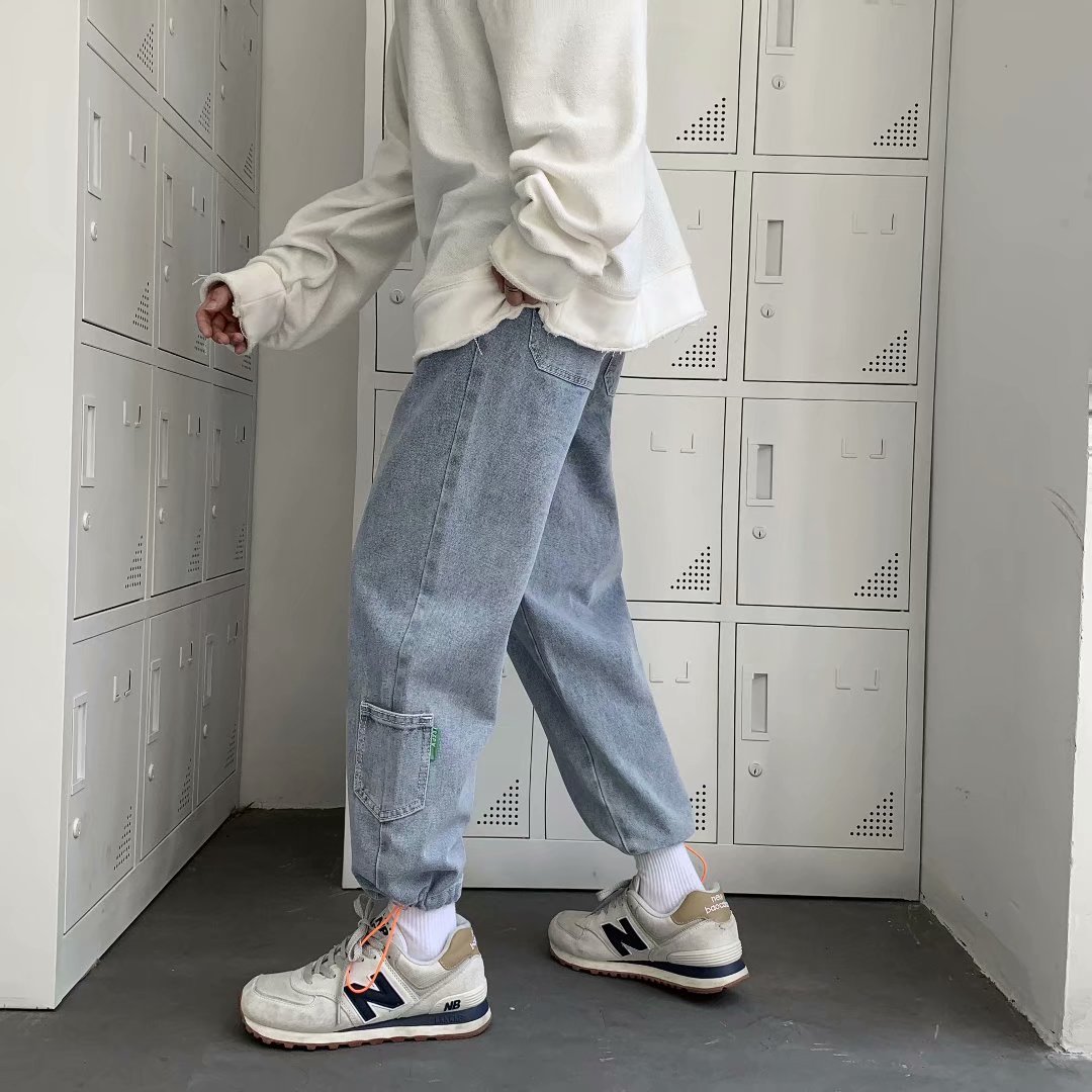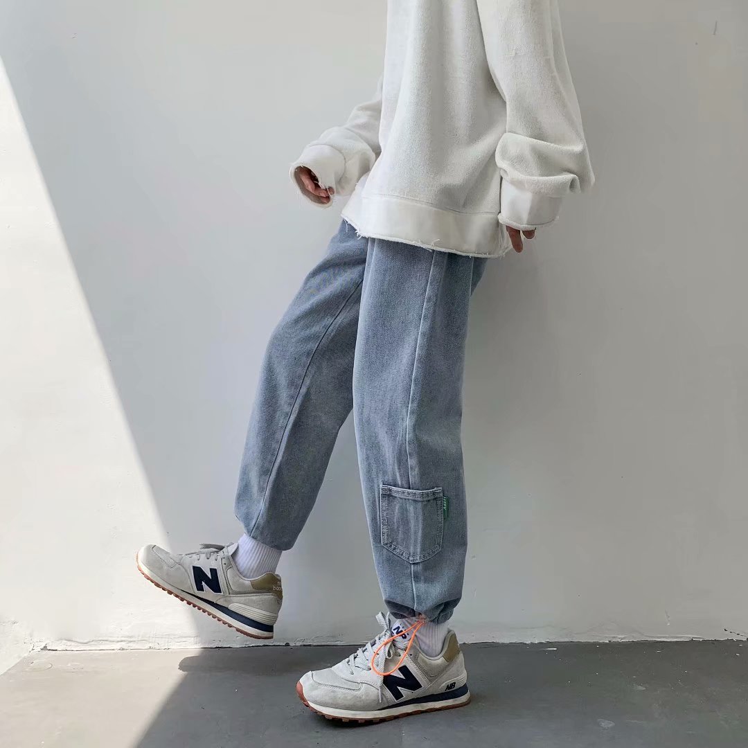 实拍 韩版宽松纯色港风百搭水洗牛仔上衣男日系宽松休闲束脚裤潮