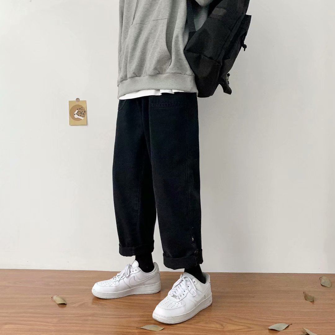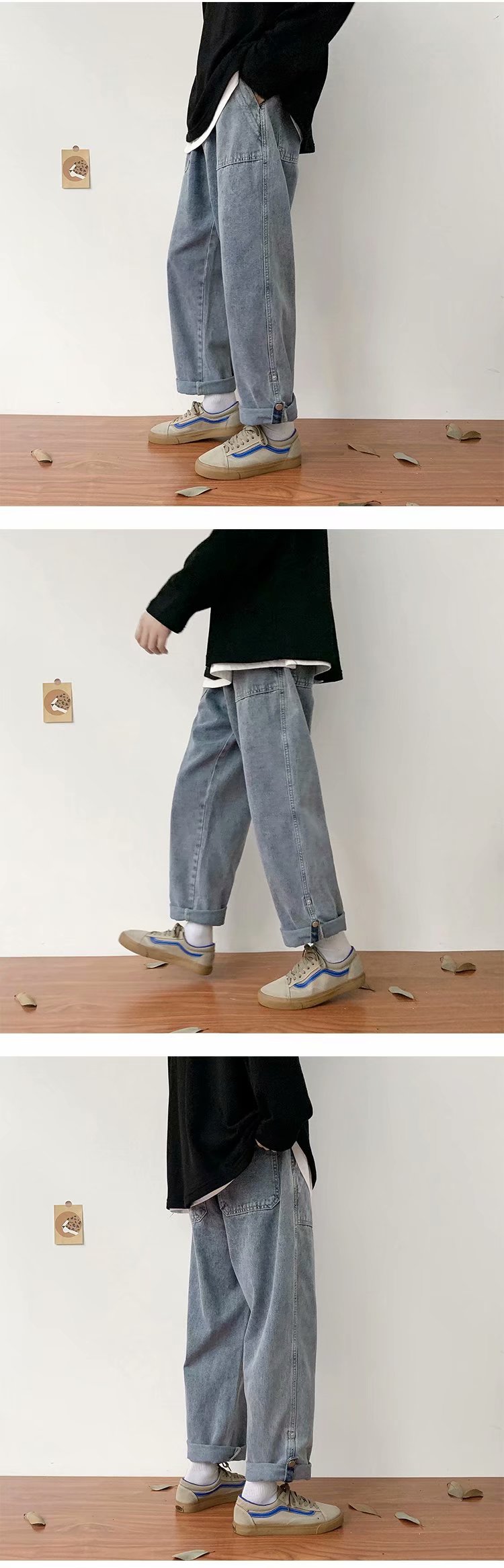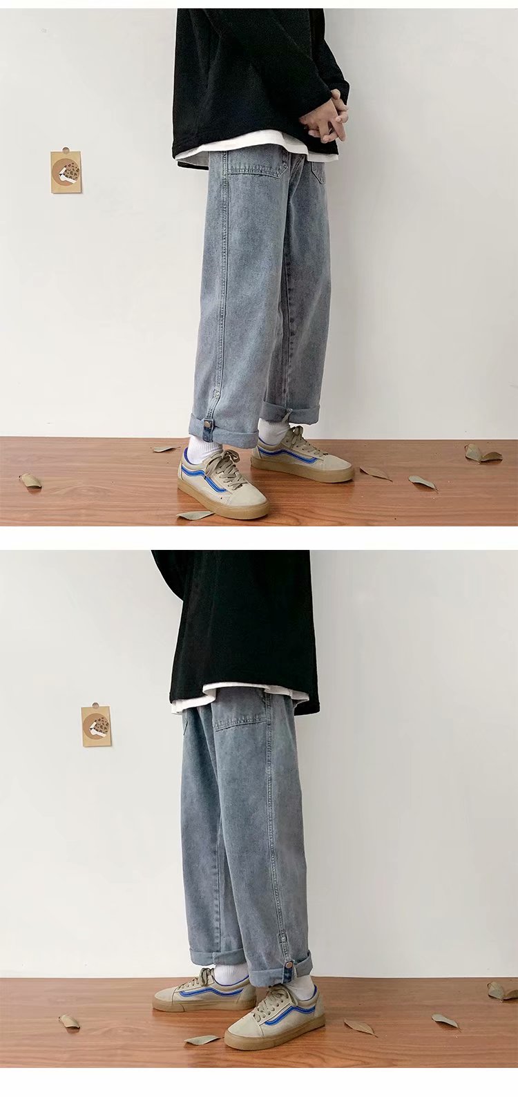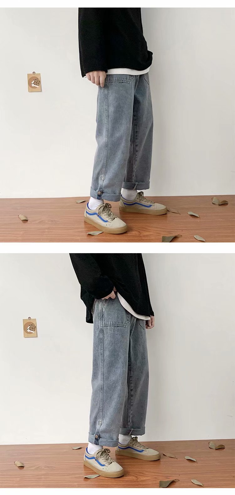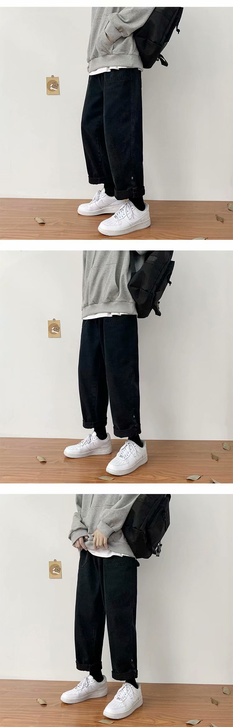 实拍 日系简约港风纯色百搭街头水洗牛仔裤男韩版休闲宽松九分裤