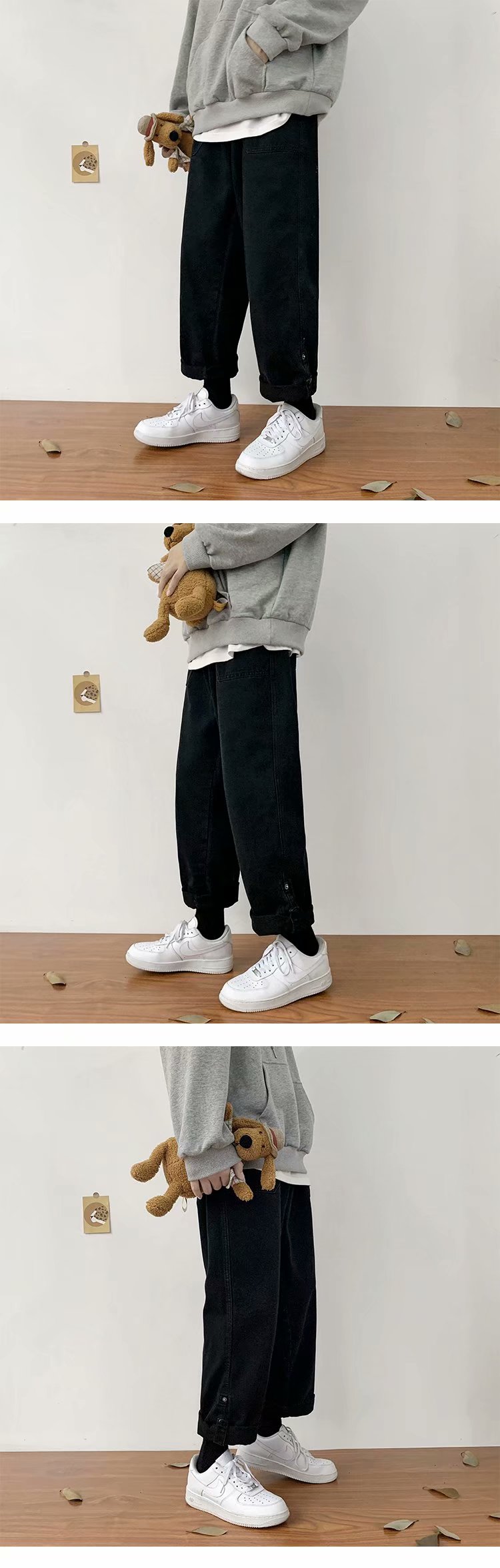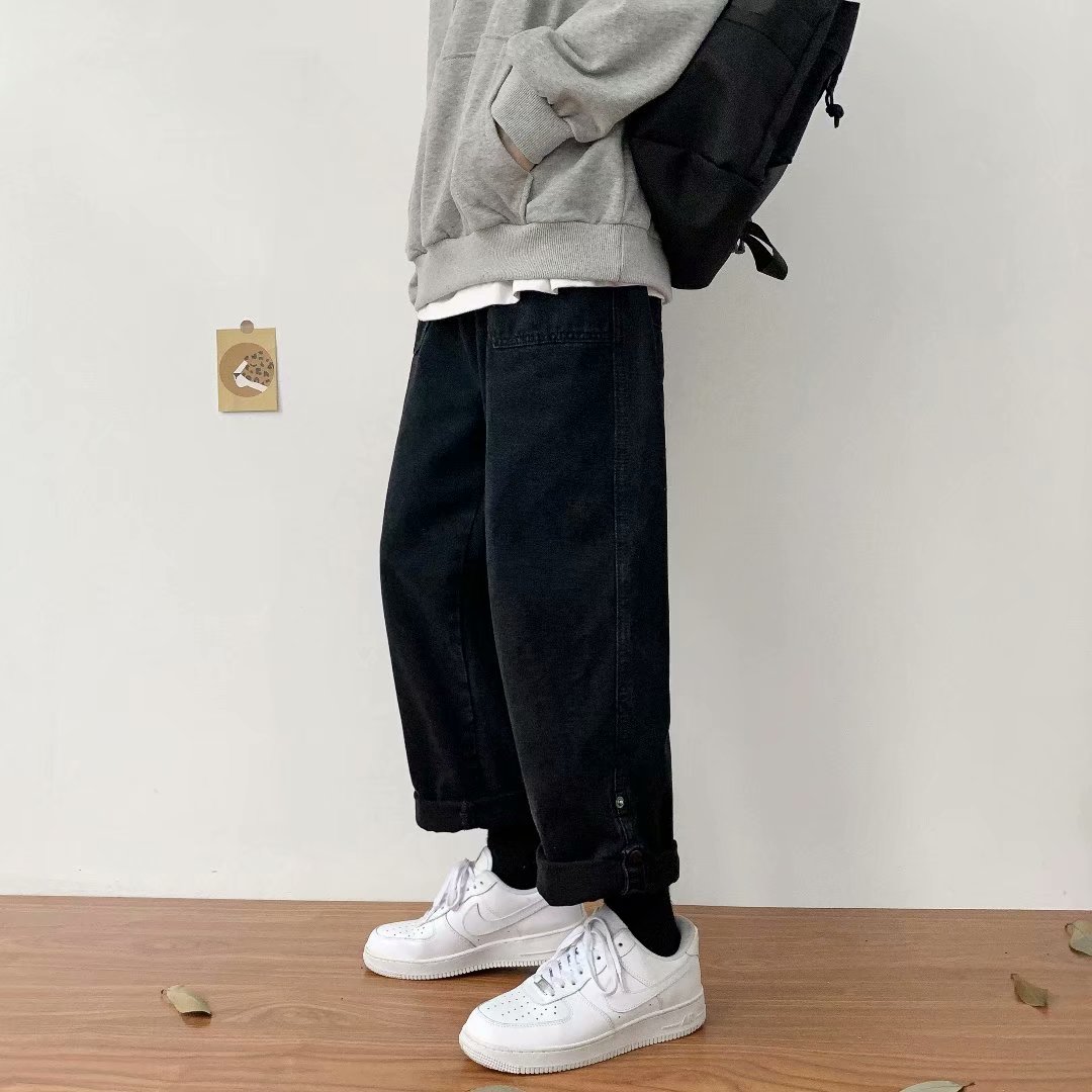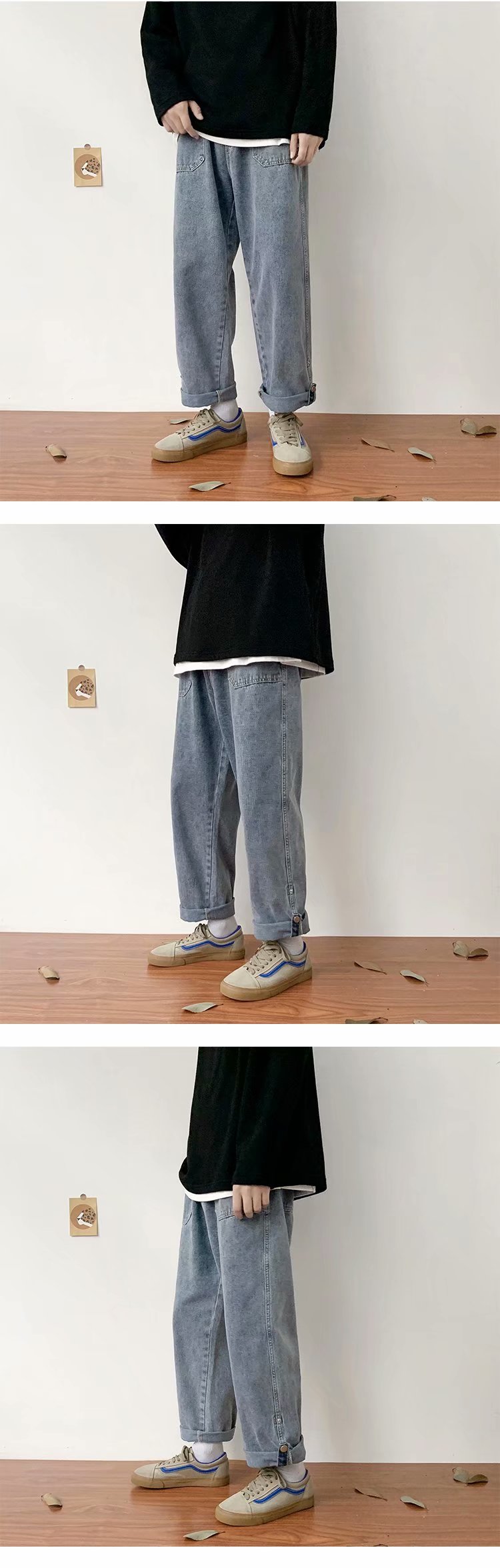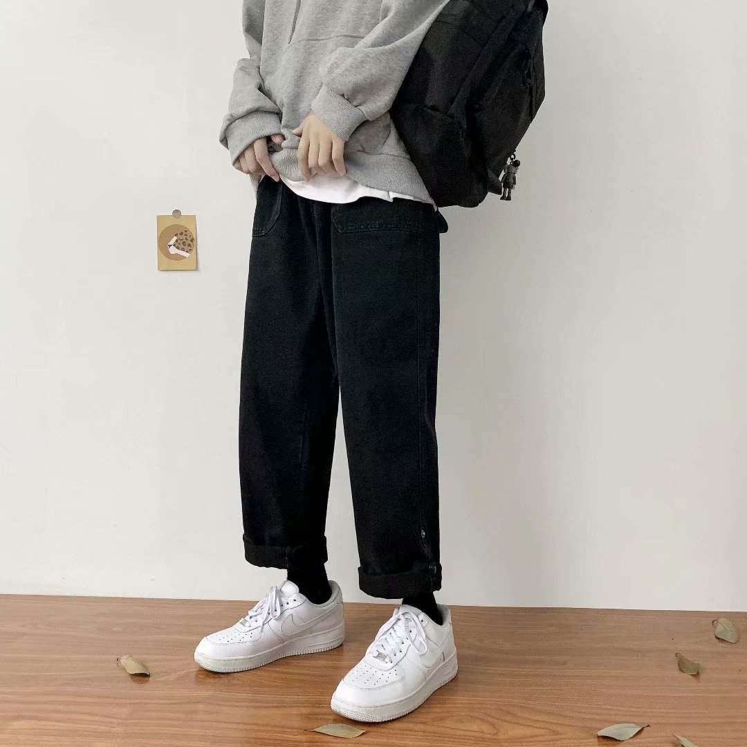 实拍 日系简约港风纯色百搭街头水洗牛仔裤男韩版休闲宽松九分裤