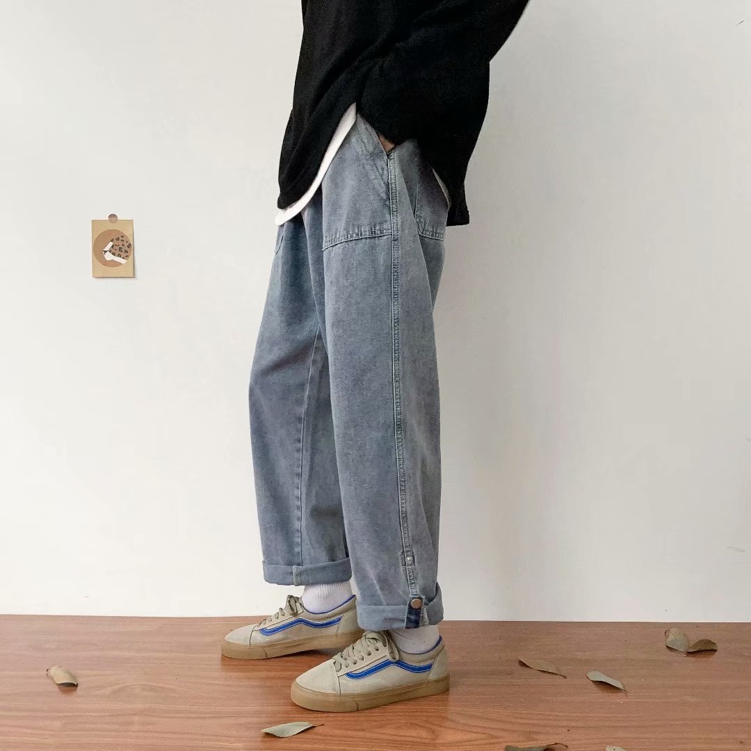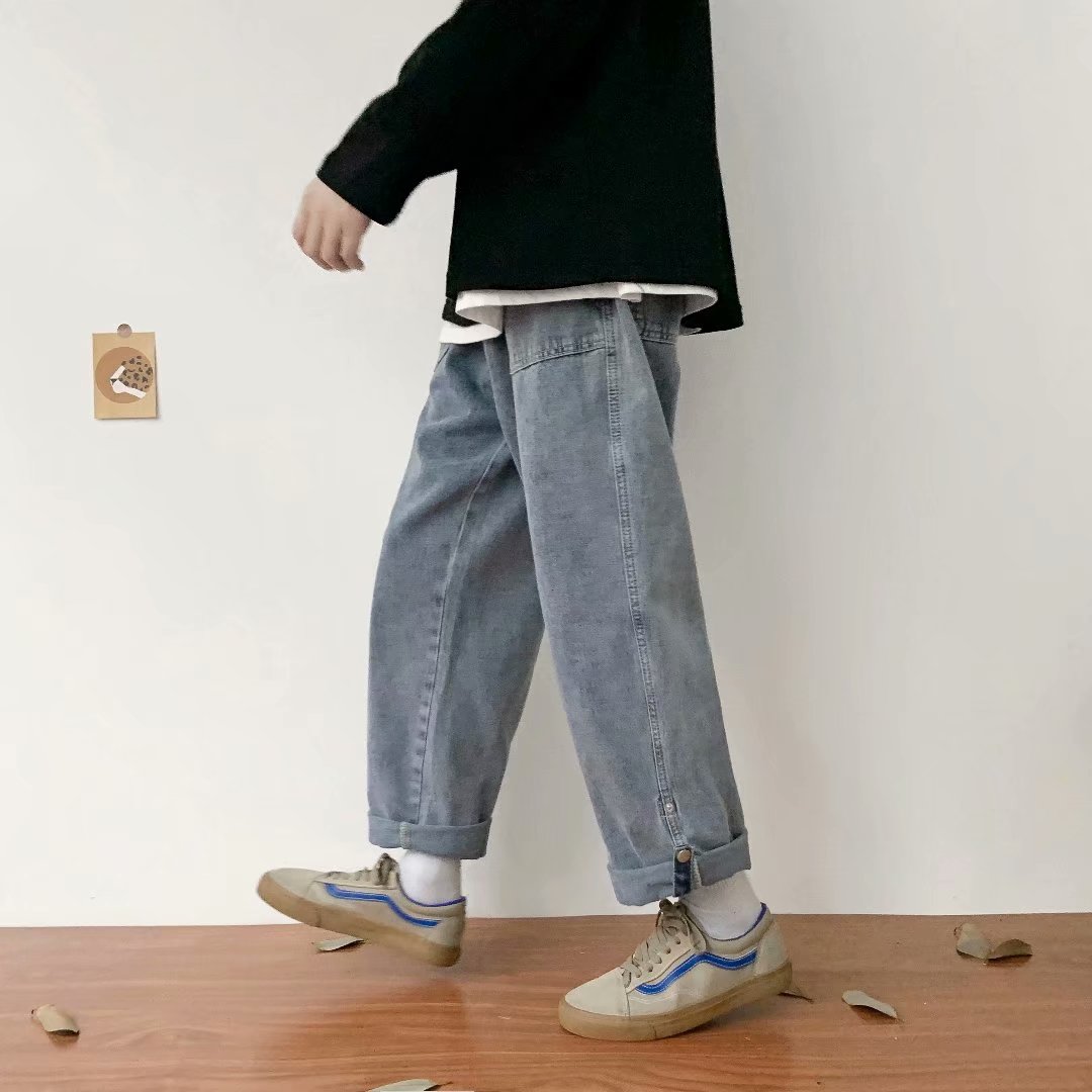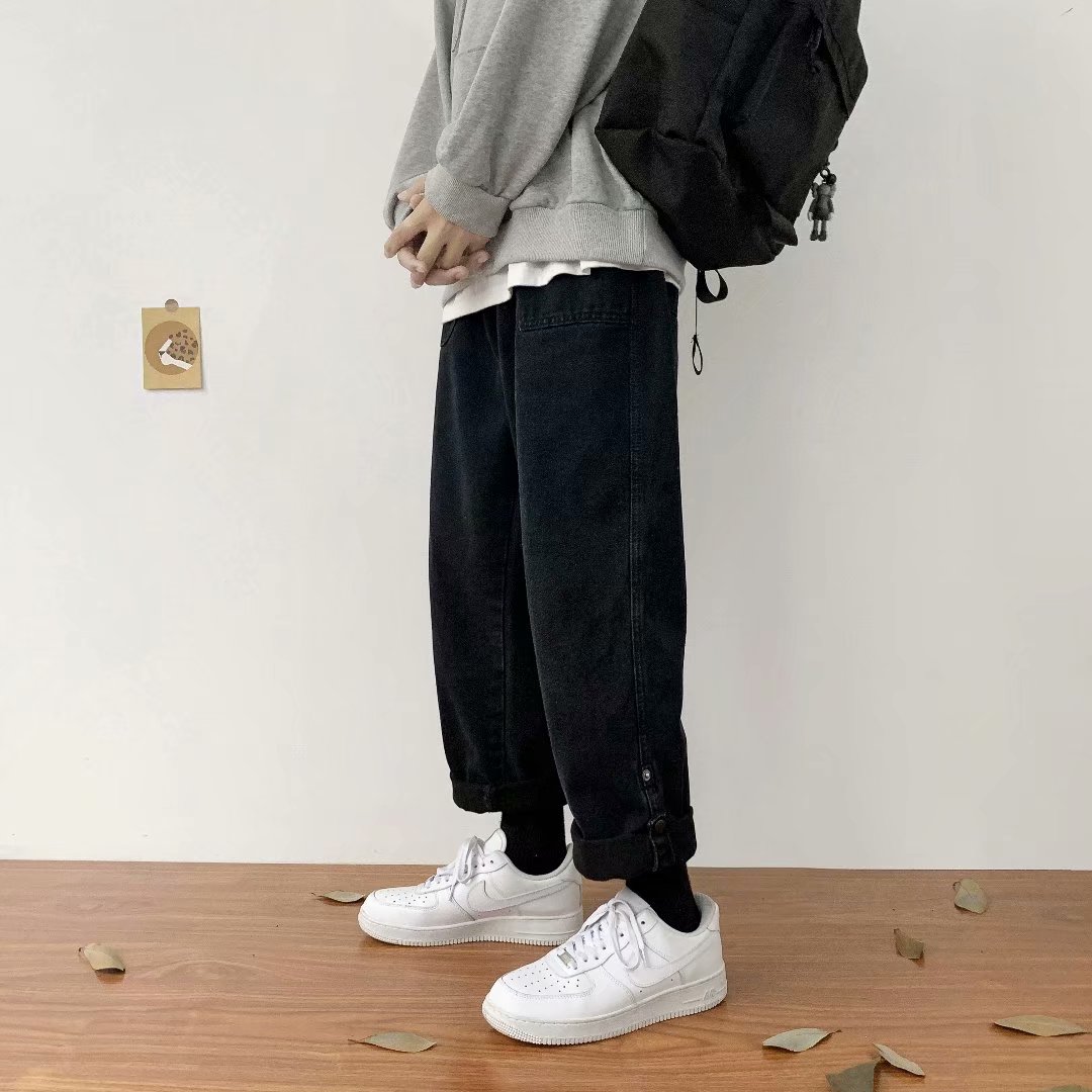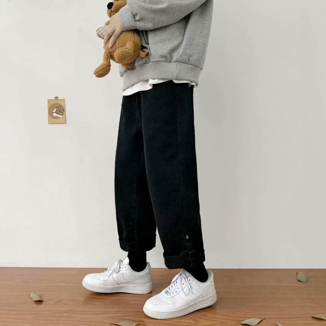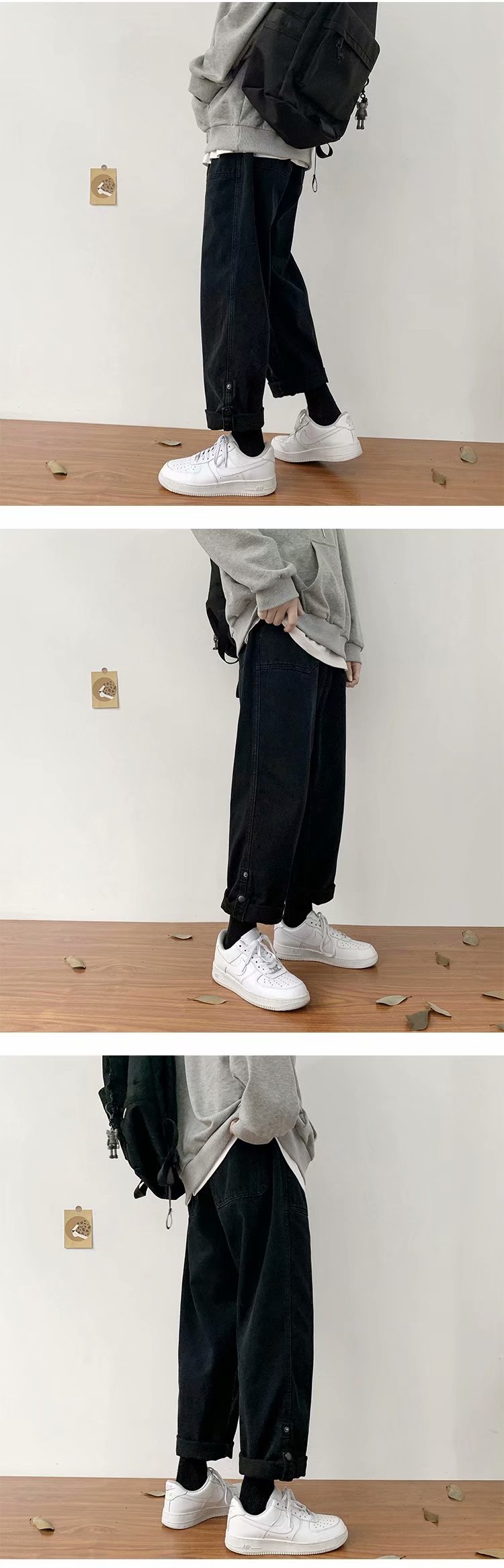 实拍 日系简约港风纯色百搭街头水洗牛仔裤男韩版休闲宽松九分裤