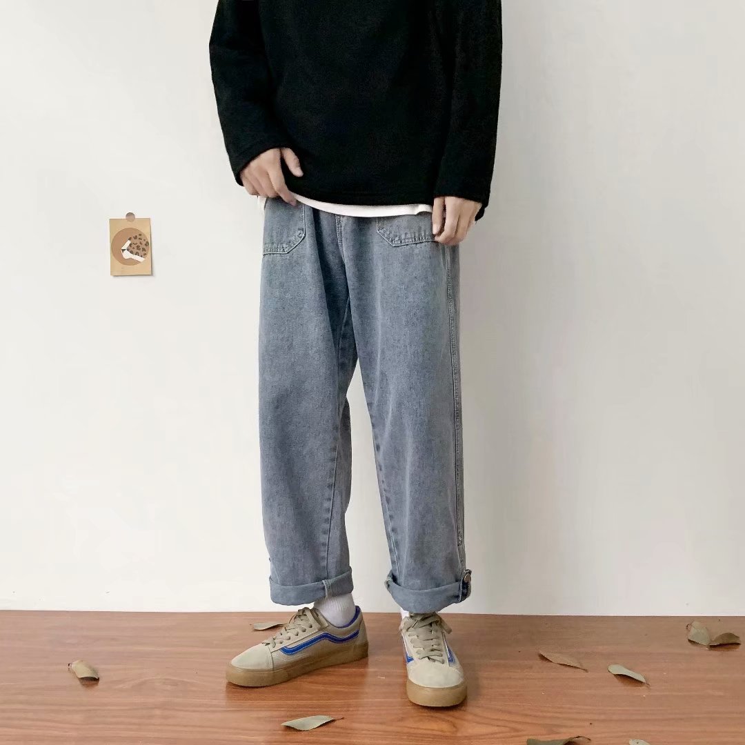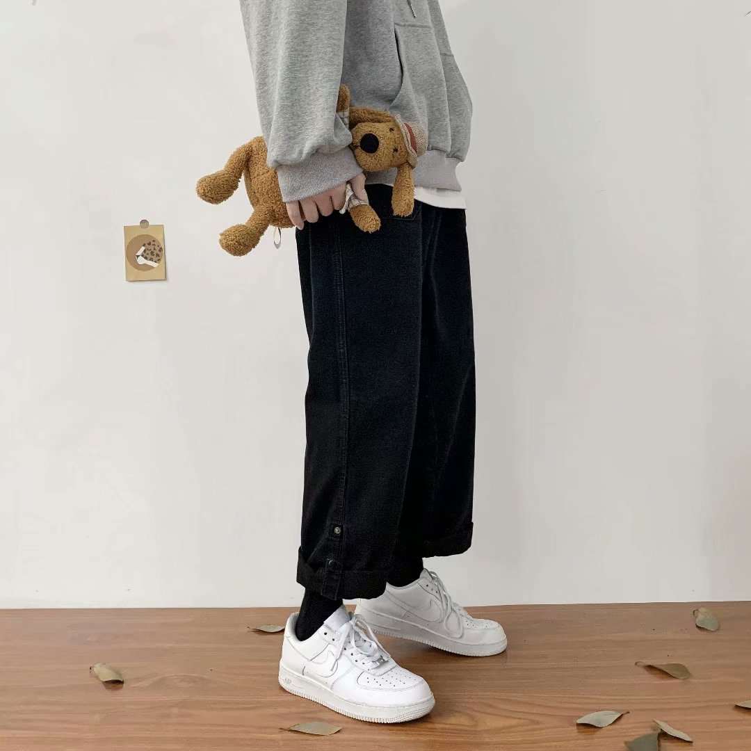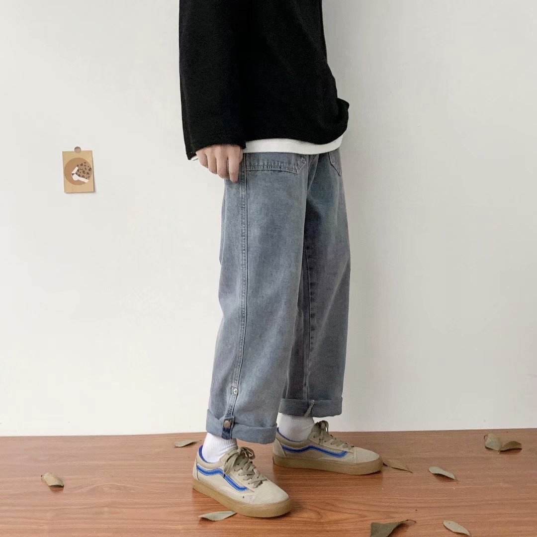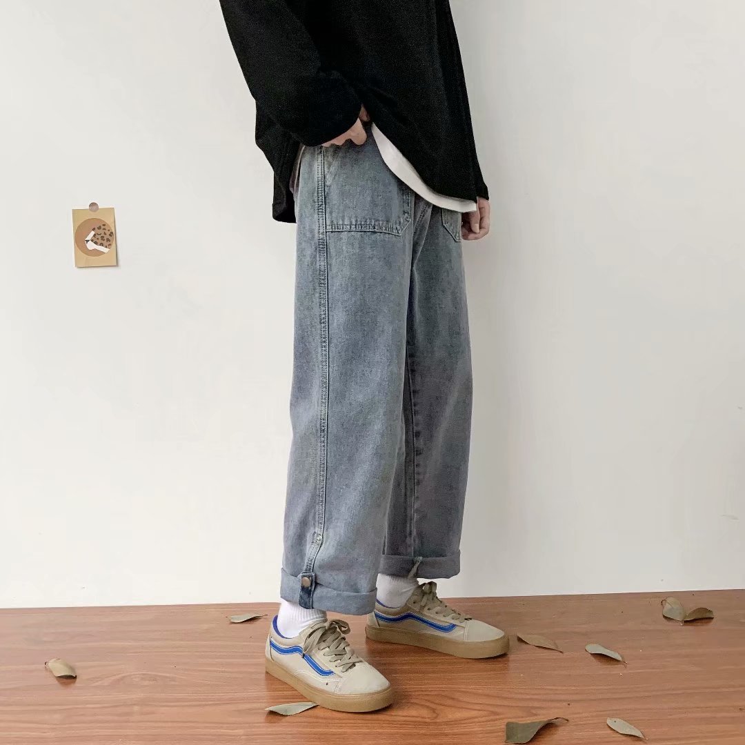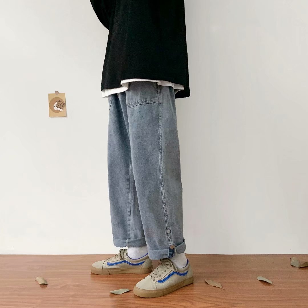实拍 日系简约港风纯色百搭街头水洗牛仔裤男韩版休闲宽松九分裤