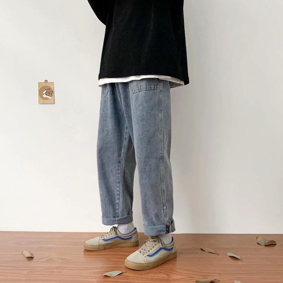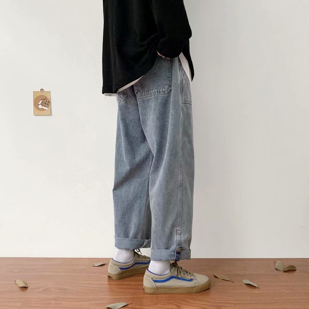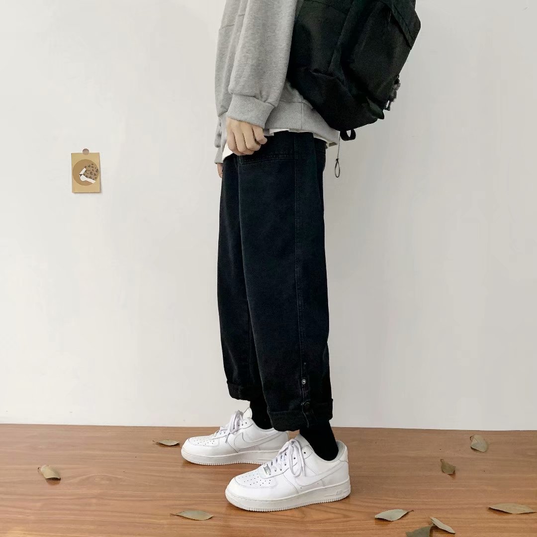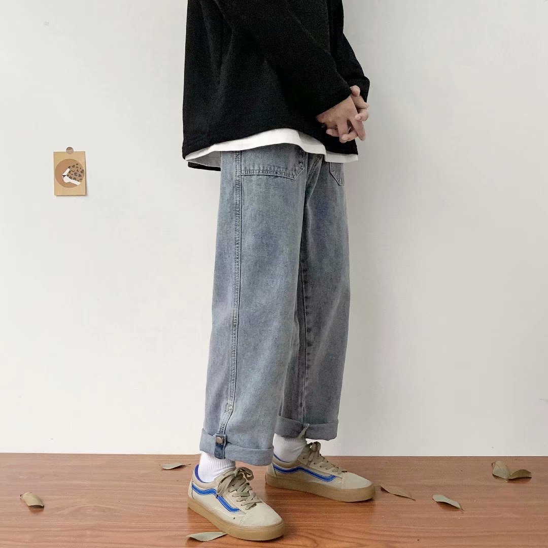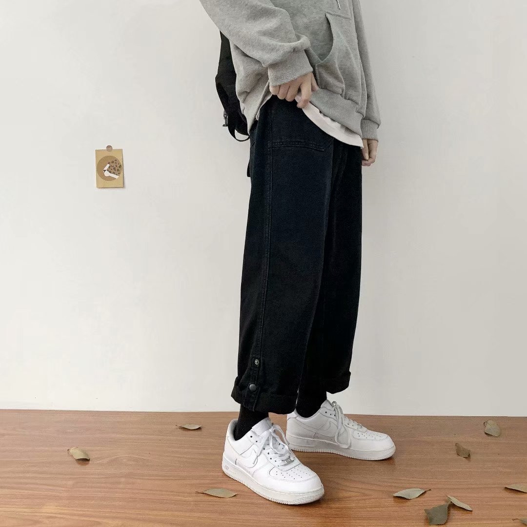 实拍 日系简约港风纯色百搭街头水洗牛仔裤男韩版休闲宽松九分裤