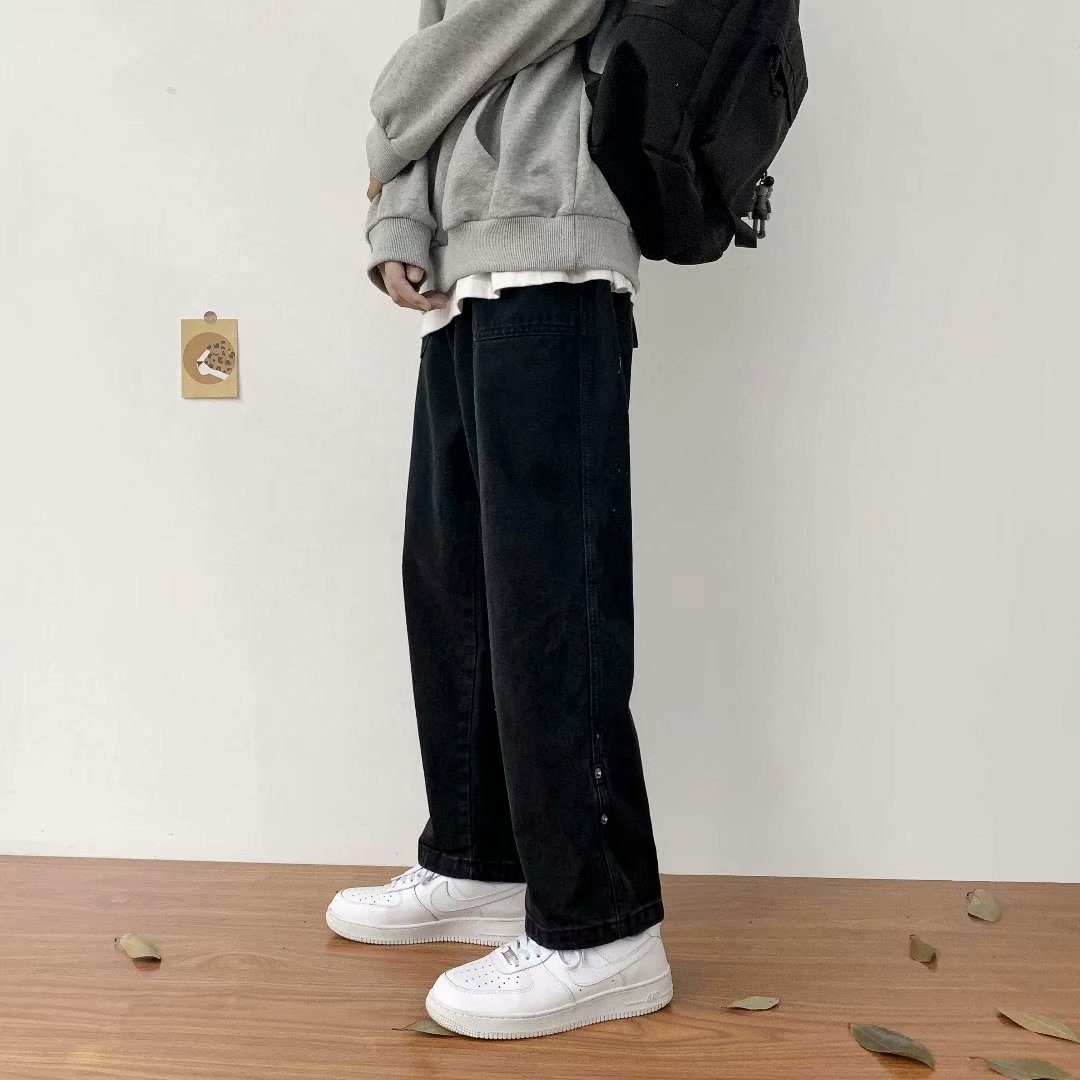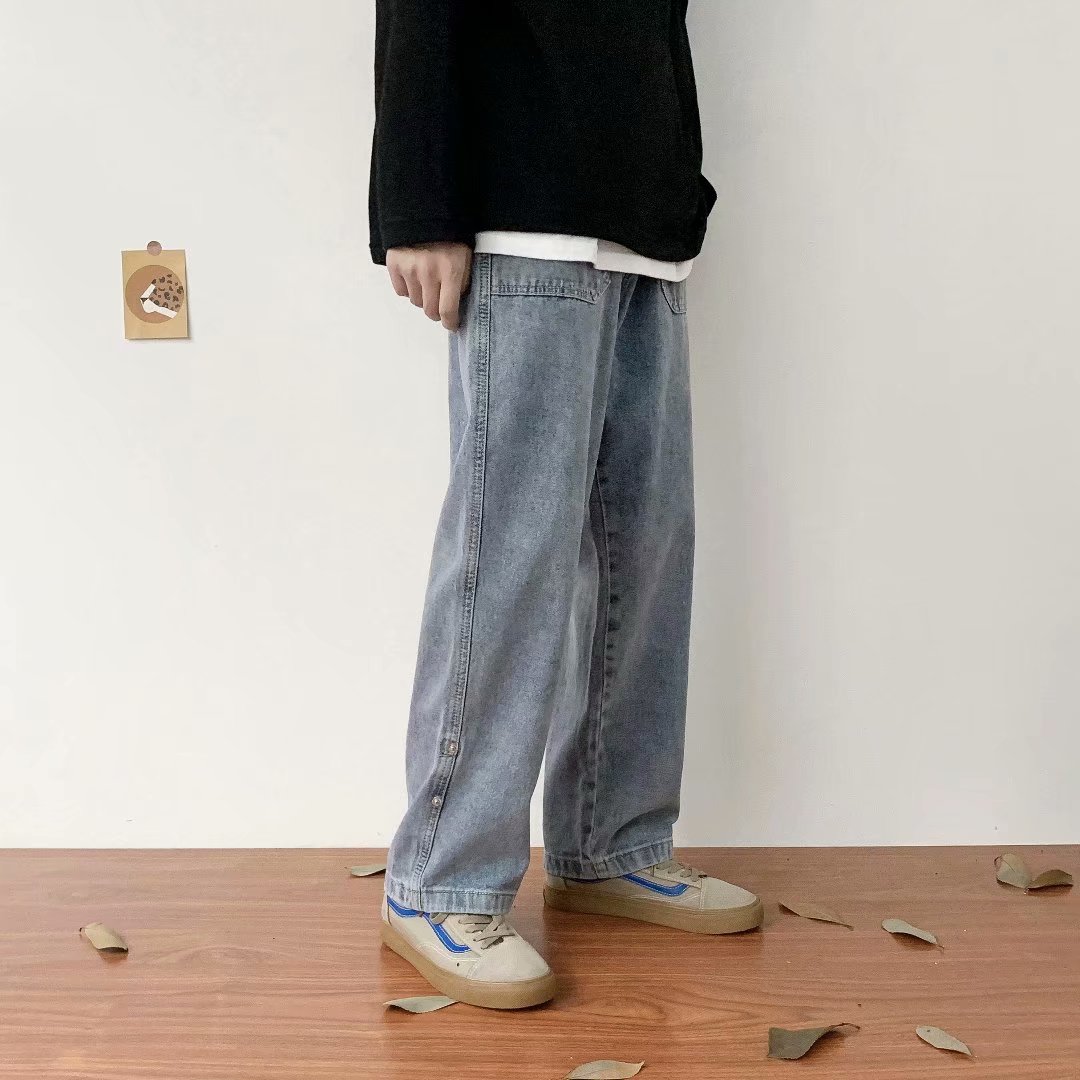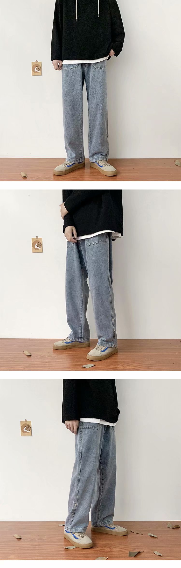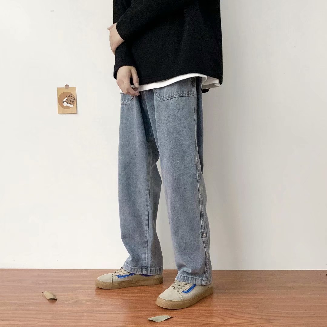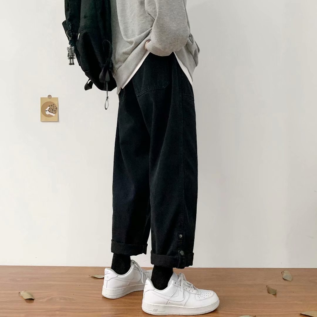 实拍 日系简约港风纯色百搭街头水洗牛仔裤男韩版休闲宽松九分裤