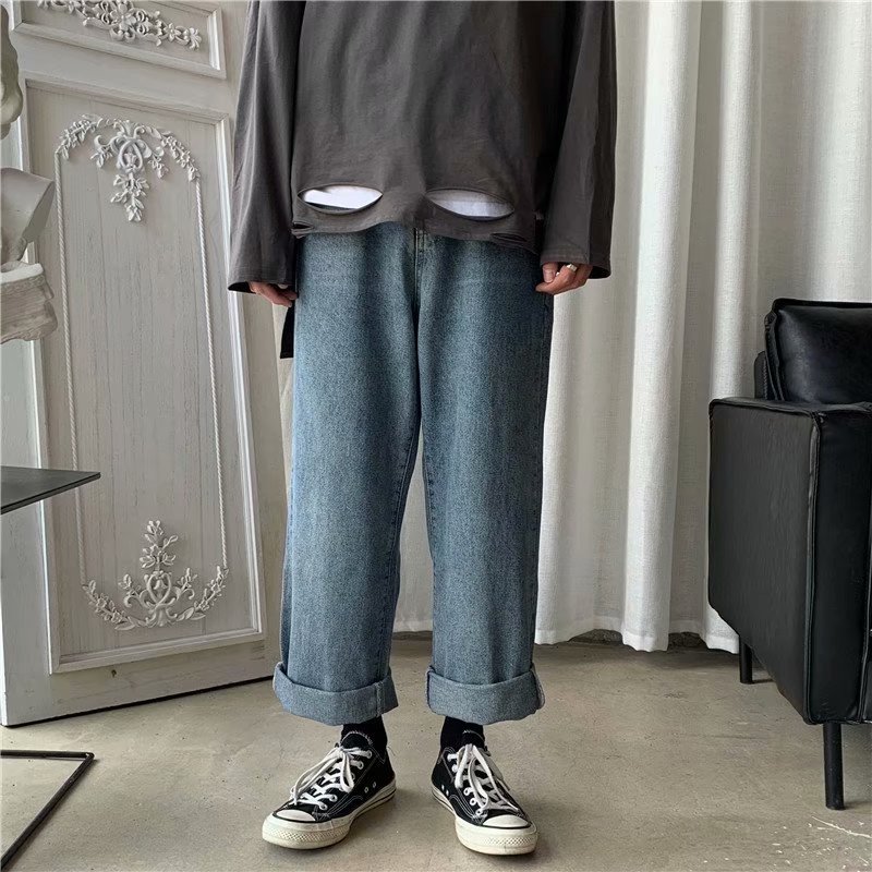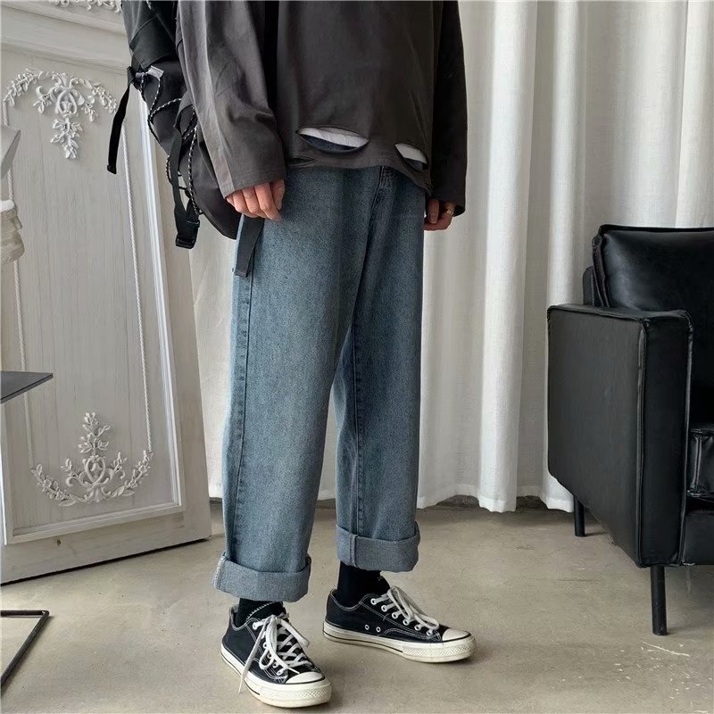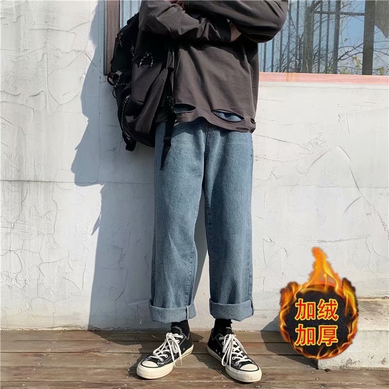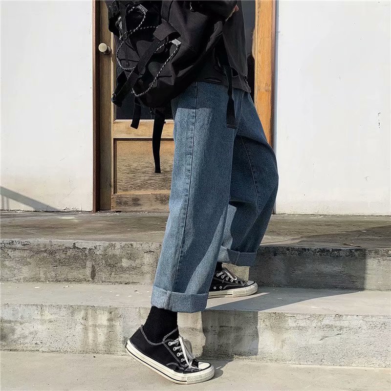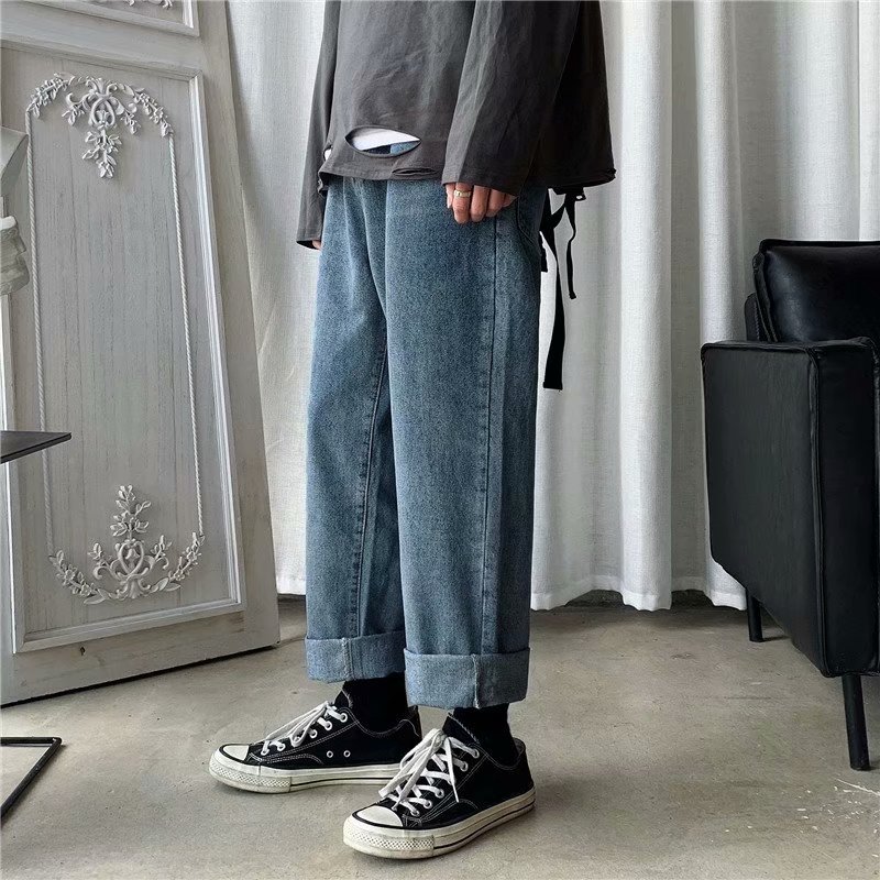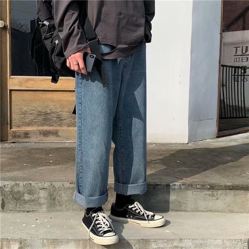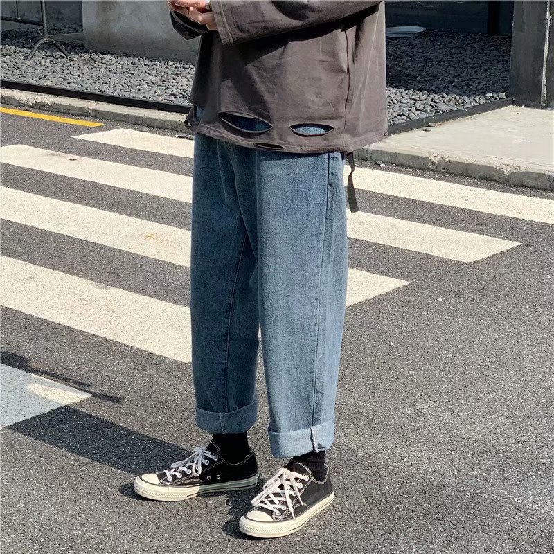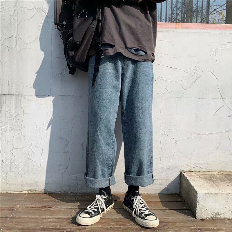 实拍 日系港风纯色百搭街头简约水洗牛仔九分裤男韩版休闲直筒裤