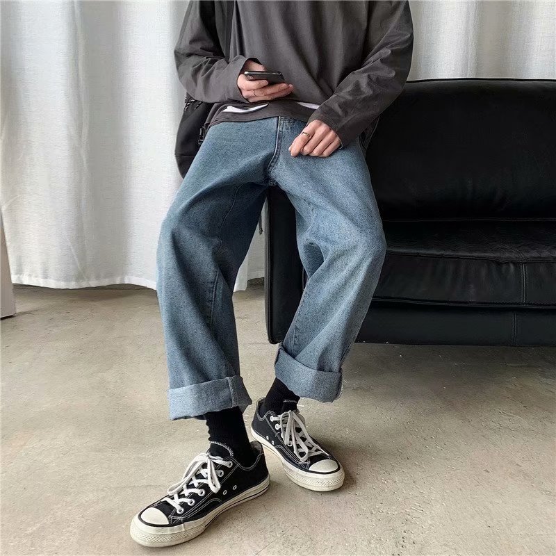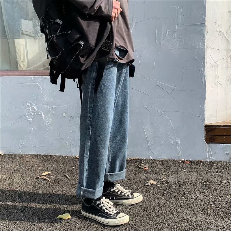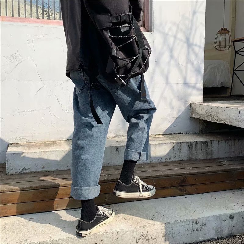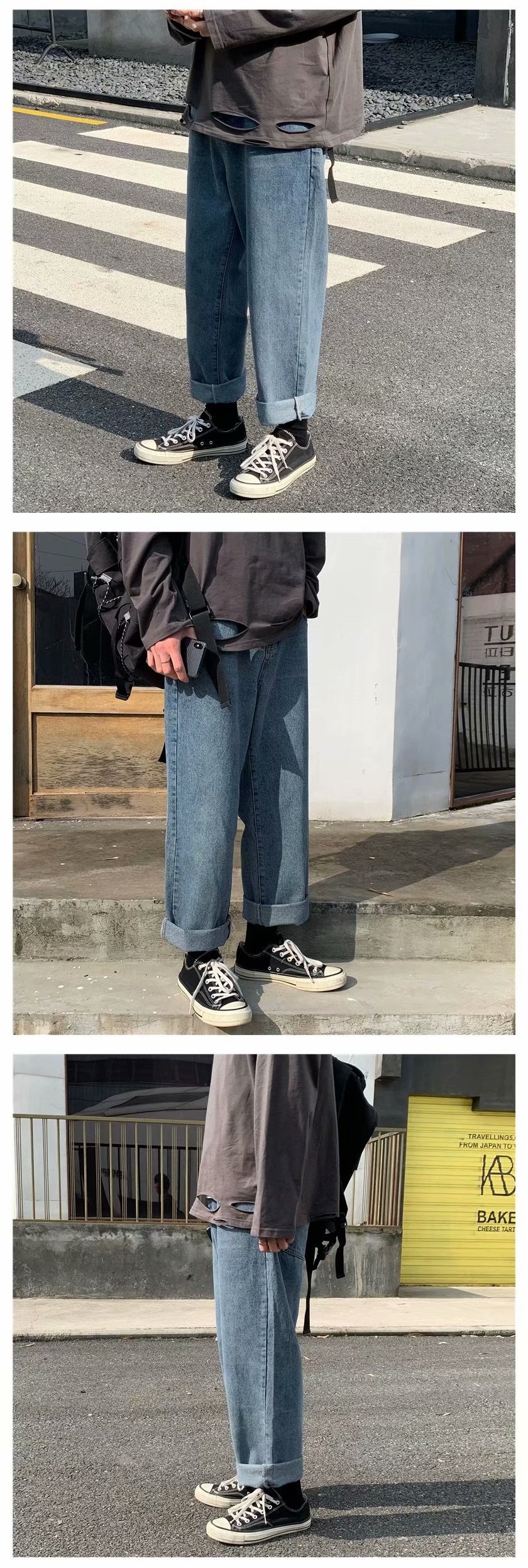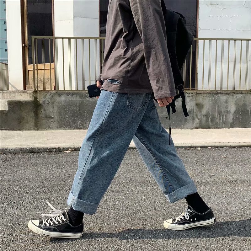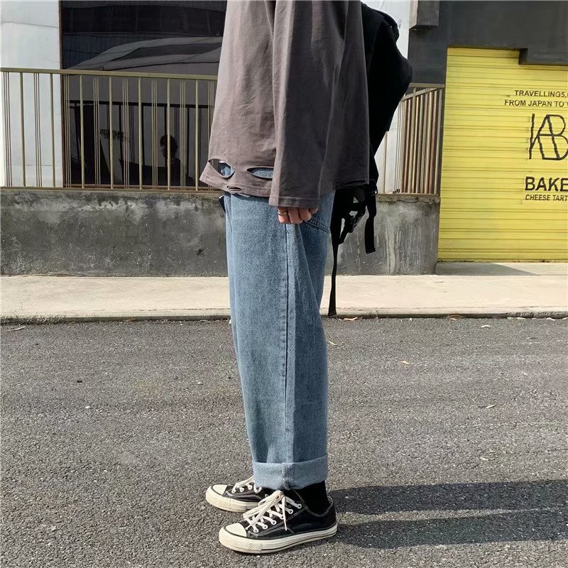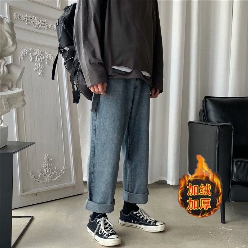 实拍 日系港风纯色百搭街头简约水洗牛仔九分裤男韩版休闲直筒裤
