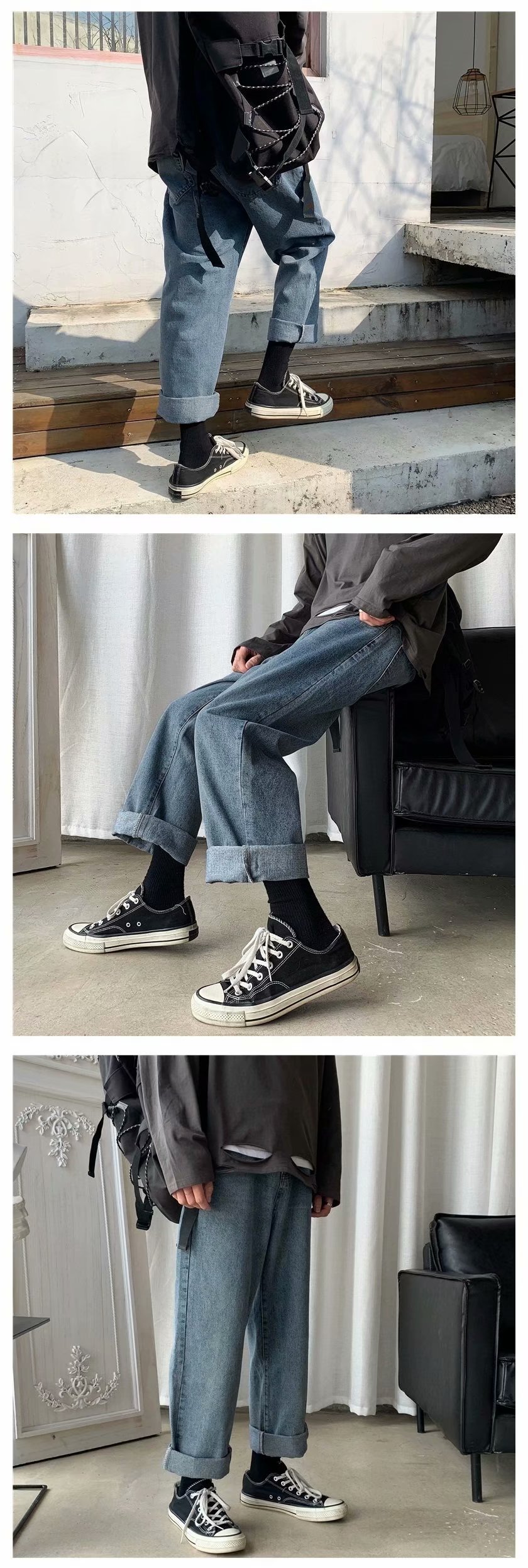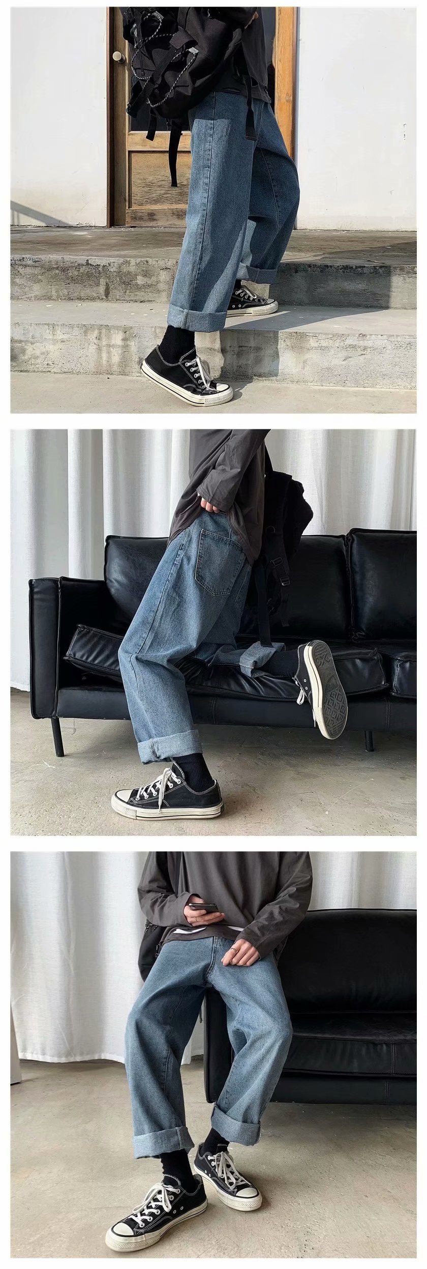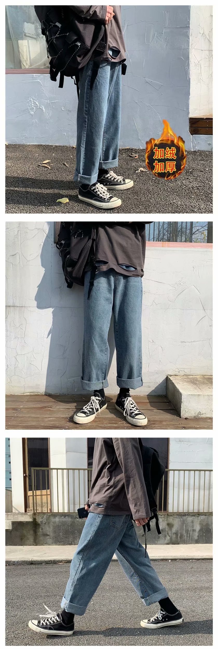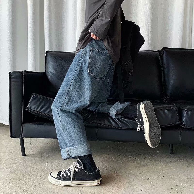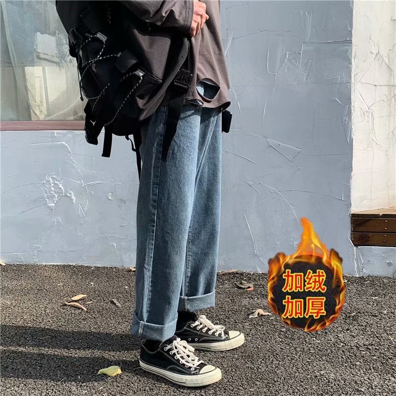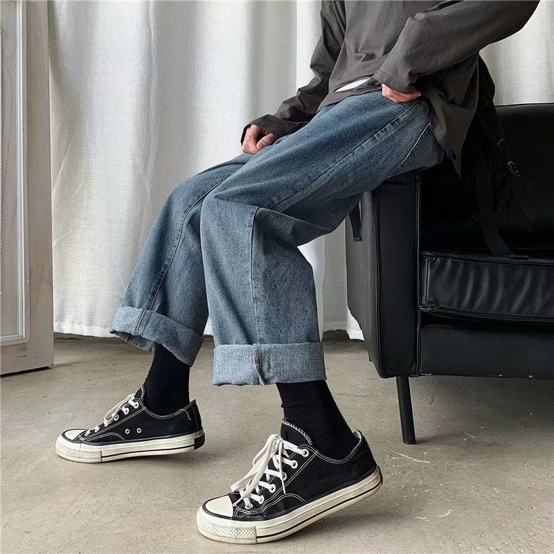实拍 日系港风纯色百搭街头简约水洗牛仔九分裤男韩版休闲直筒裤