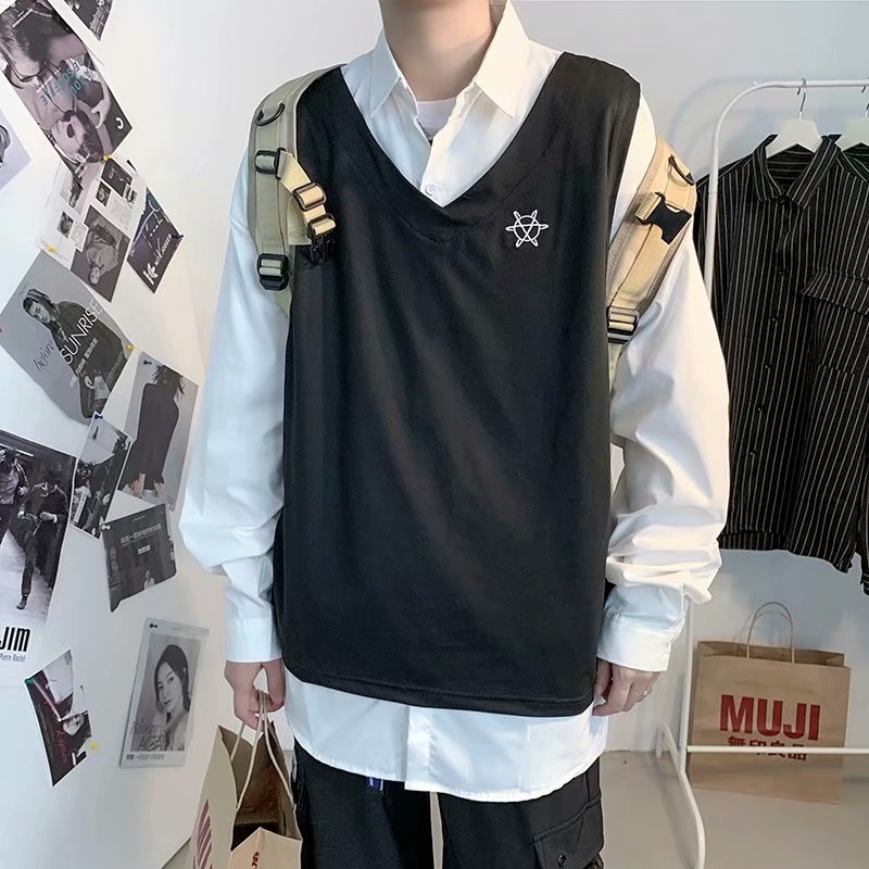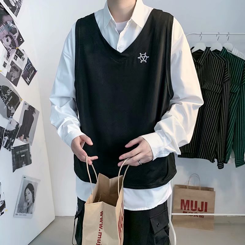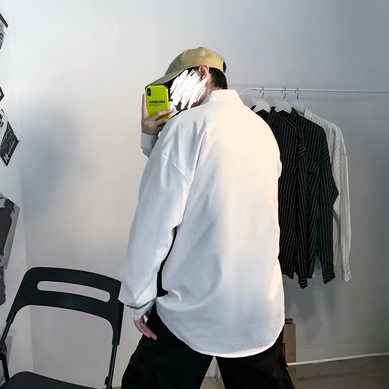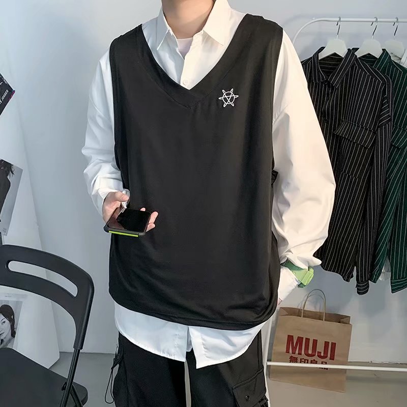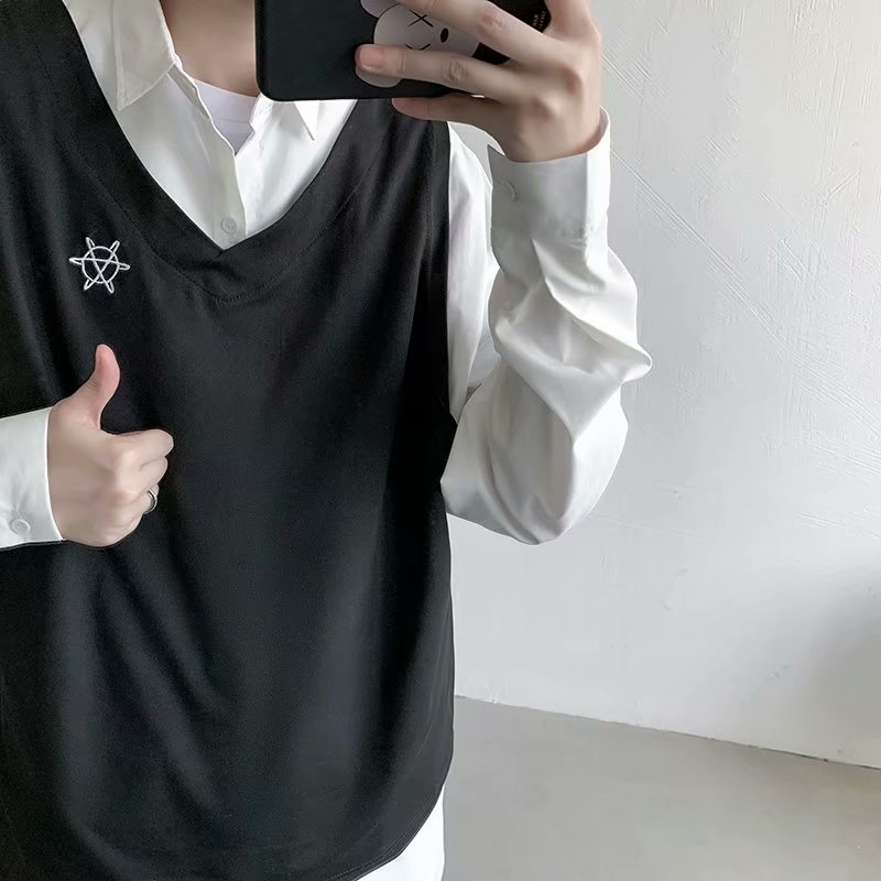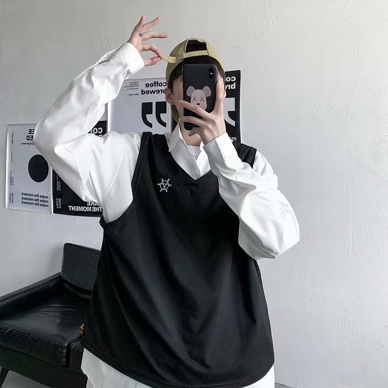 实拍秋季长袖衬衫男韩版潮流帅气假两件衬衣服打底衫港风日系宽松