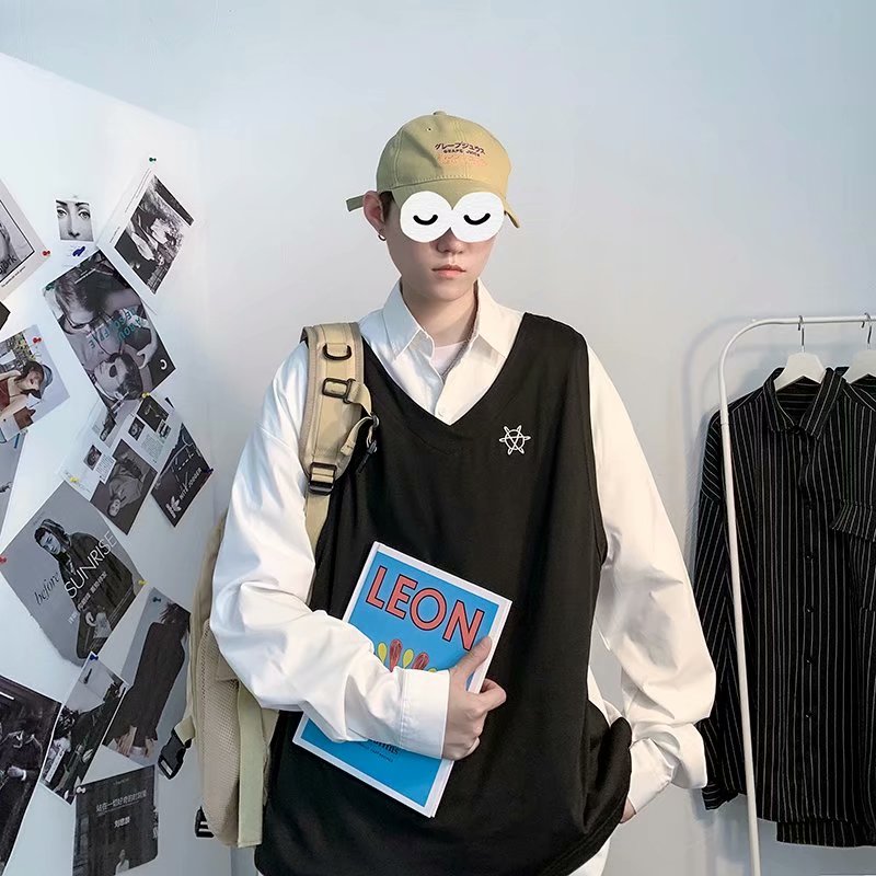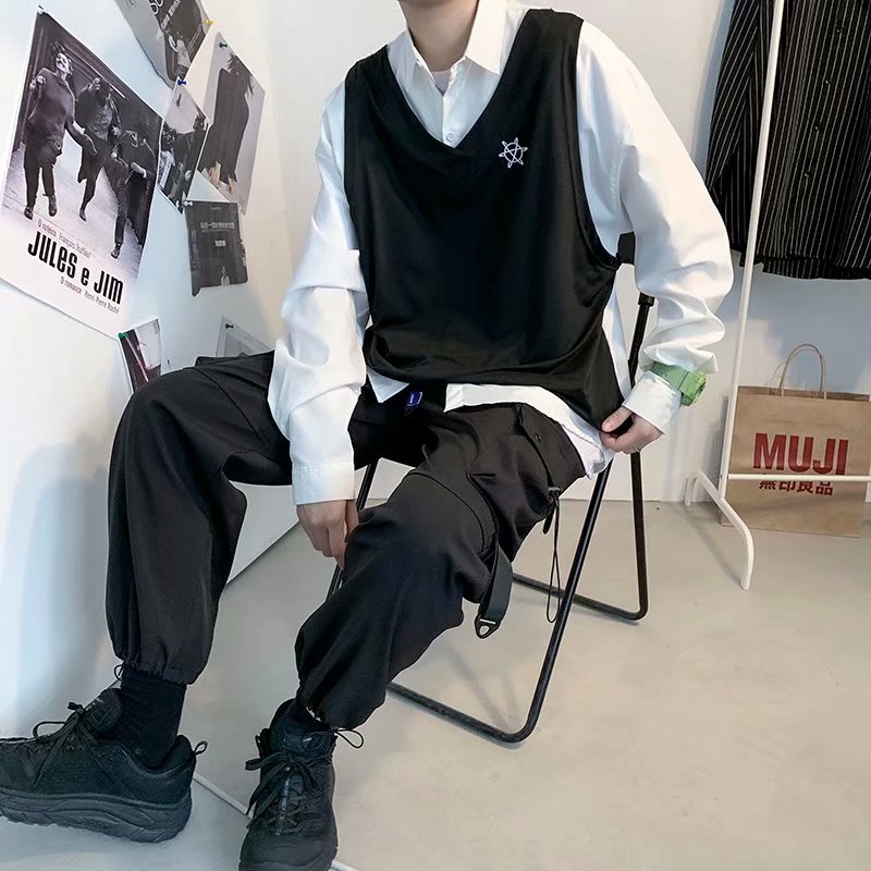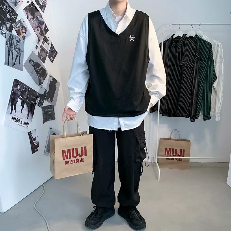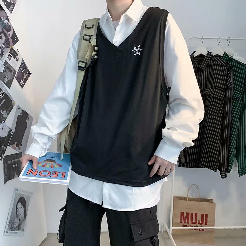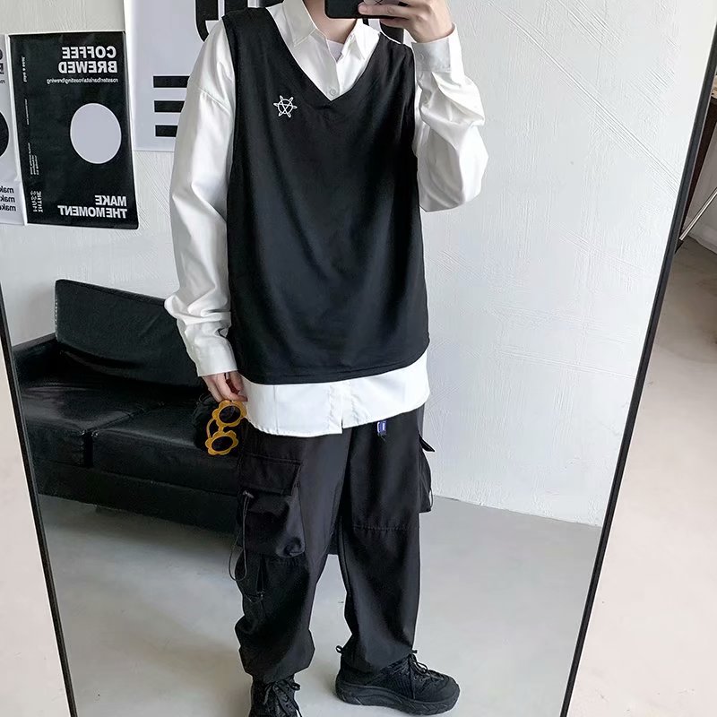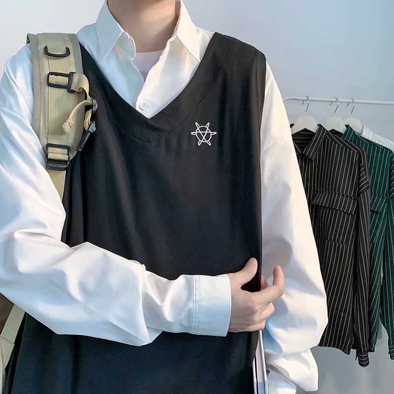 实拍秋季长袖衬衫男韩版潮流帅气假两件衬衣服打底衫港风日系宽松