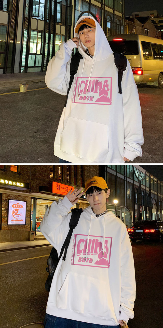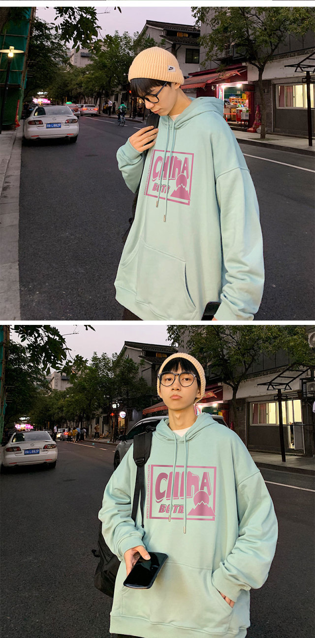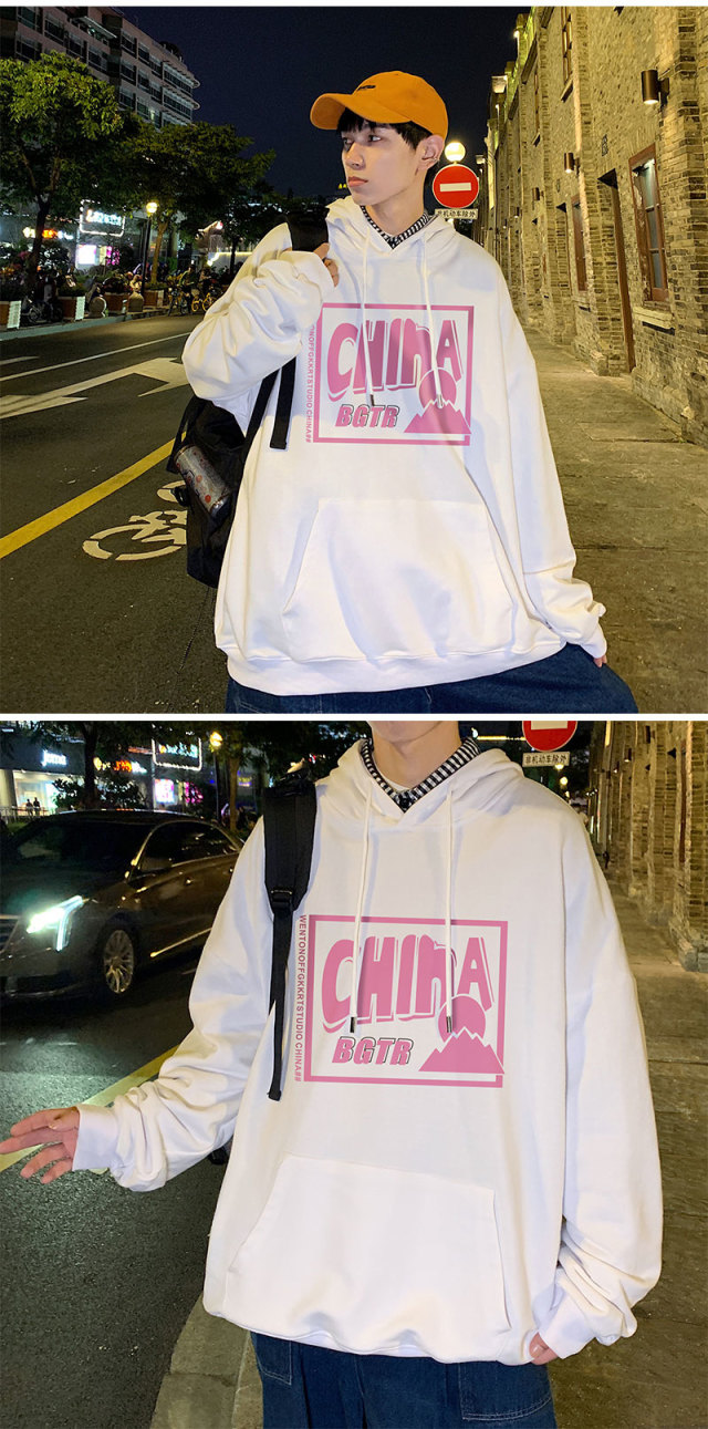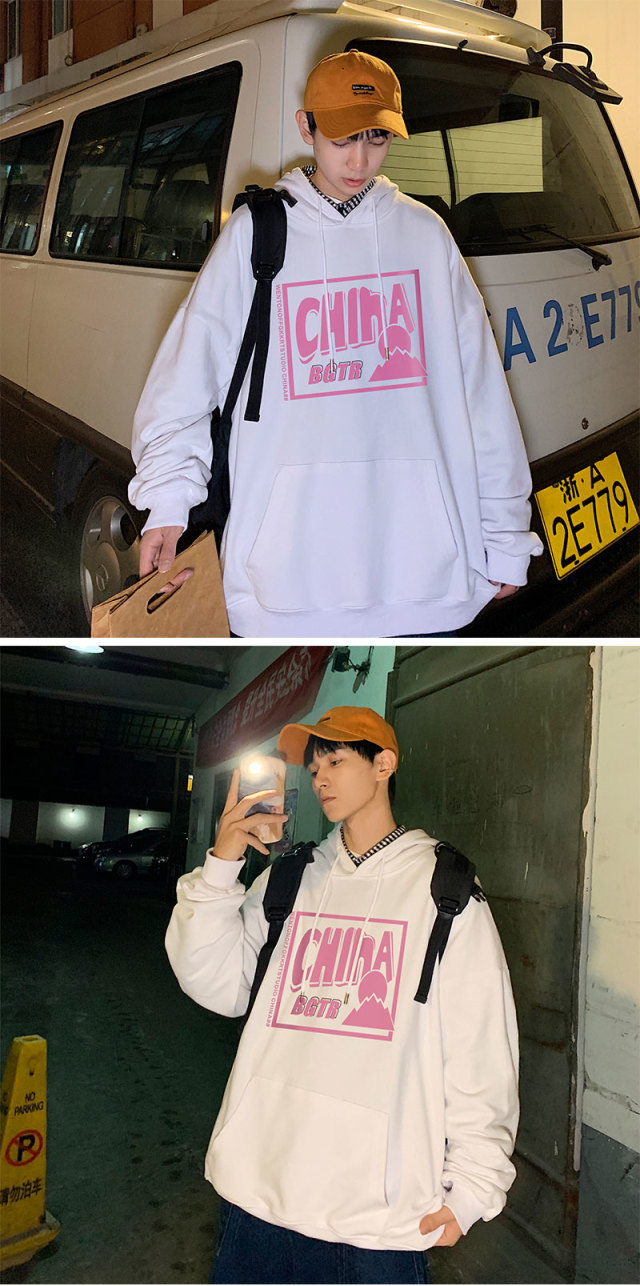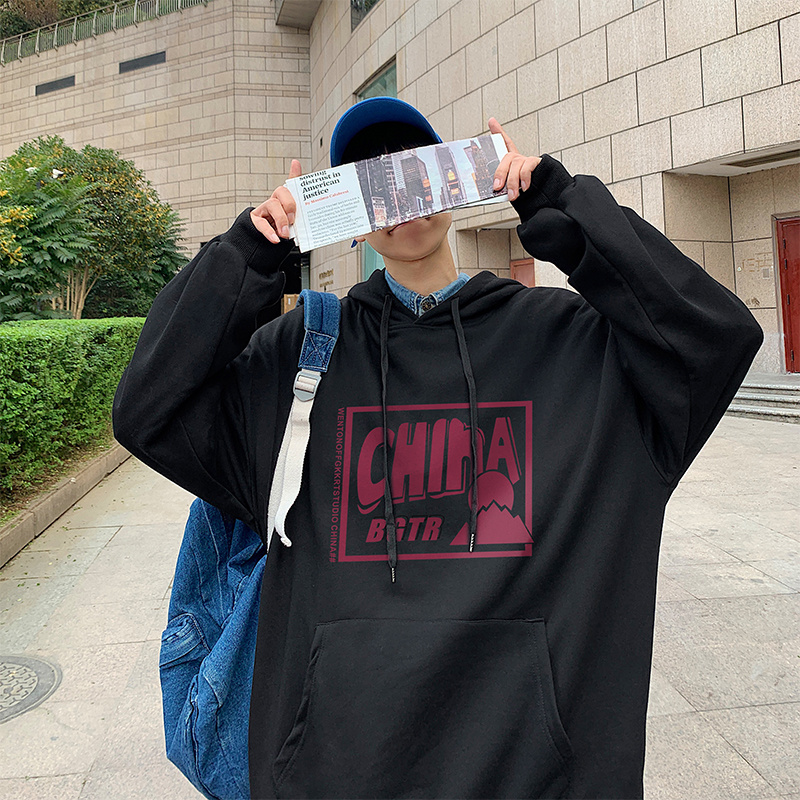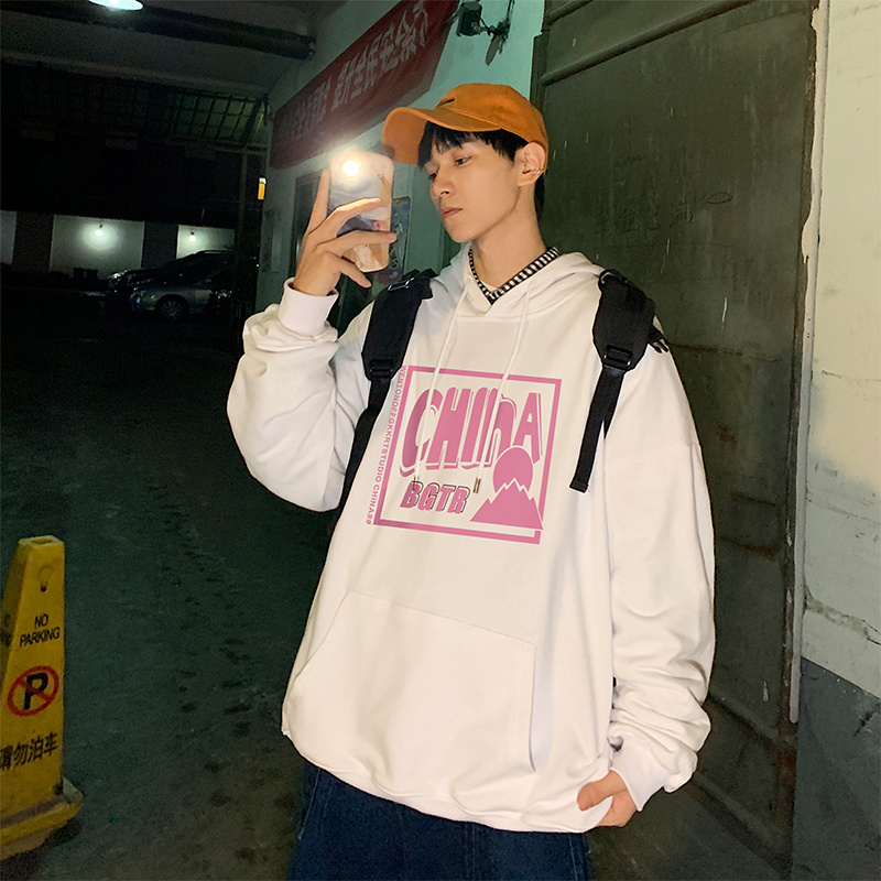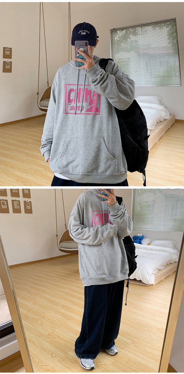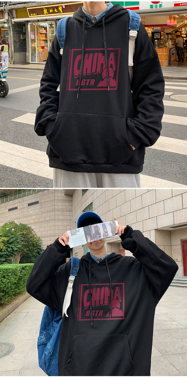 实拍 港风百搭潮流印花宽松连帽上衣男韩版日系休闲简约卫衣