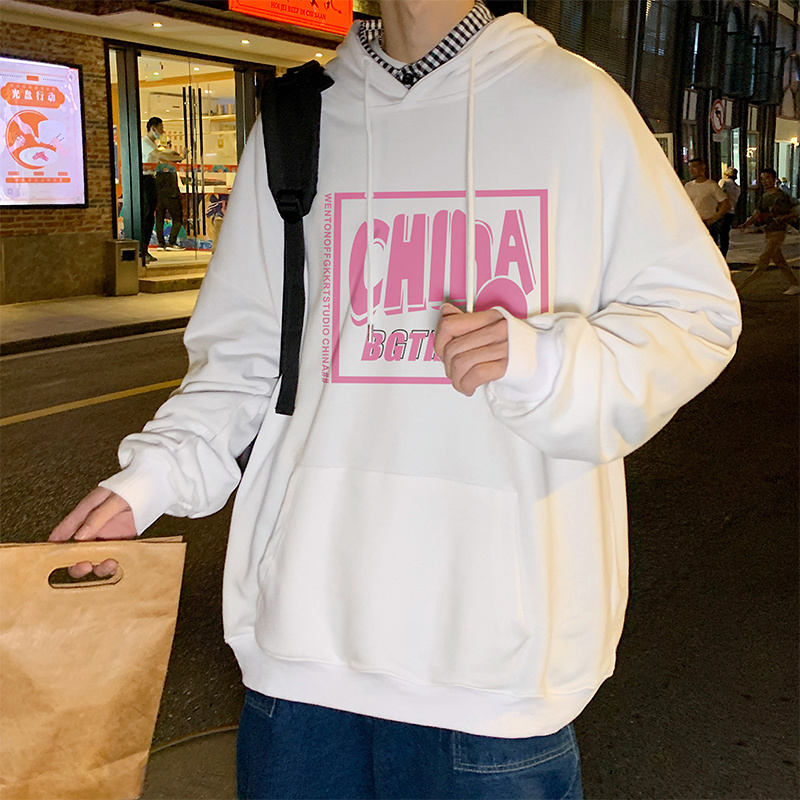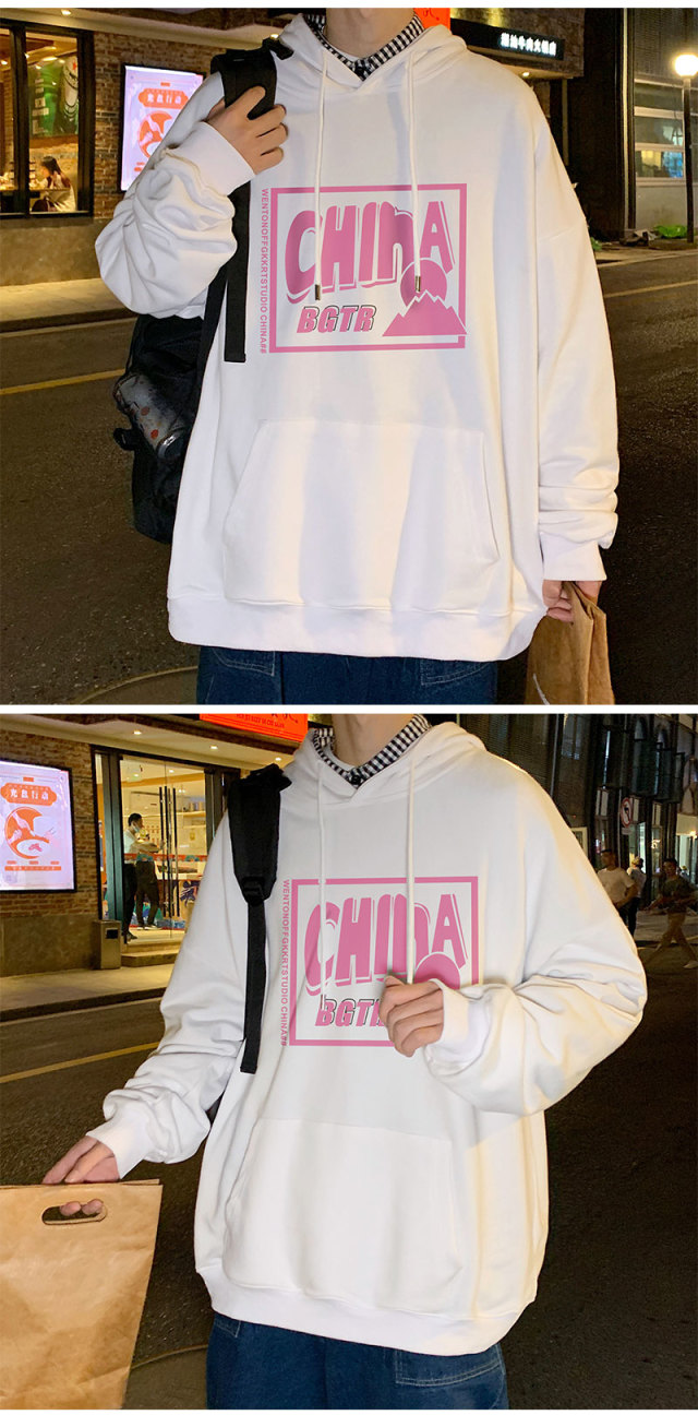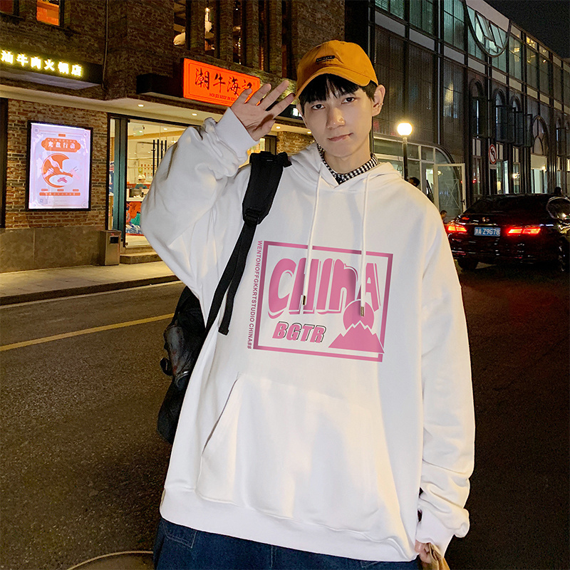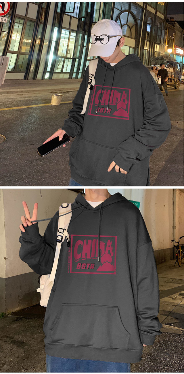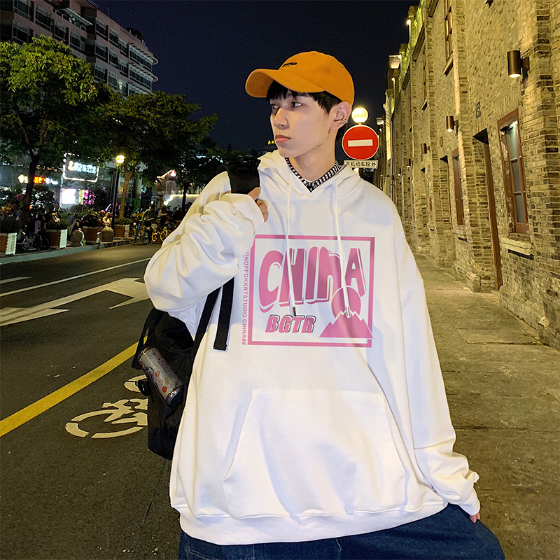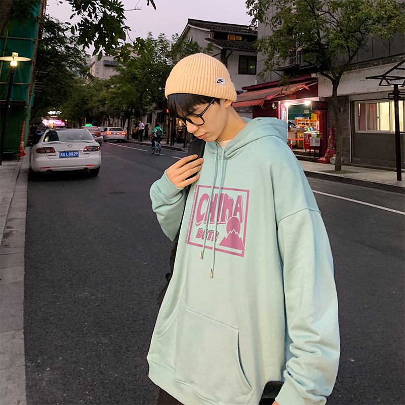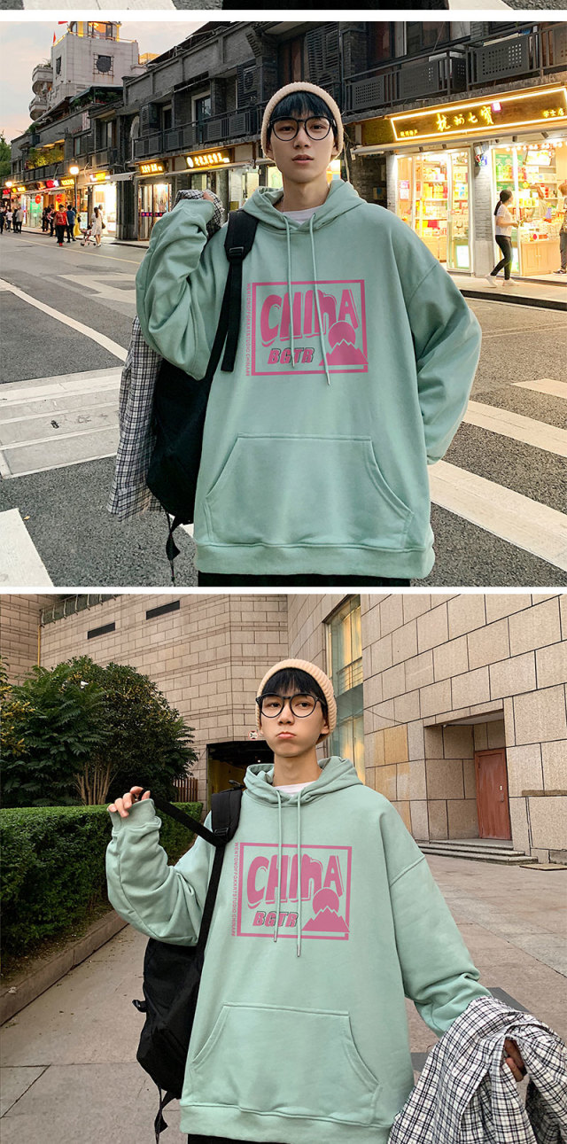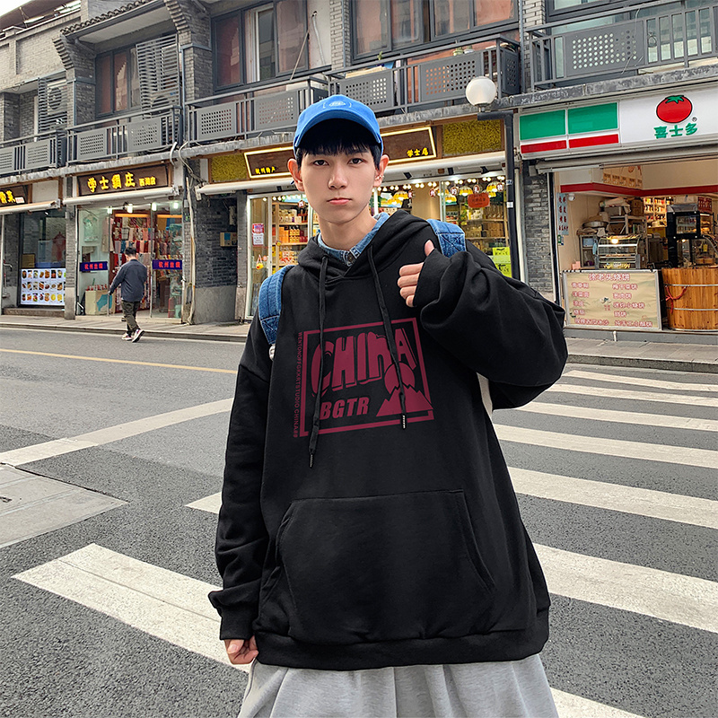 实拍 港风百搭潮流印花宽松连帽上衣男韩版日系休闲简约卫衣