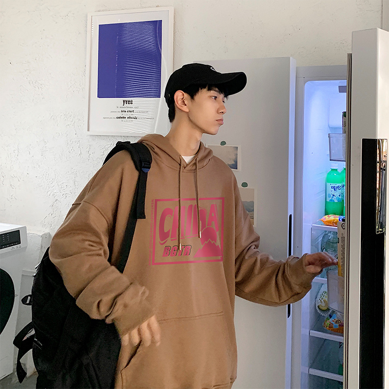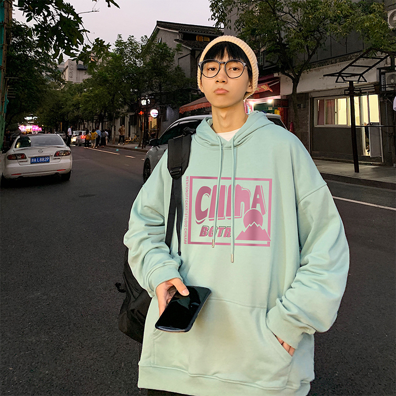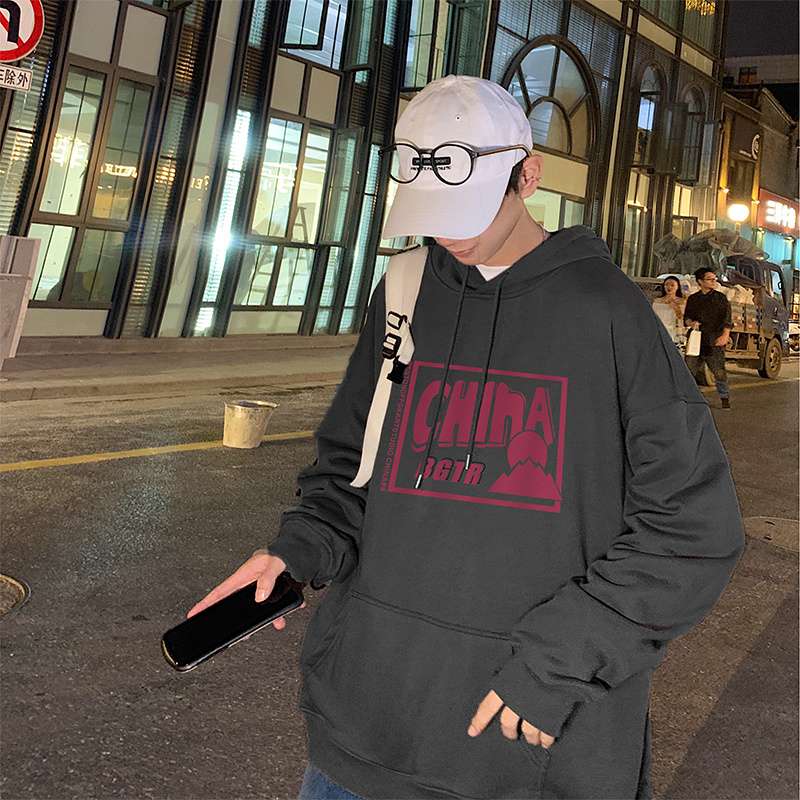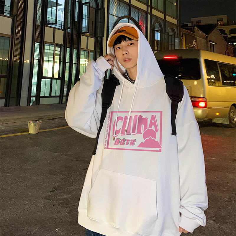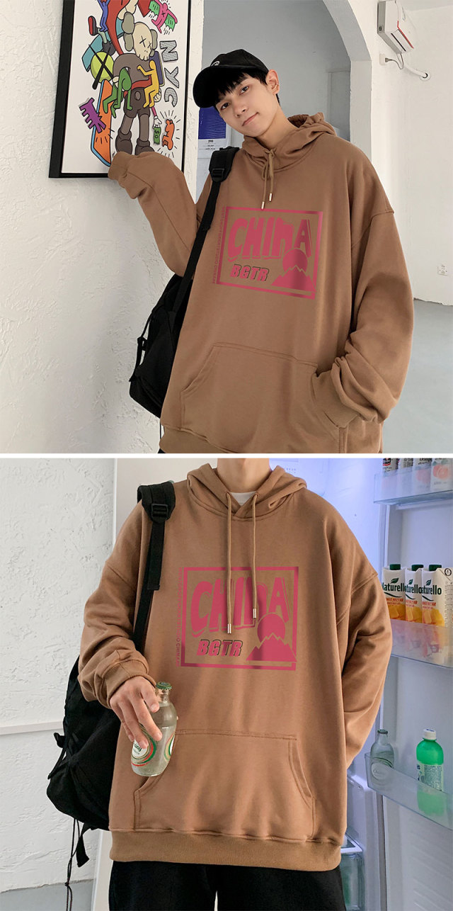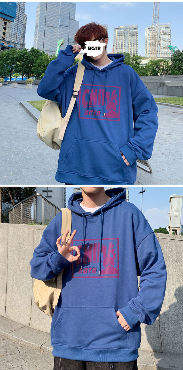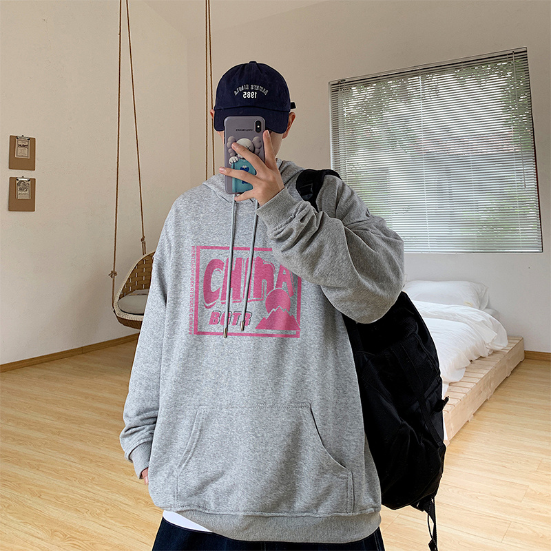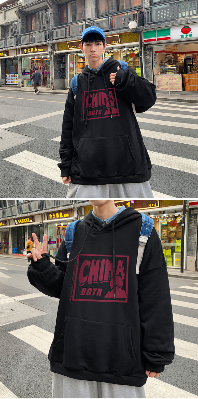 实拍 港风百搭潮流印花宽松连帽上衣男韩版日系休闲简约卫衣