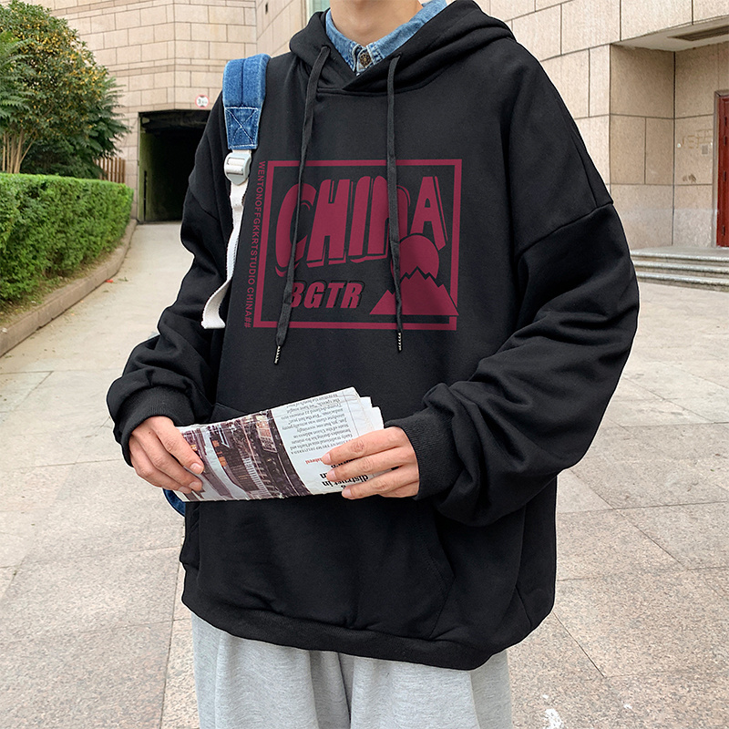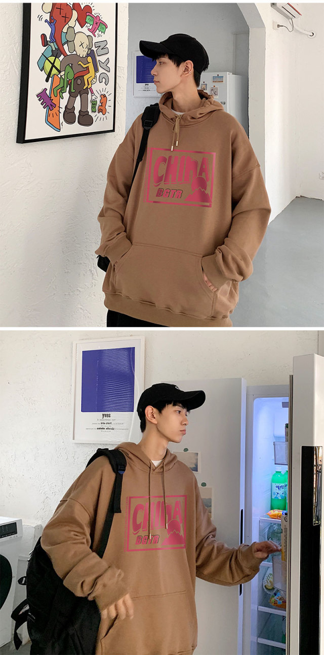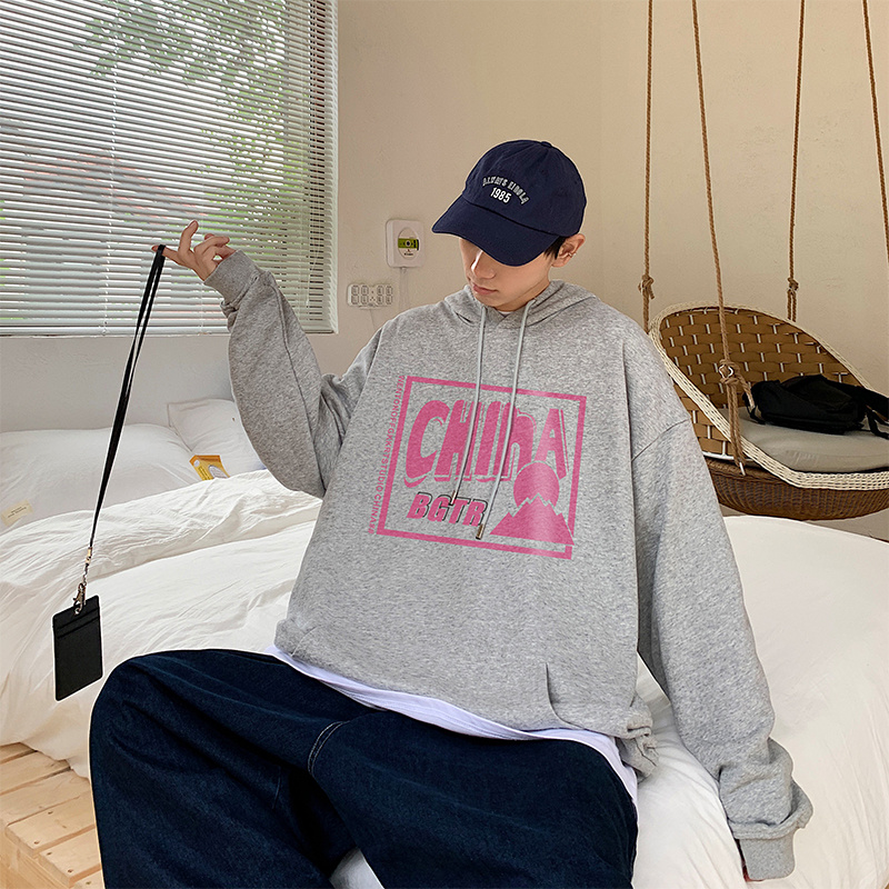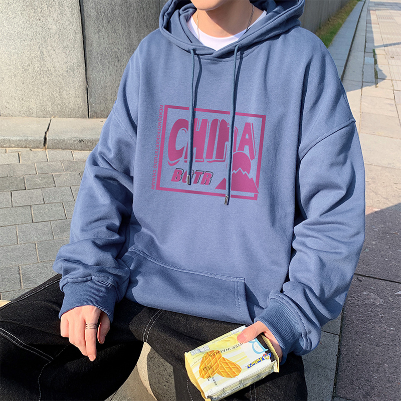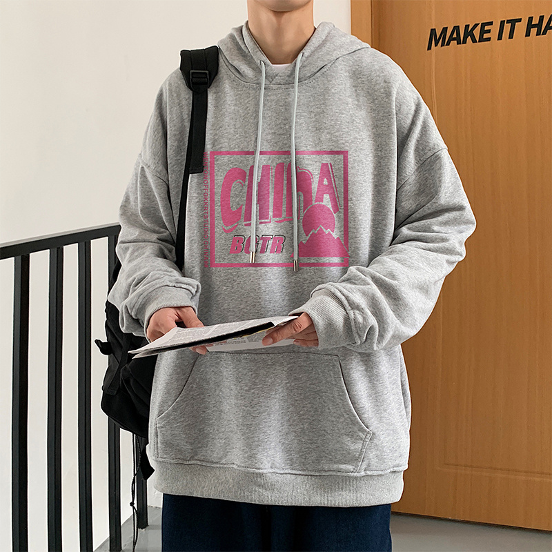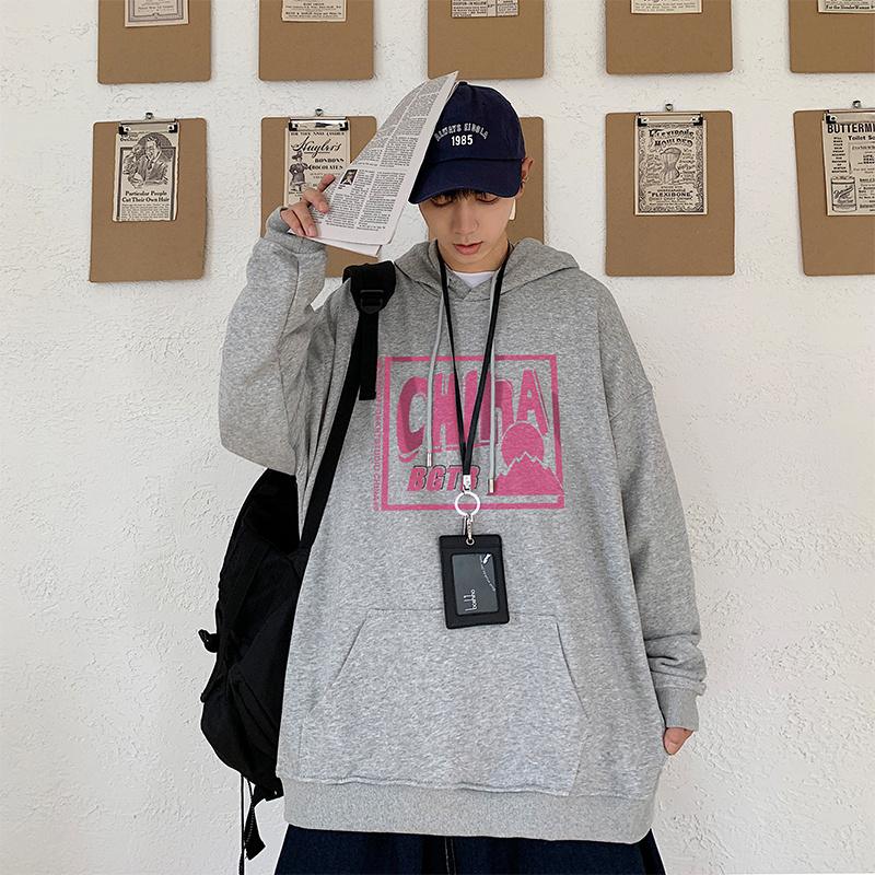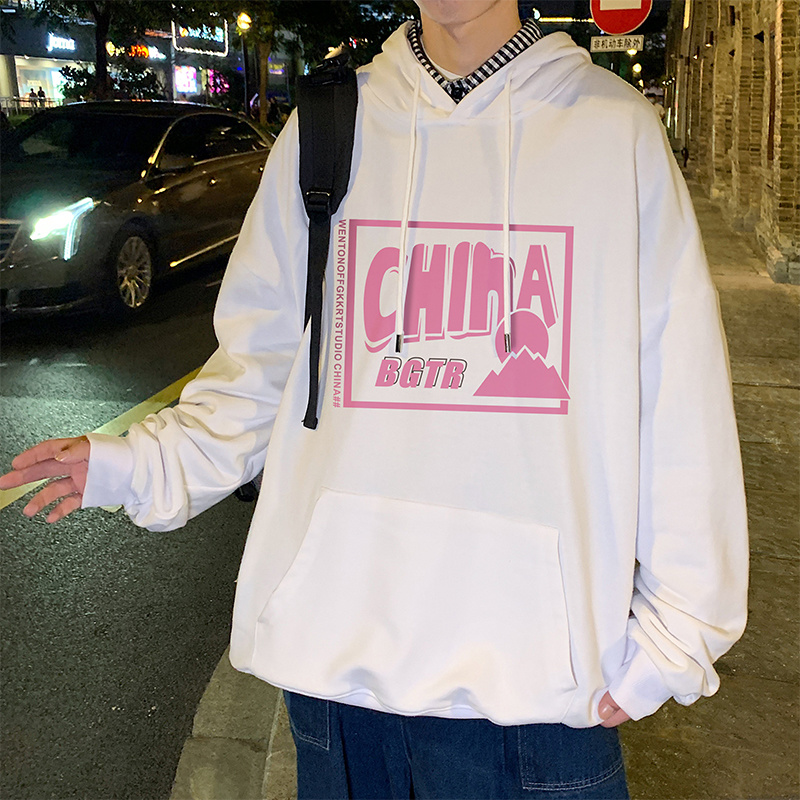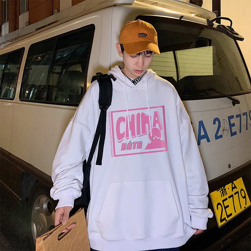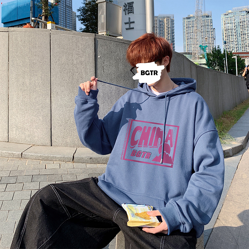 实拍 港风百搭潮流印花宽松连帽上衣男韩版日系休闲简约卫衣