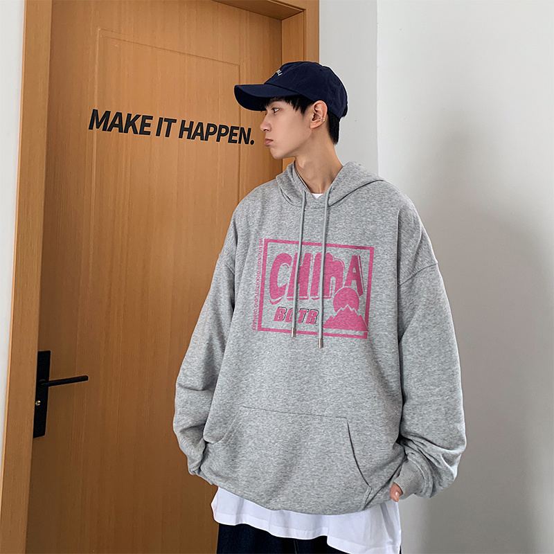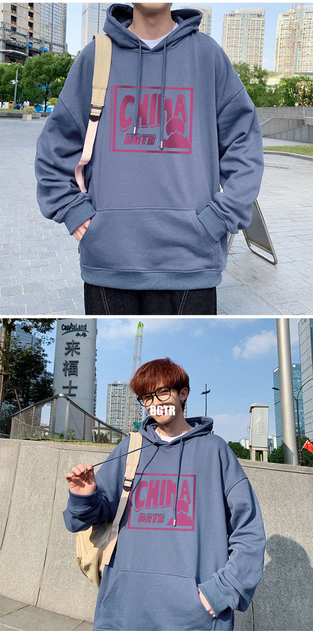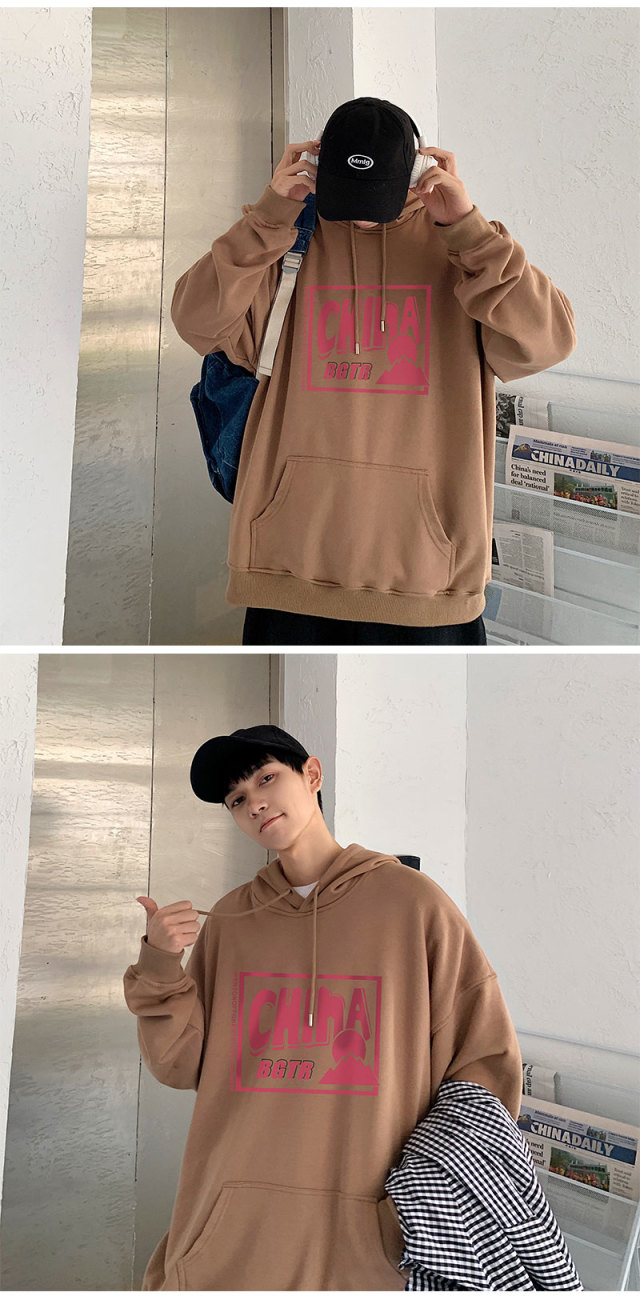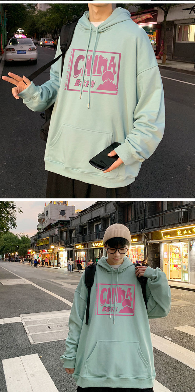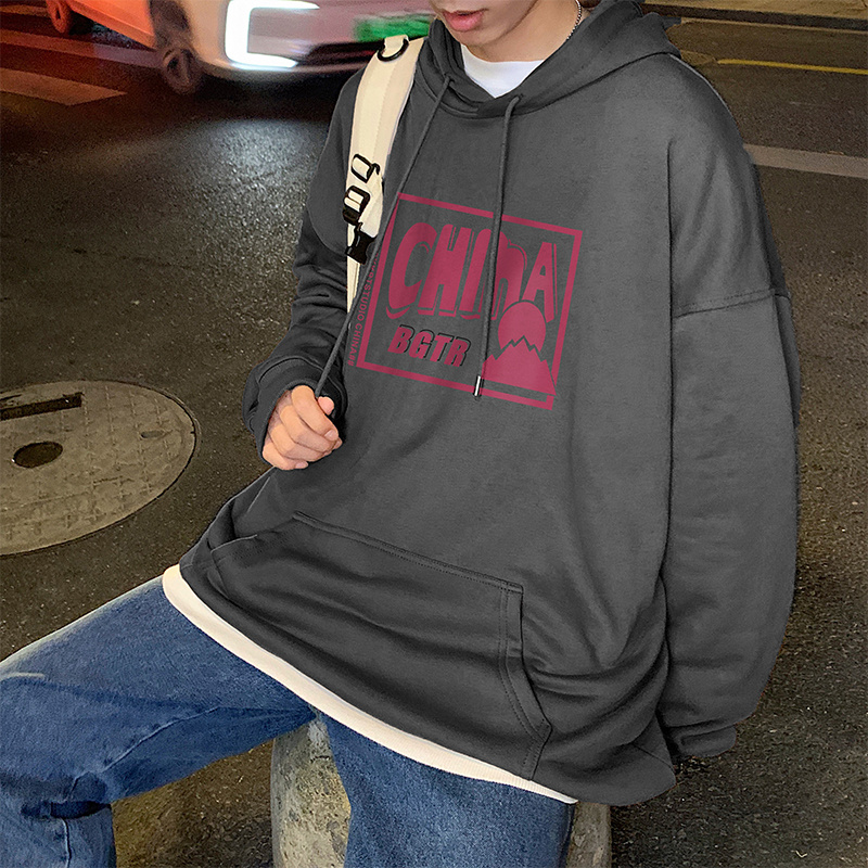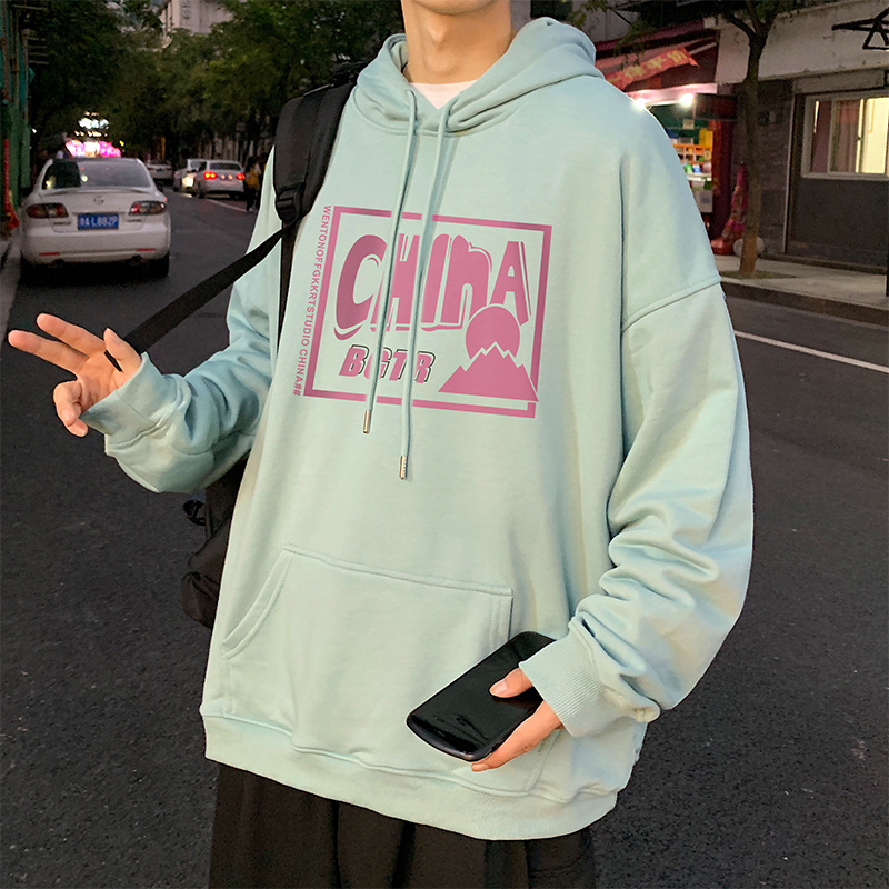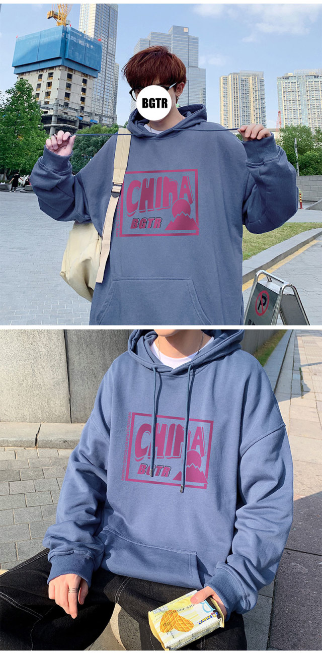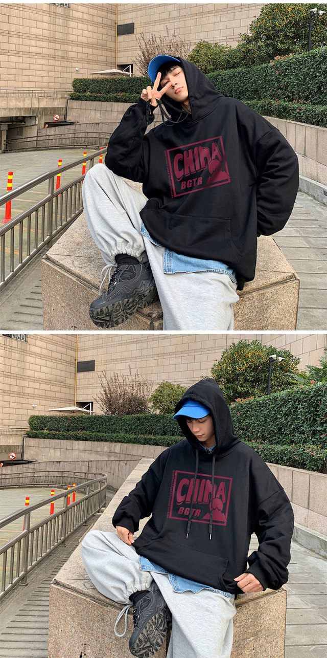 实拍 港风百搭潮流印花宽松连帽上衣男韩版日系休闲简约卫衣