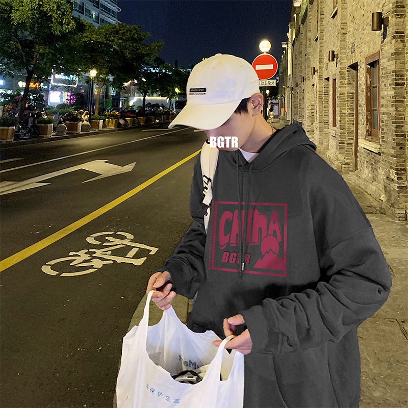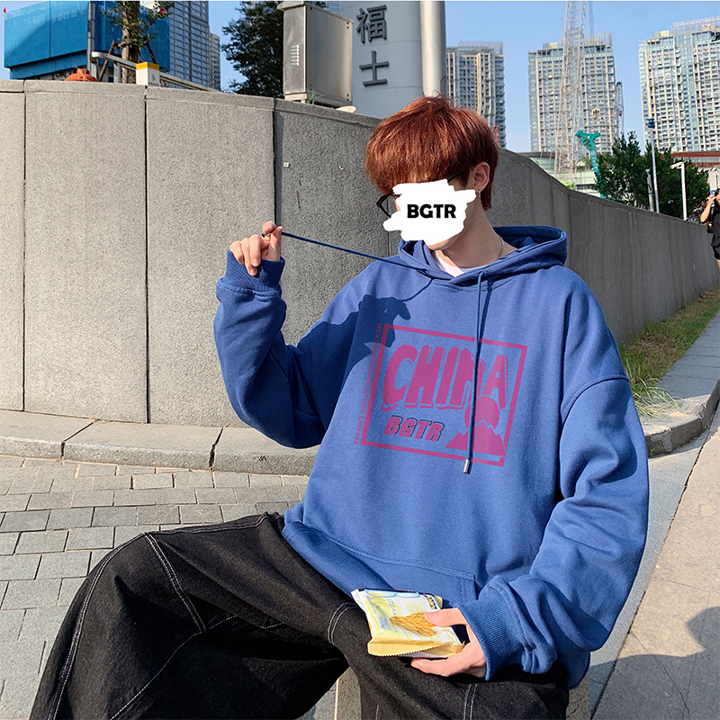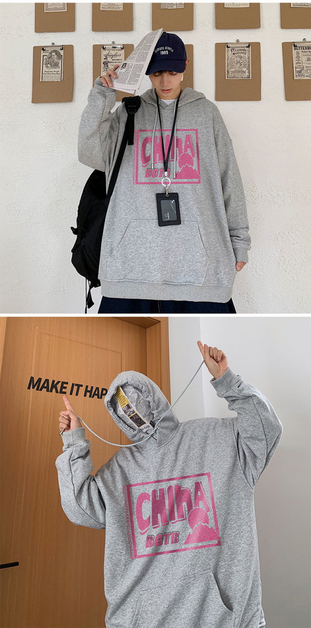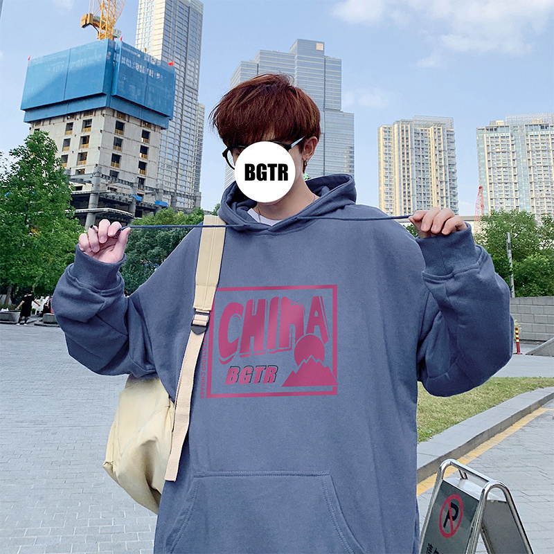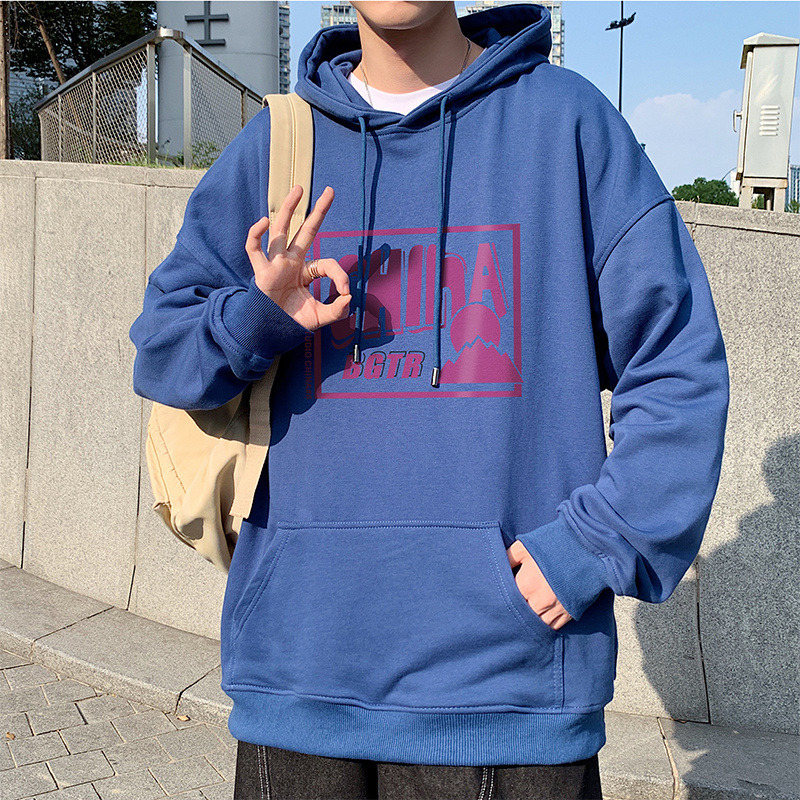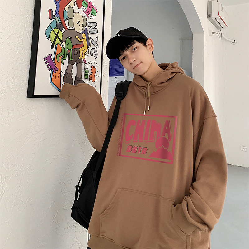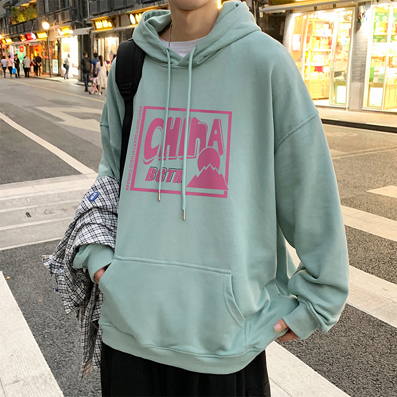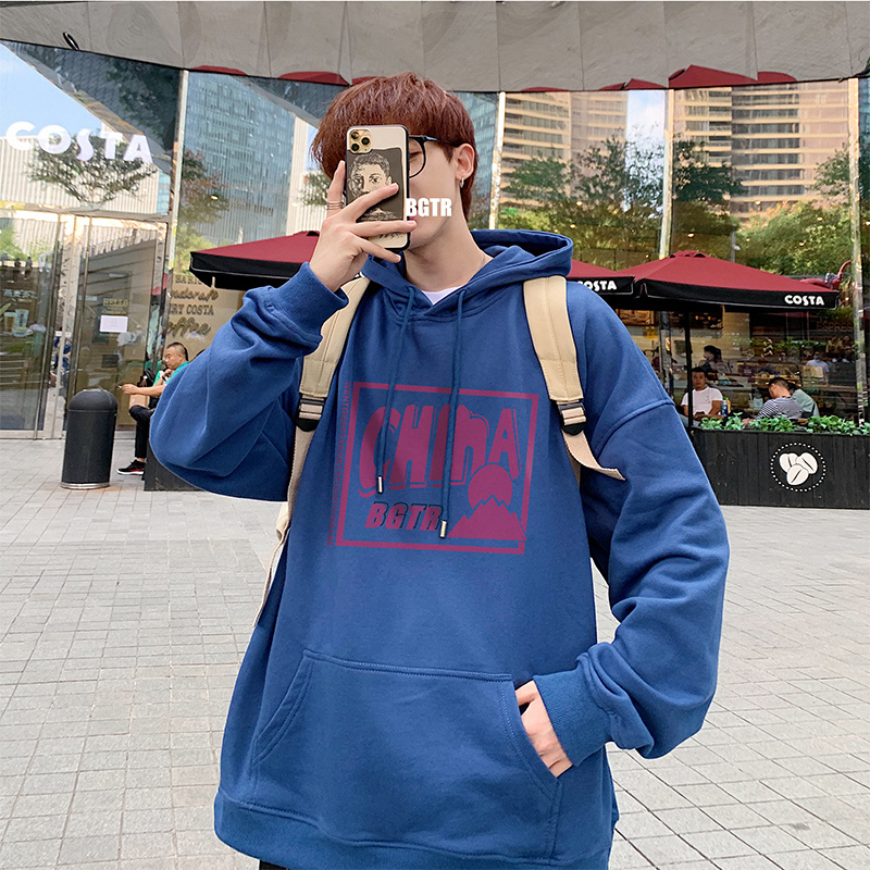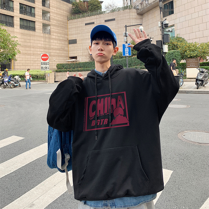 实拍 港风百搭潮流印花宽松连帽上衣男韩版日系休闲简约卫衣