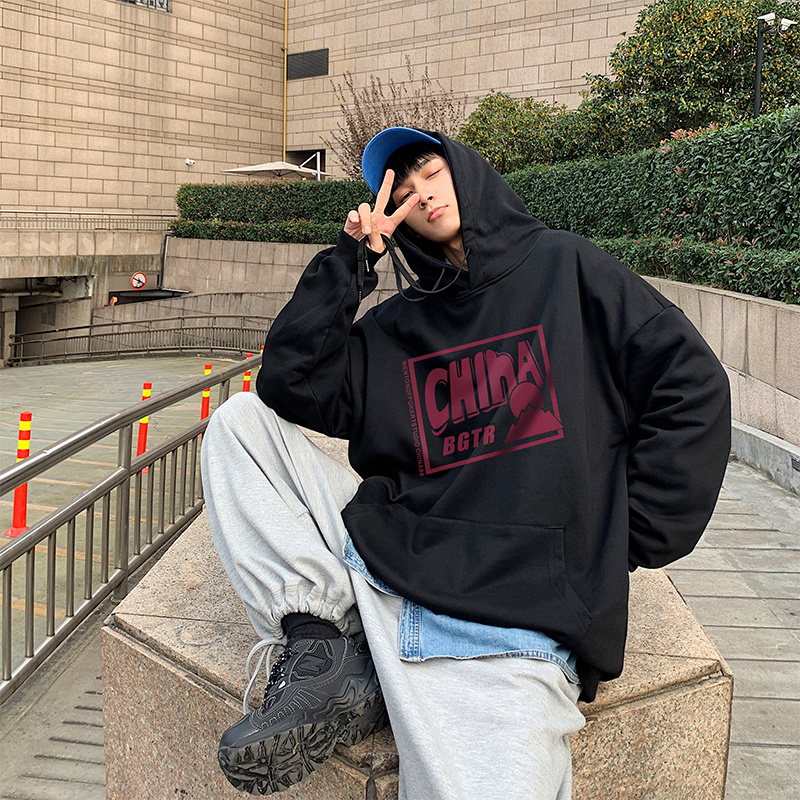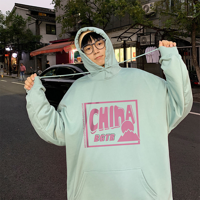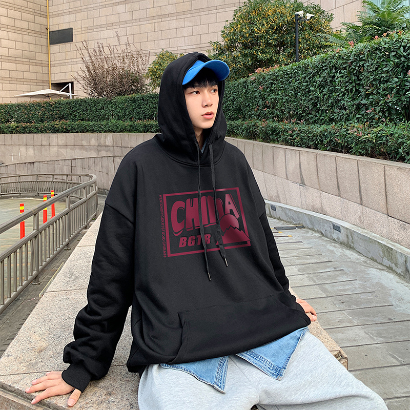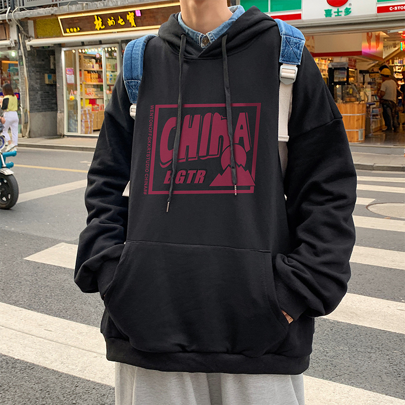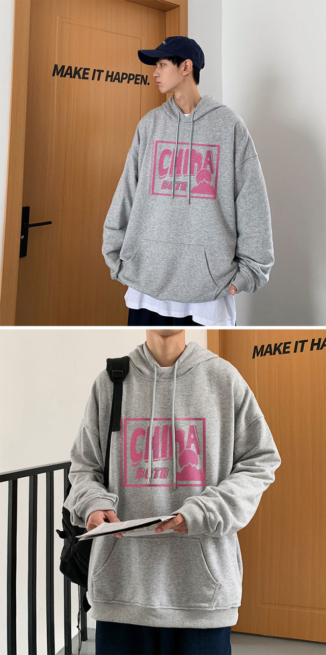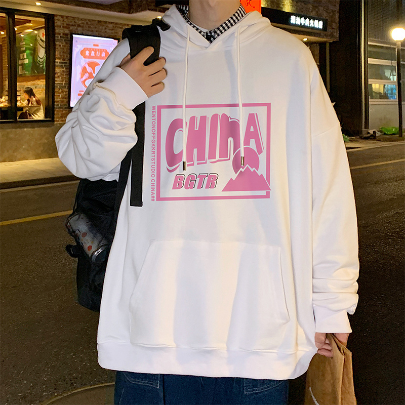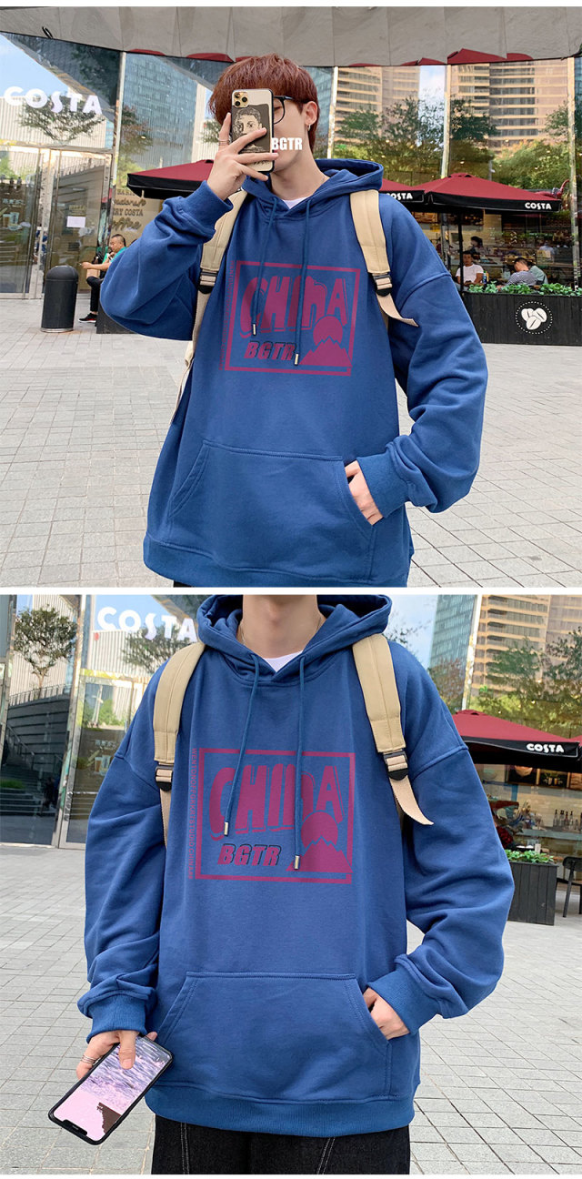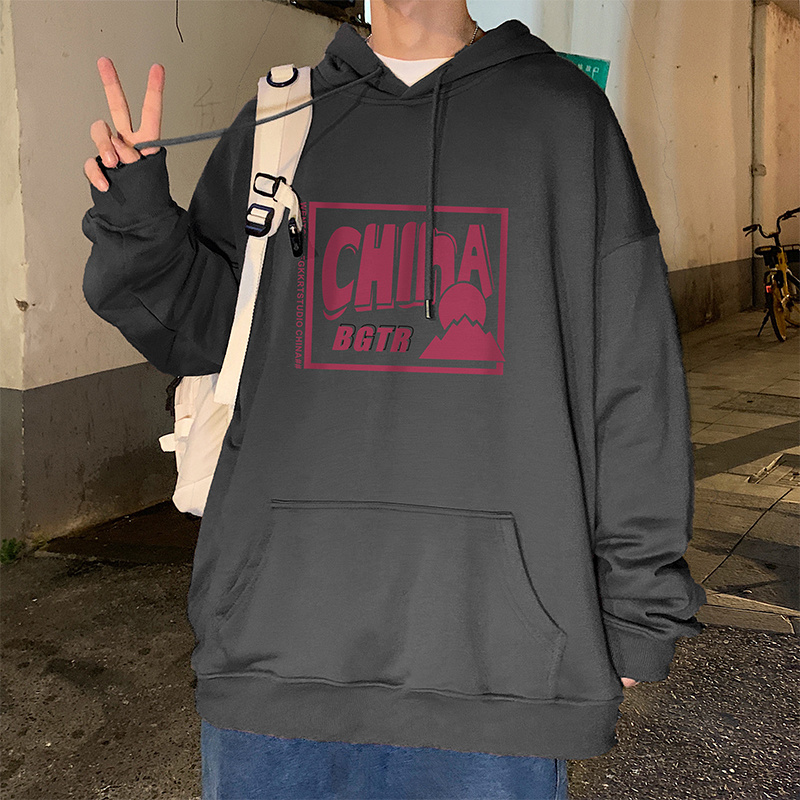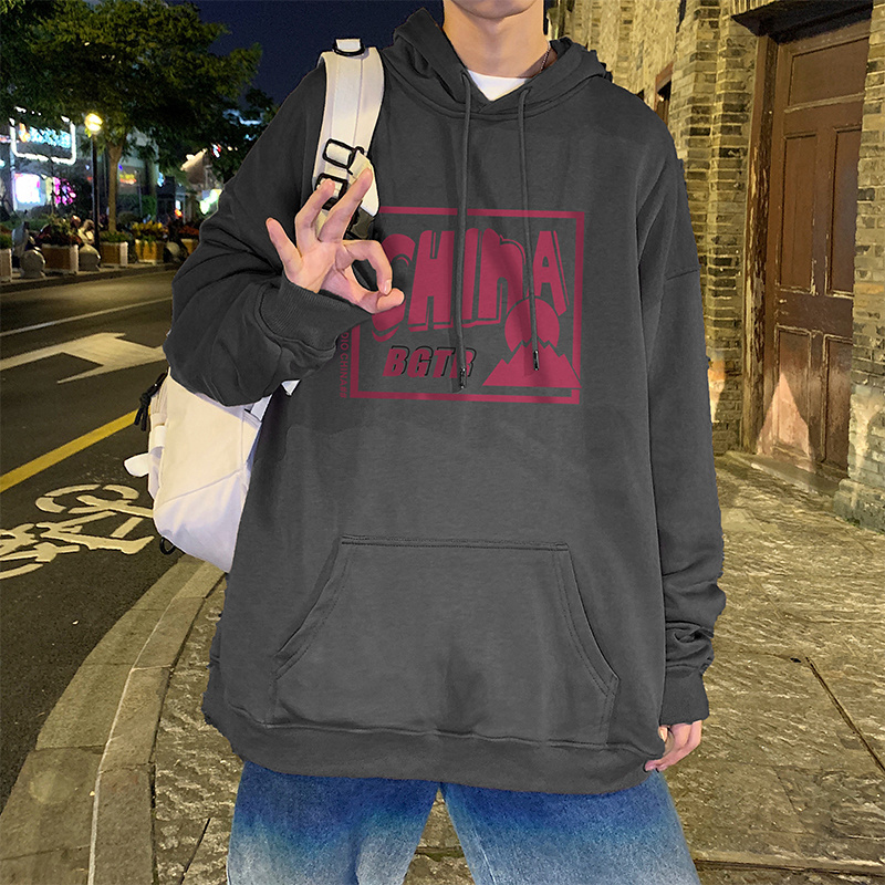 实拍 港风百搭潮流印花宽松连帽上衣男韩版日系休闲简约卫衣