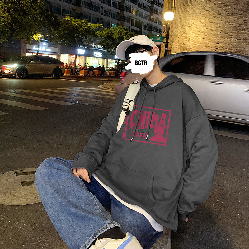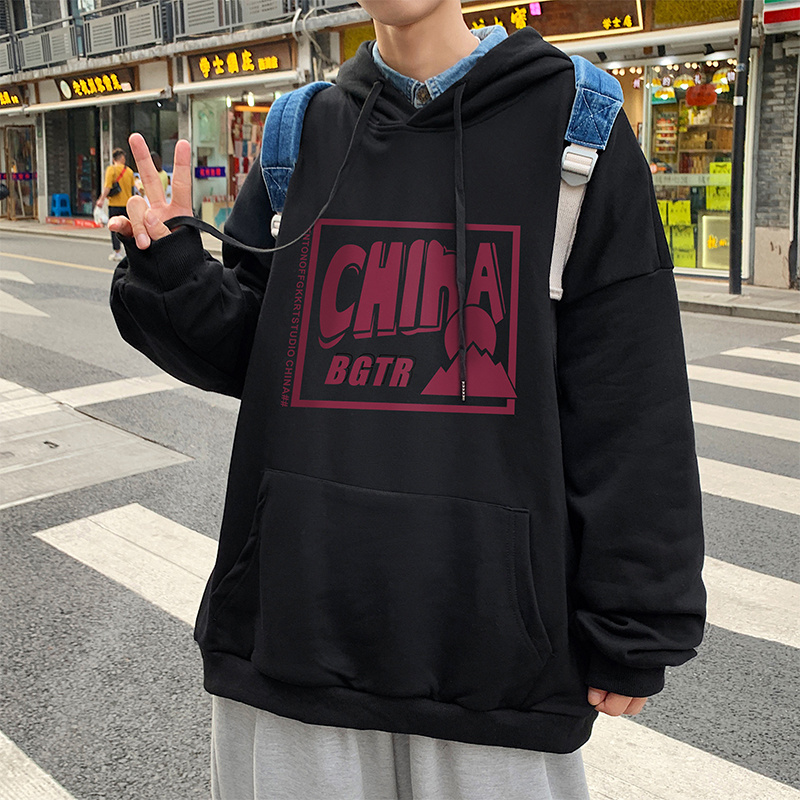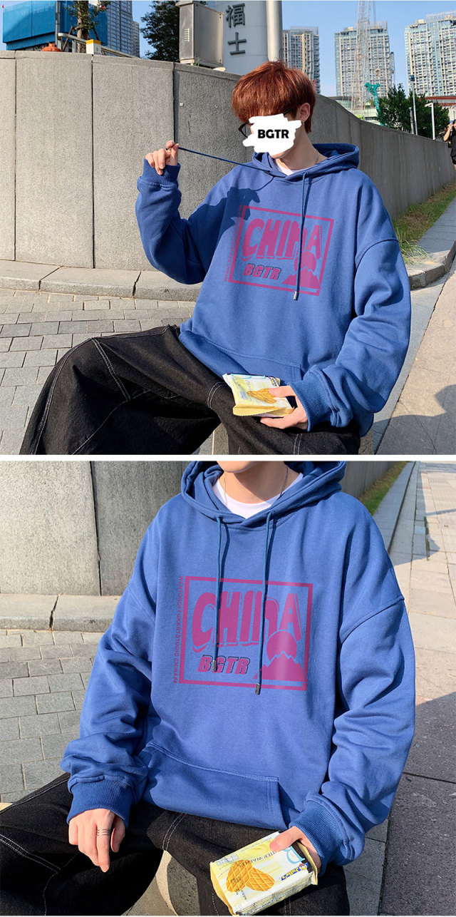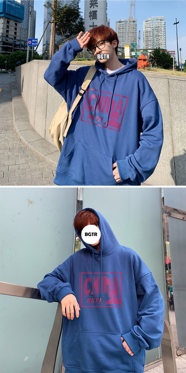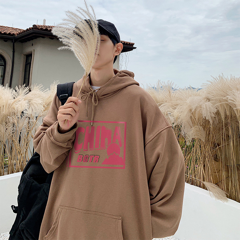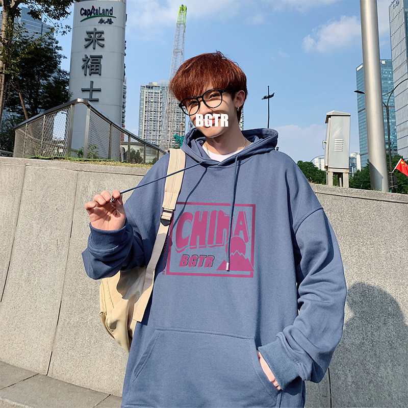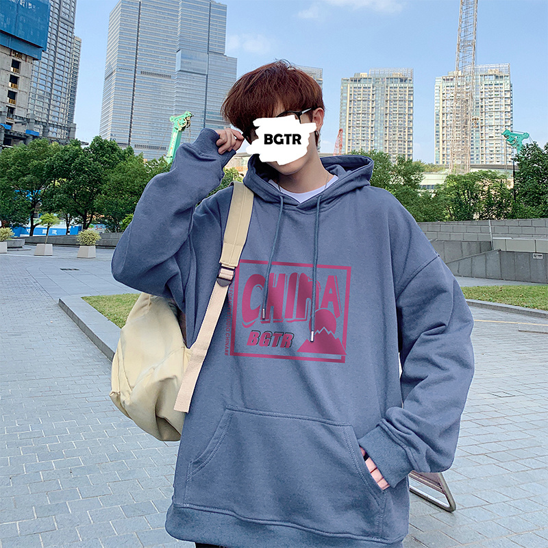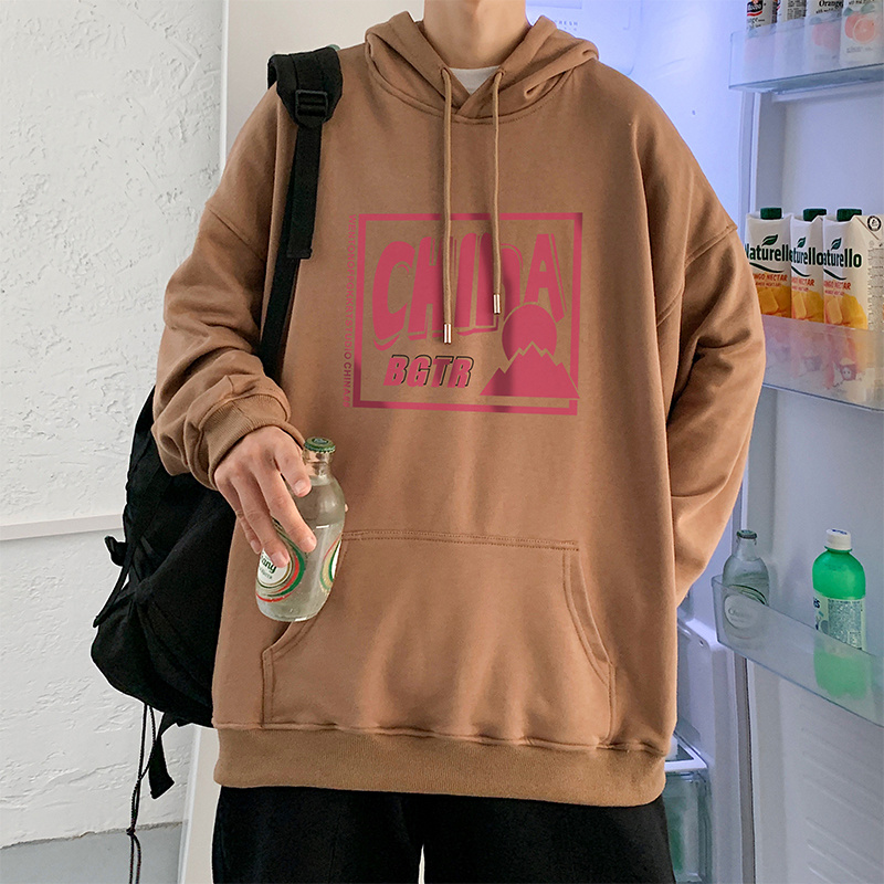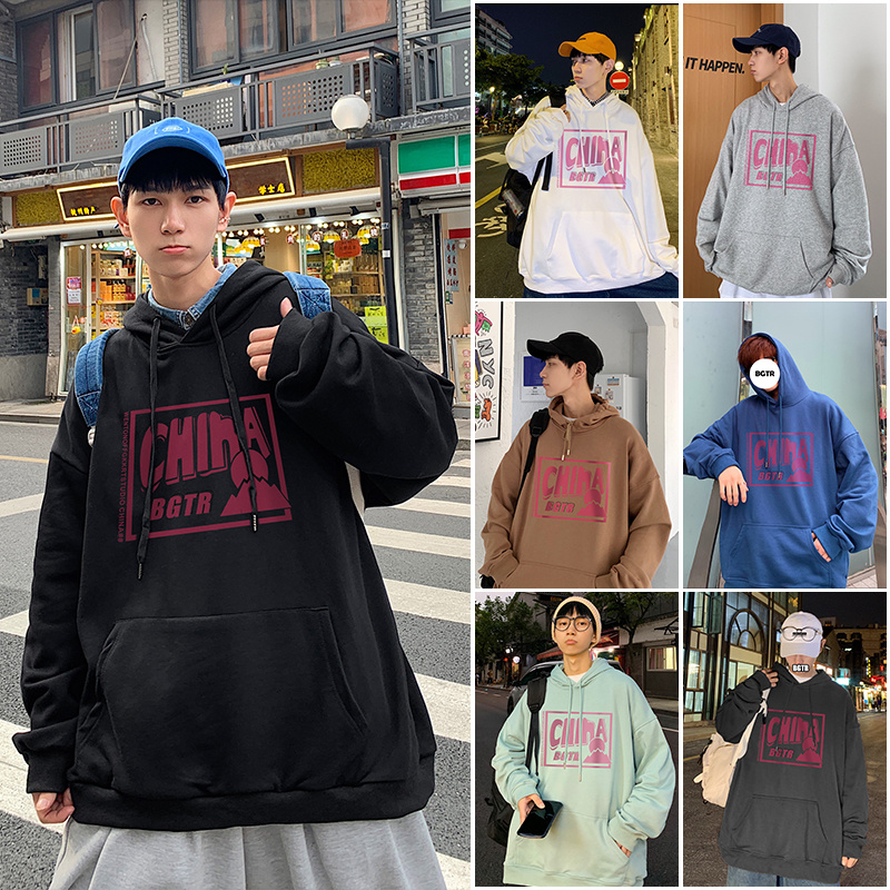 实拍 港风百搭潮流印花宽松连帽上衣男韩版日系休闲简约卫衣