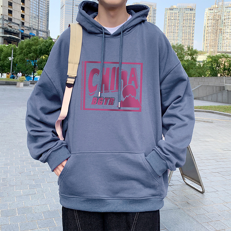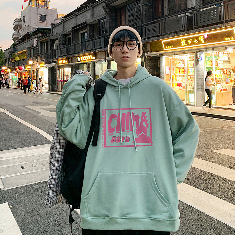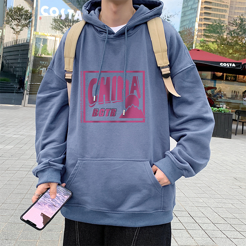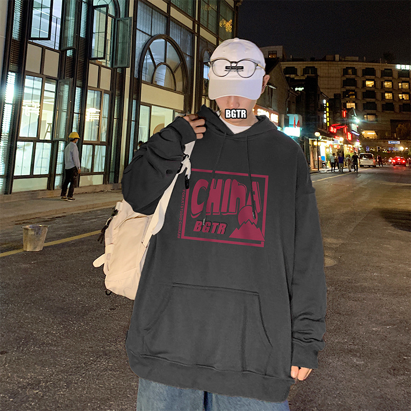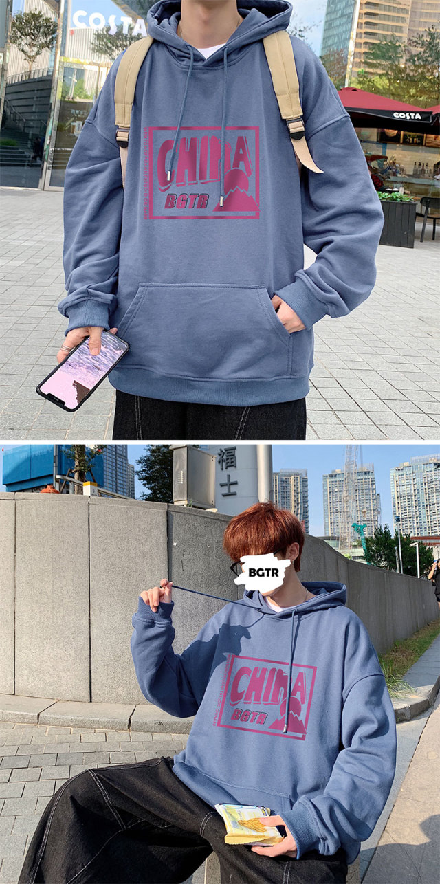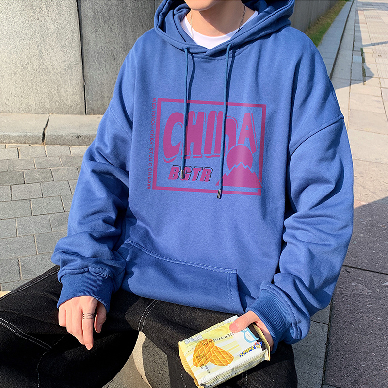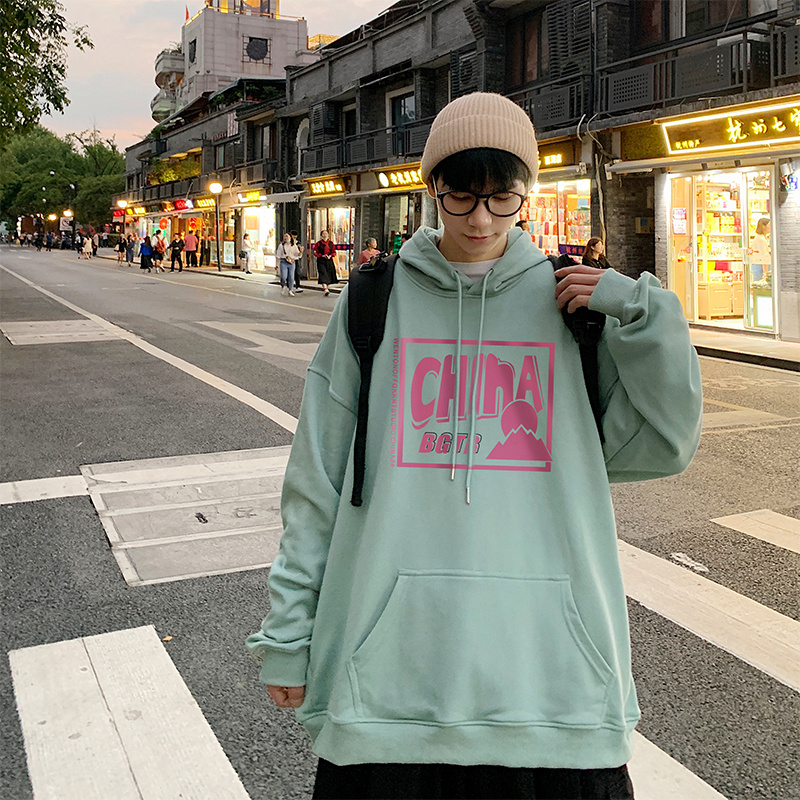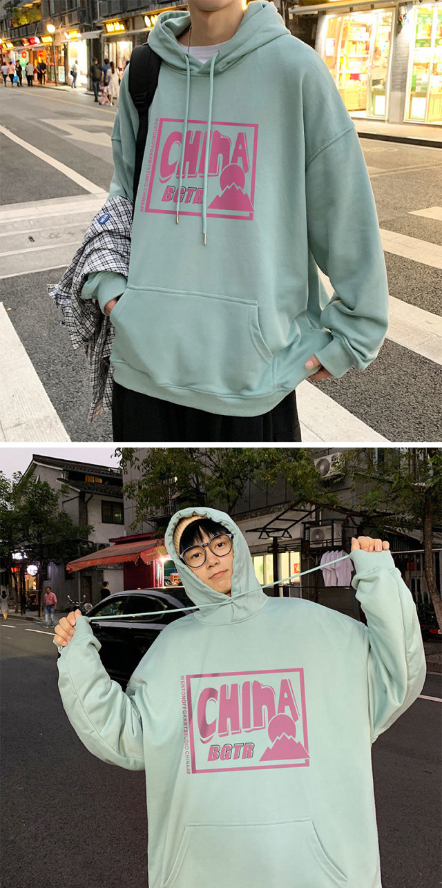 实拍 港风百搭潮流印花宽松连帽上衣男韩版日系休闲简约卫衣