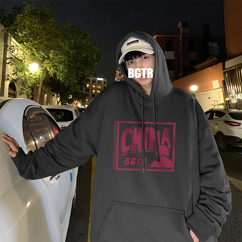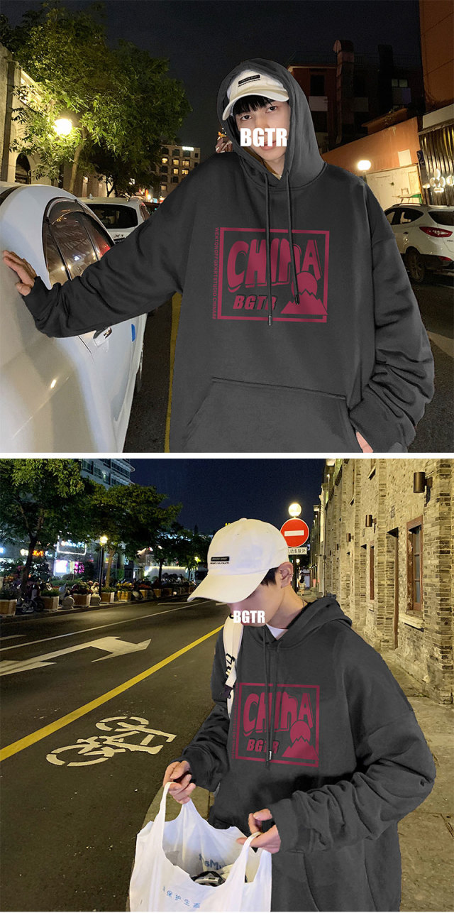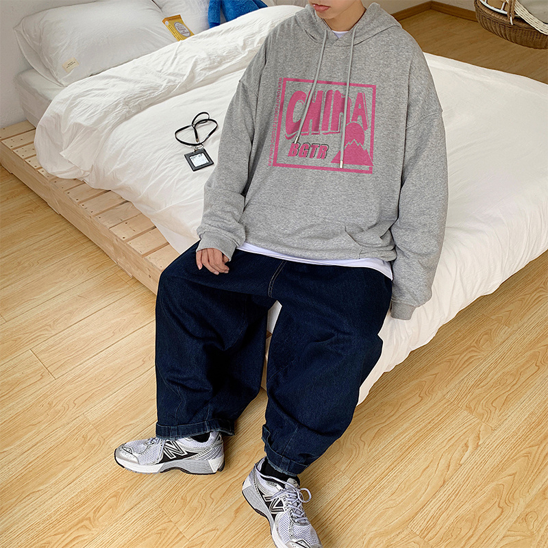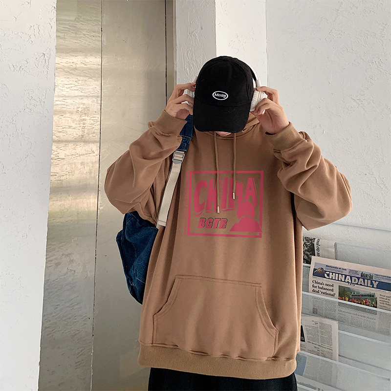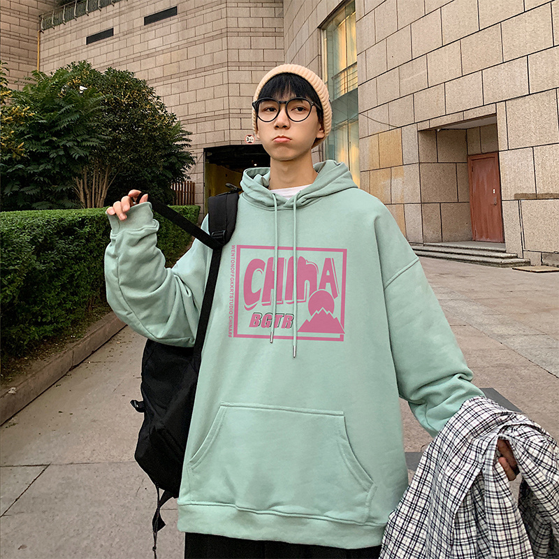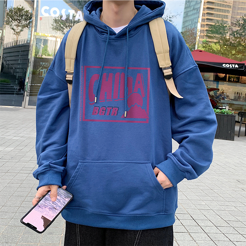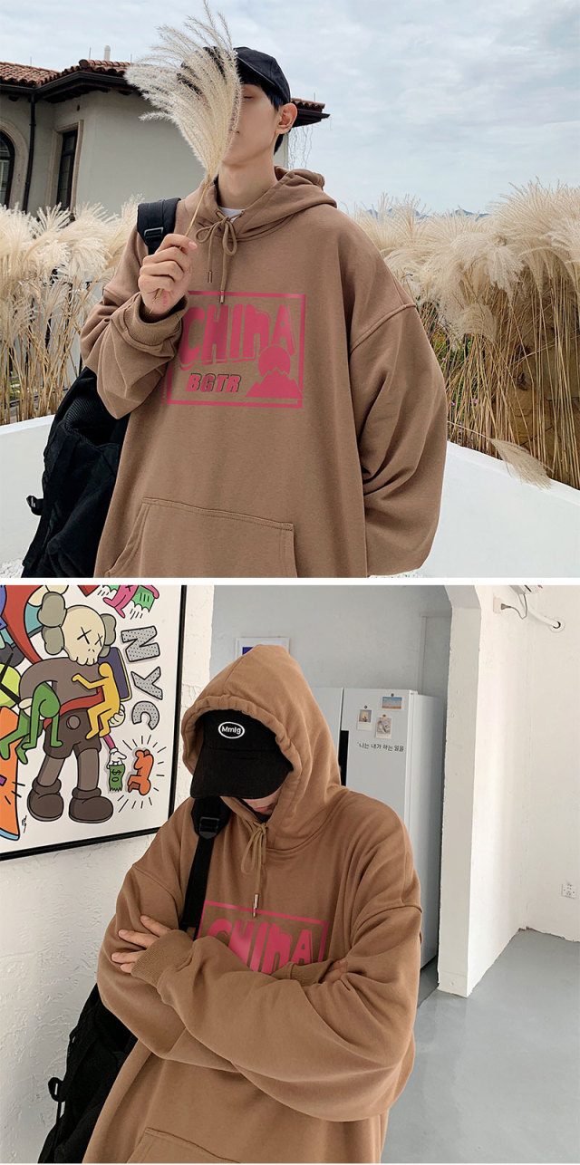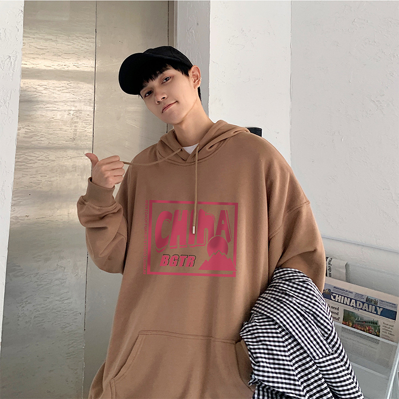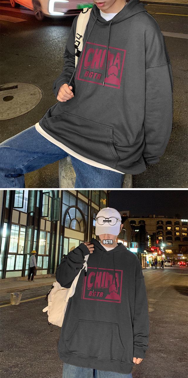 实拍 港风百搭潮流印花宽松连帽上衣男韩版日系休闲简约卫衣
