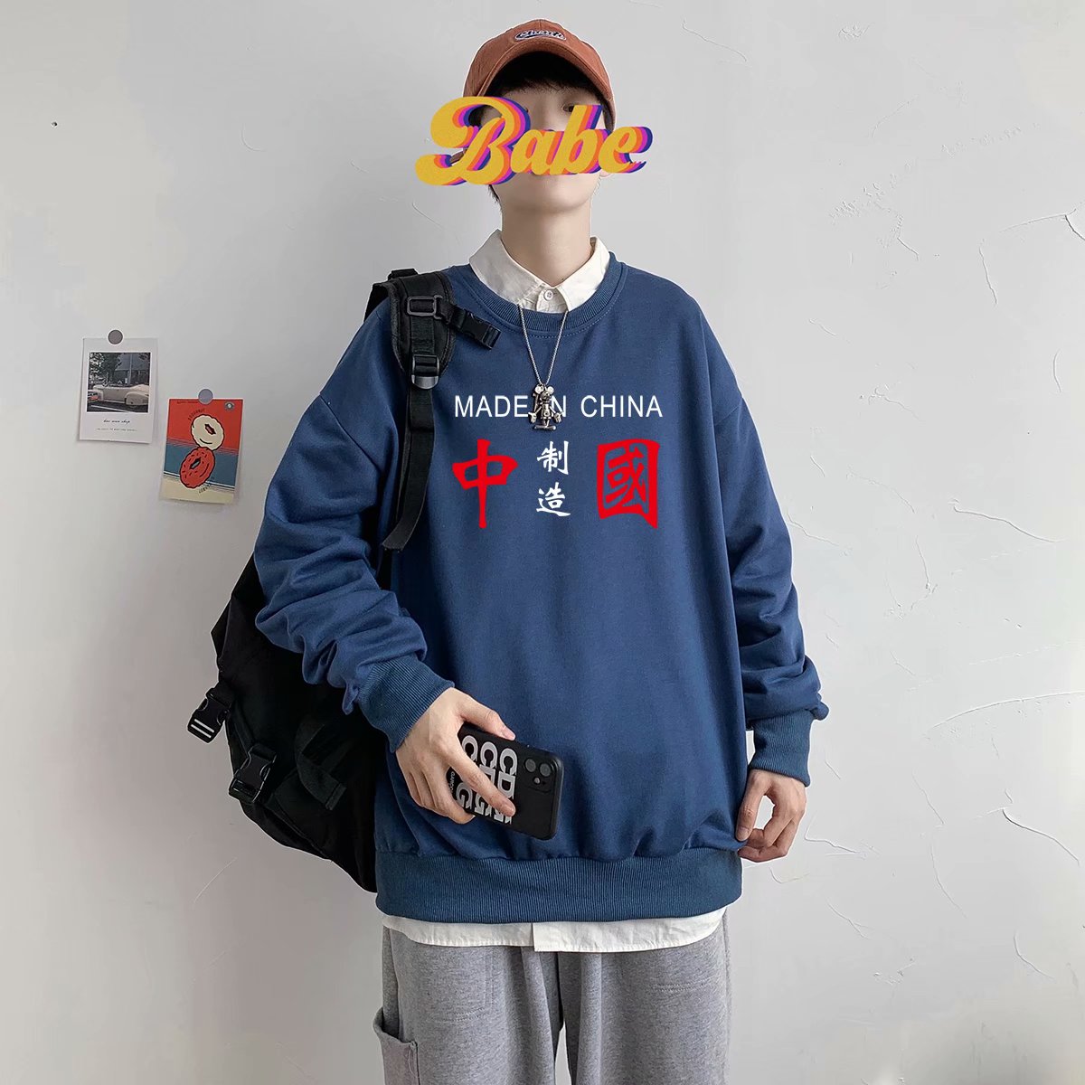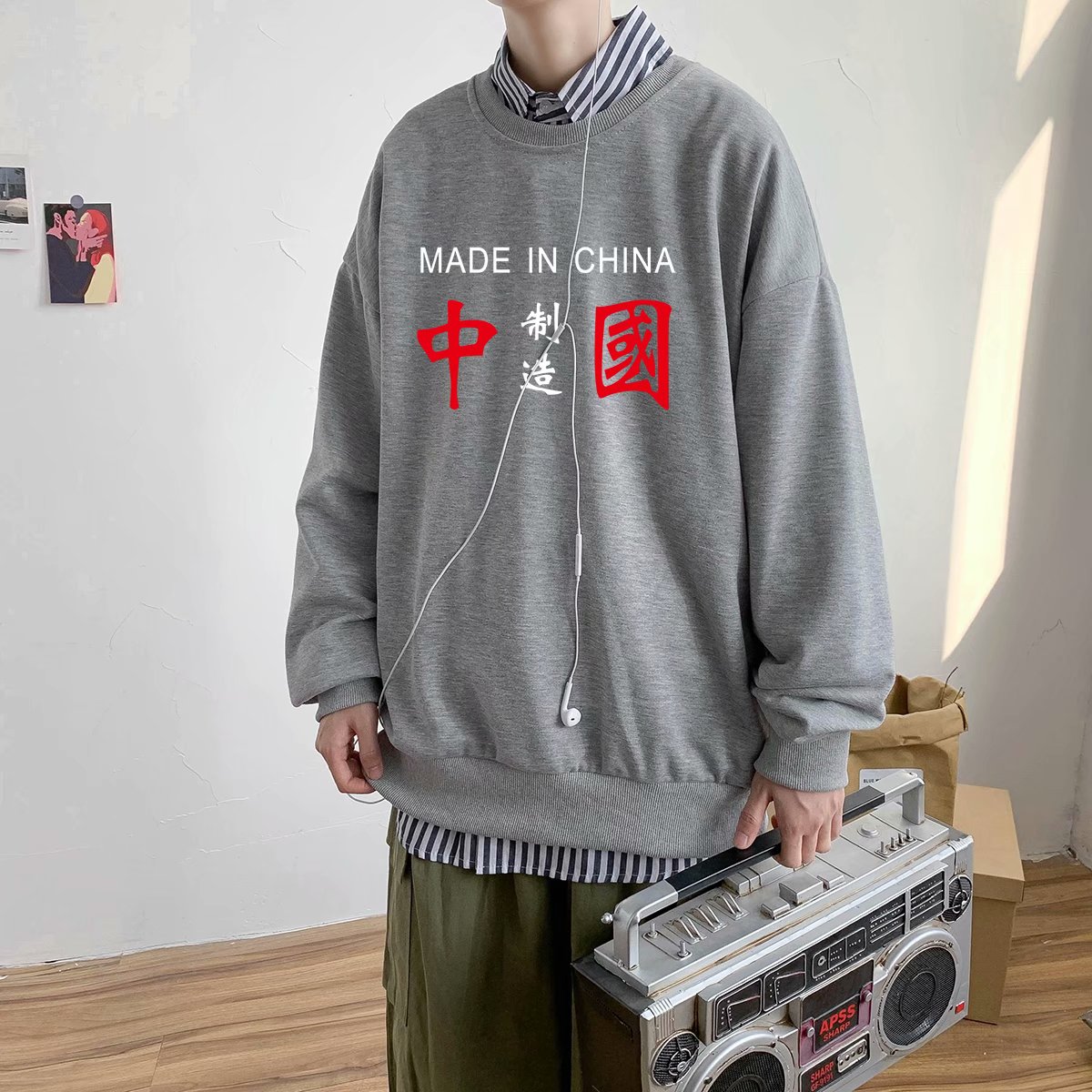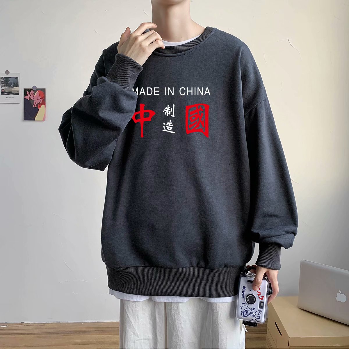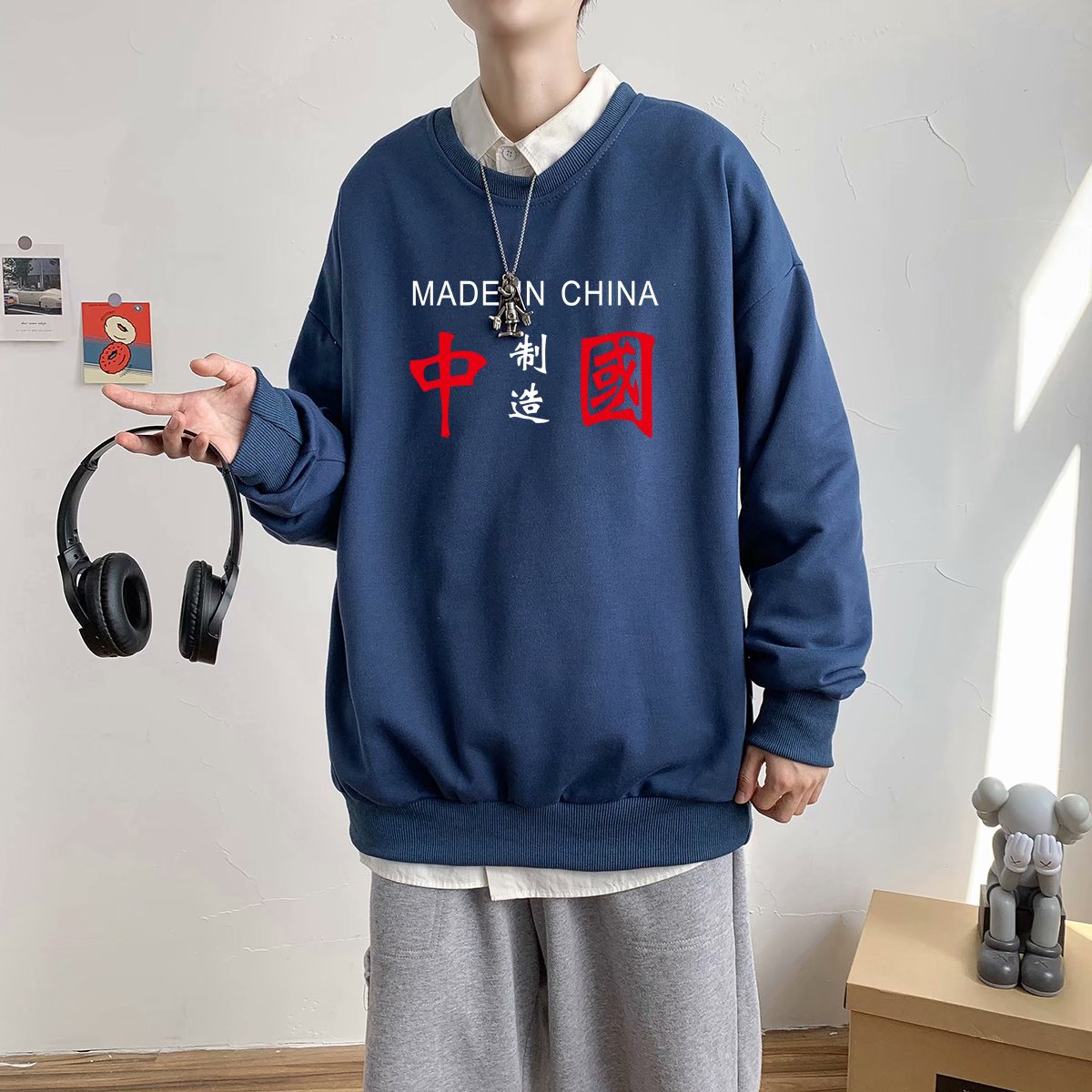 实拍 港风潮流印花百搭街头圆领宽松上衣男日系韩版休闲潮流卫衣