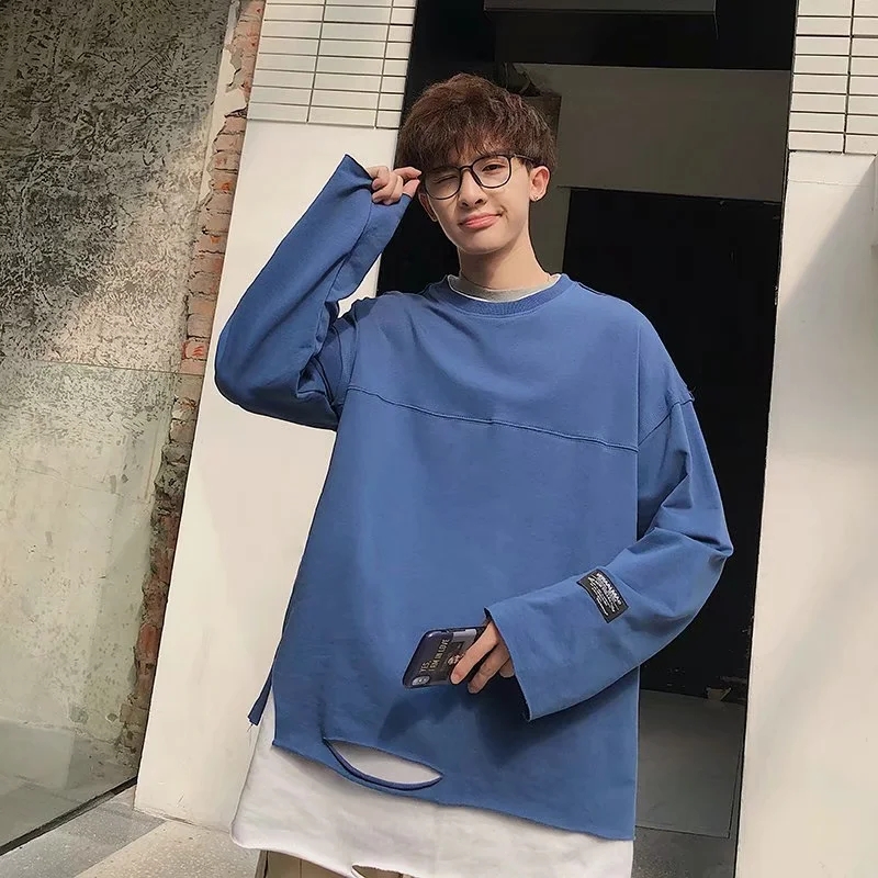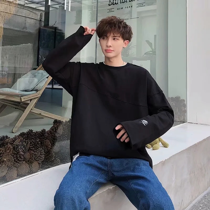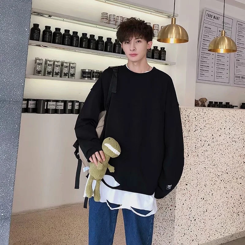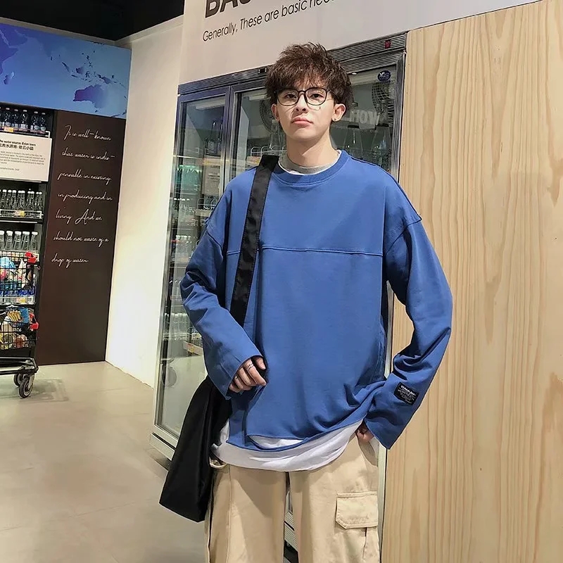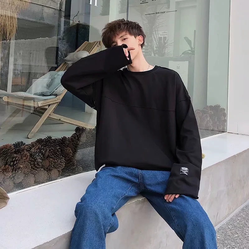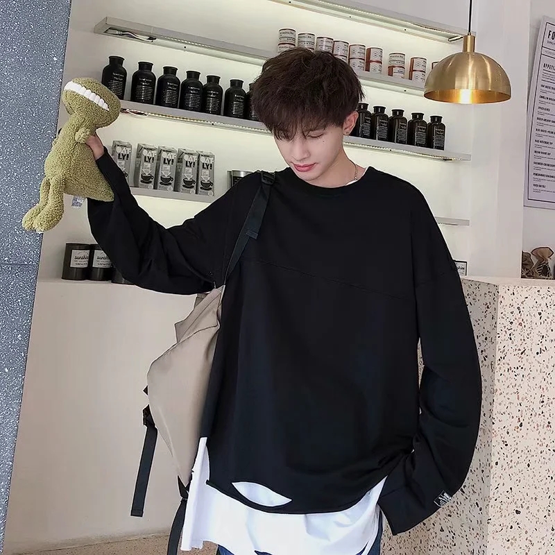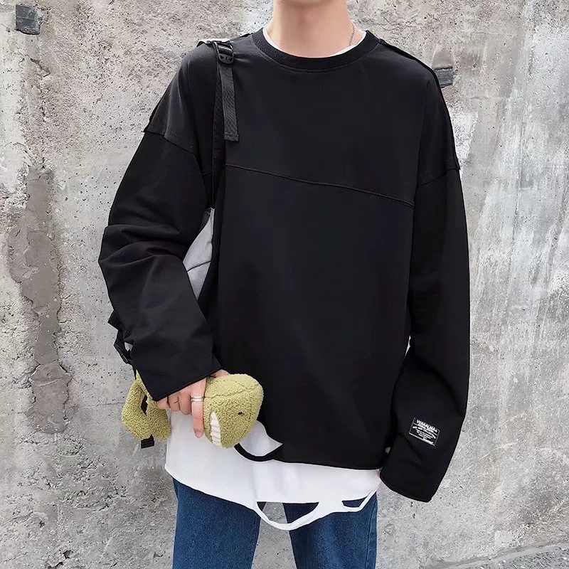 实拍 韩版宽松纯色百搭圆领长袖上衣男港风日系休闲运动潮流卫衣