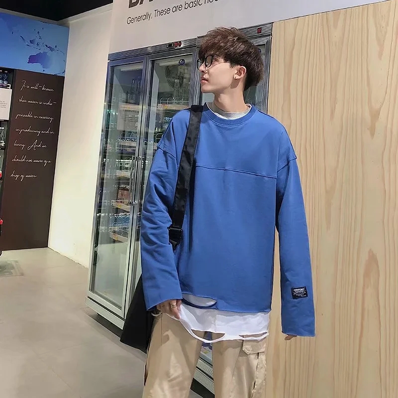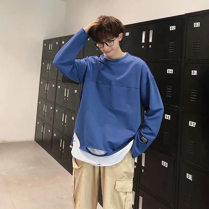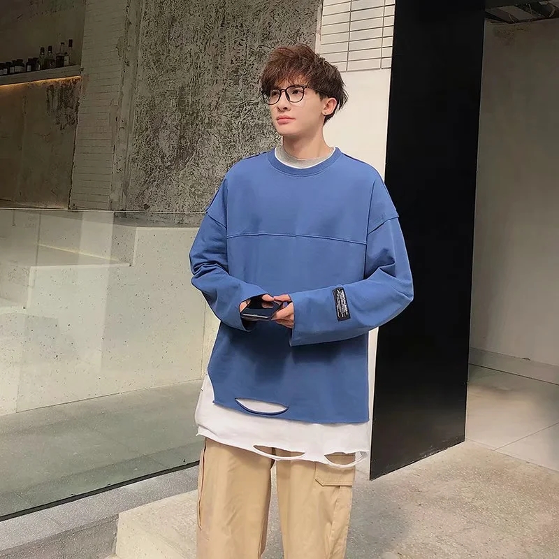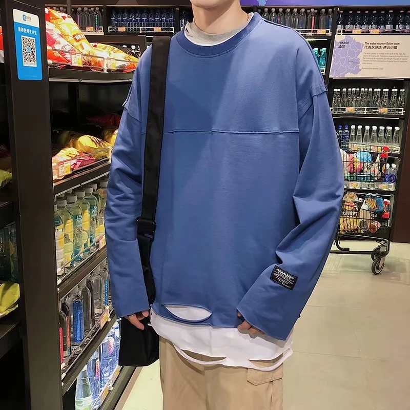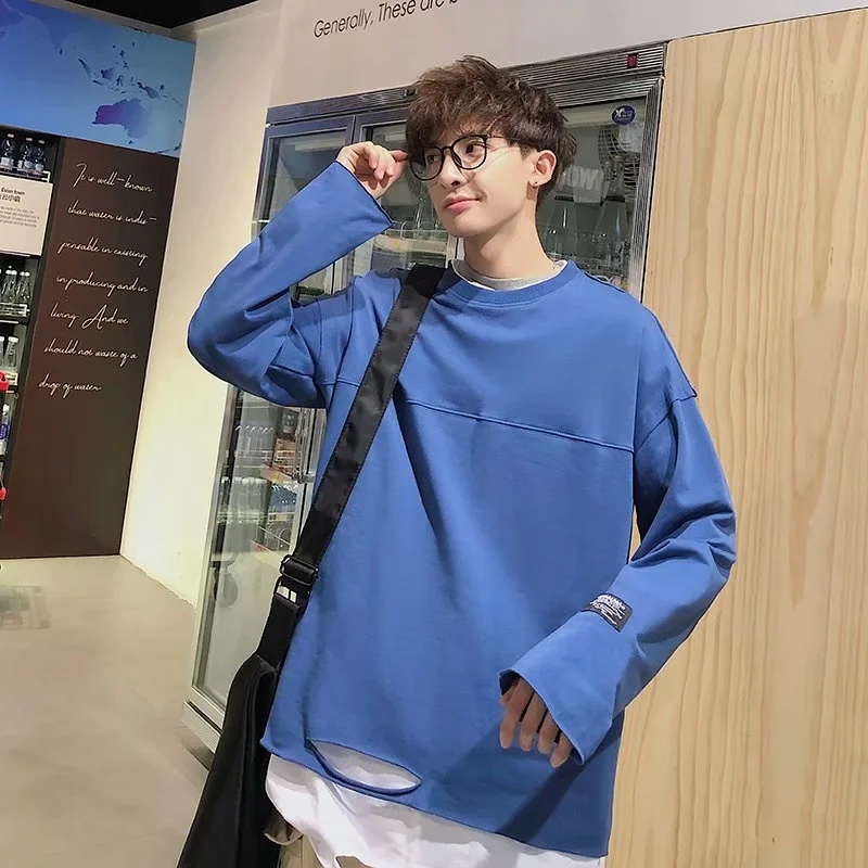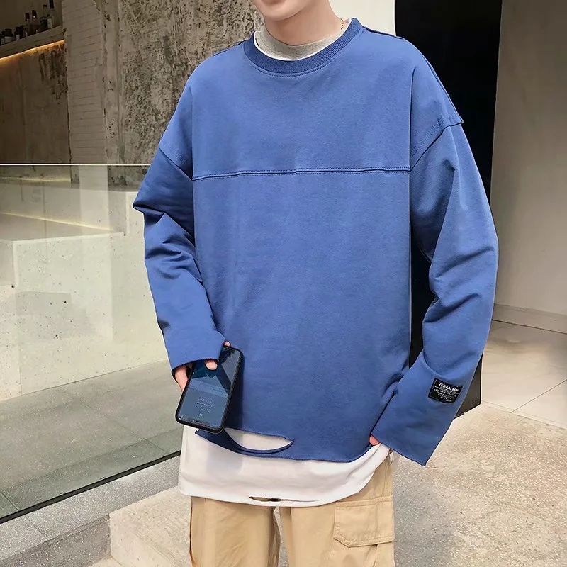 实拍 韩版宽松纯色百搭圆领长袖上衣男港风日系休闲运动潮流卫衣
