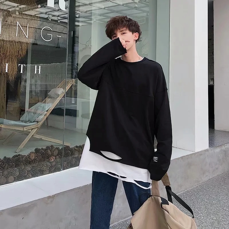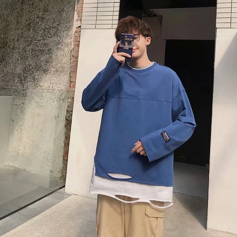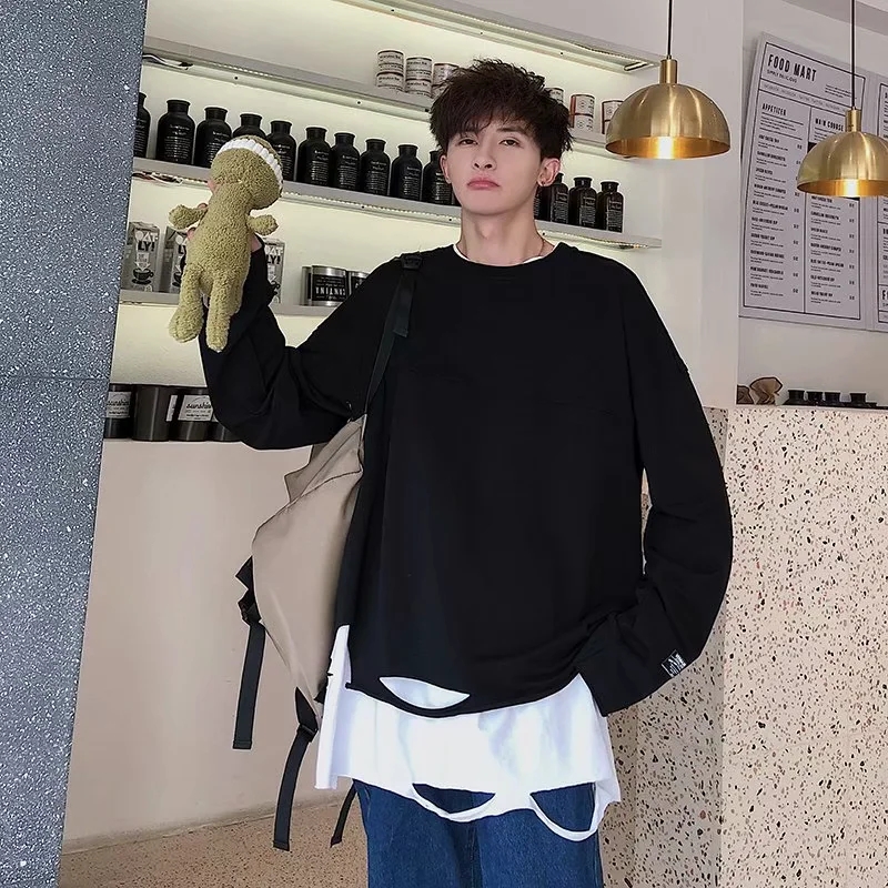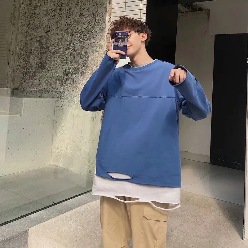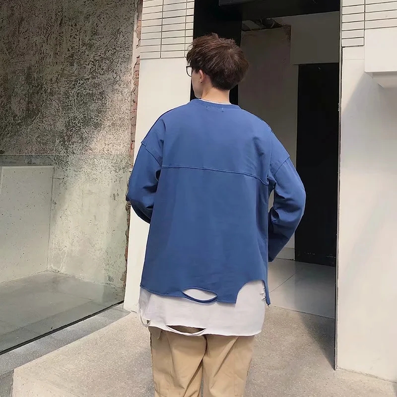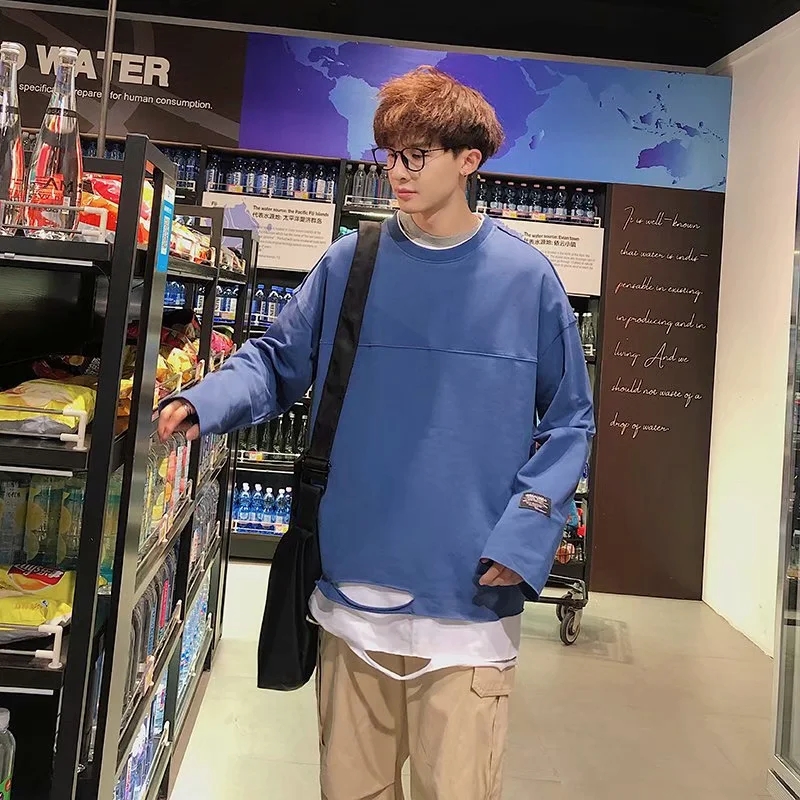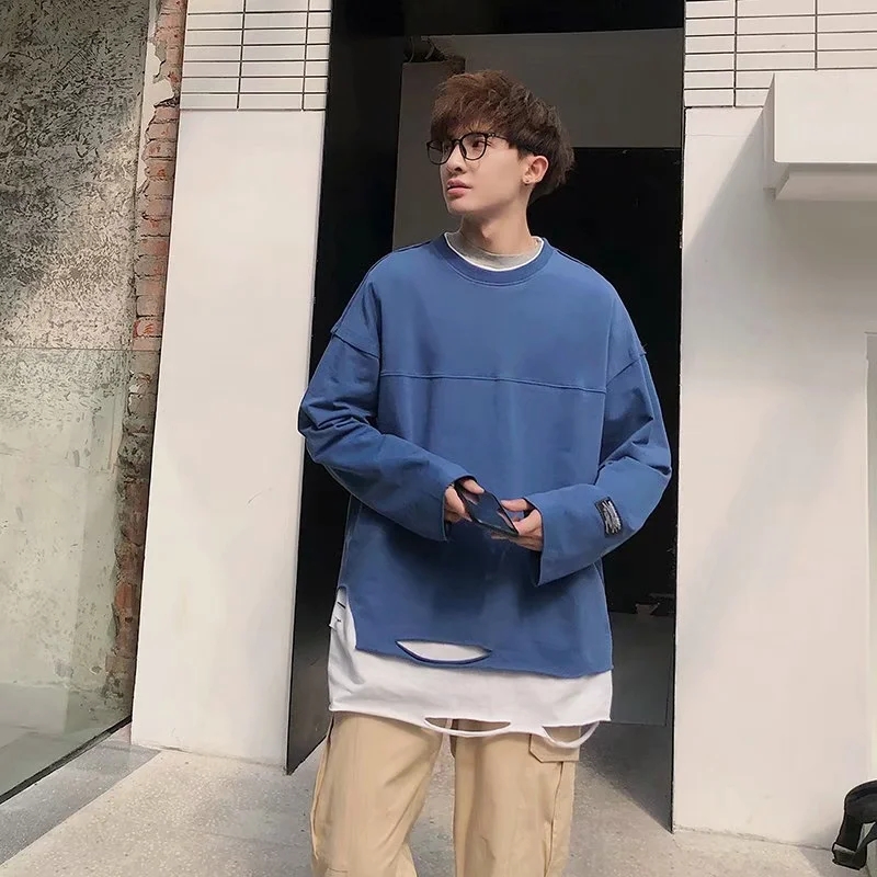 实拍 韩版宽松纯色百搭圆领长袖上衣男港风日系休闲运动潮流卫衣