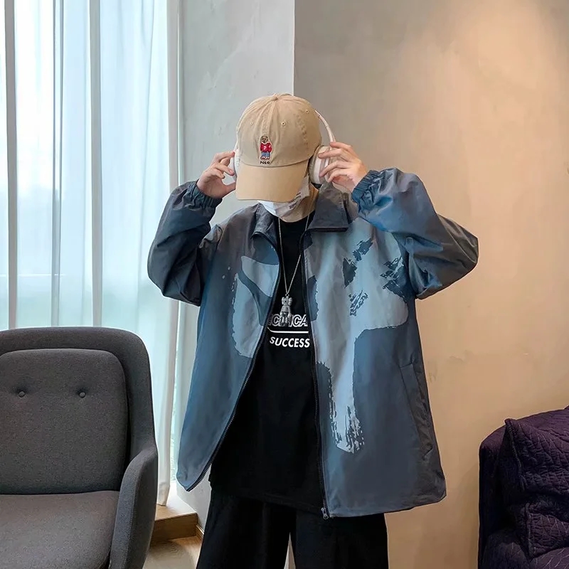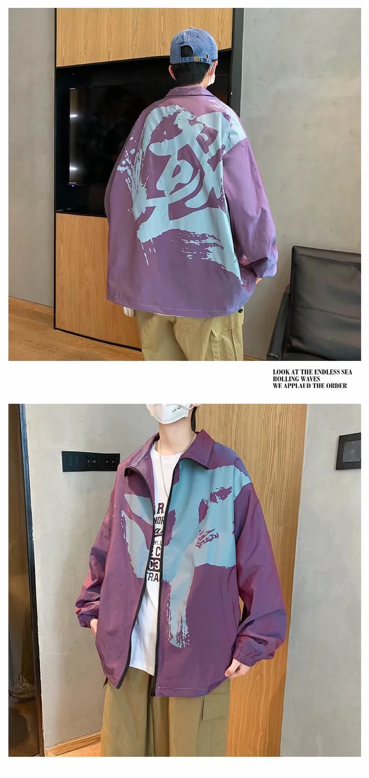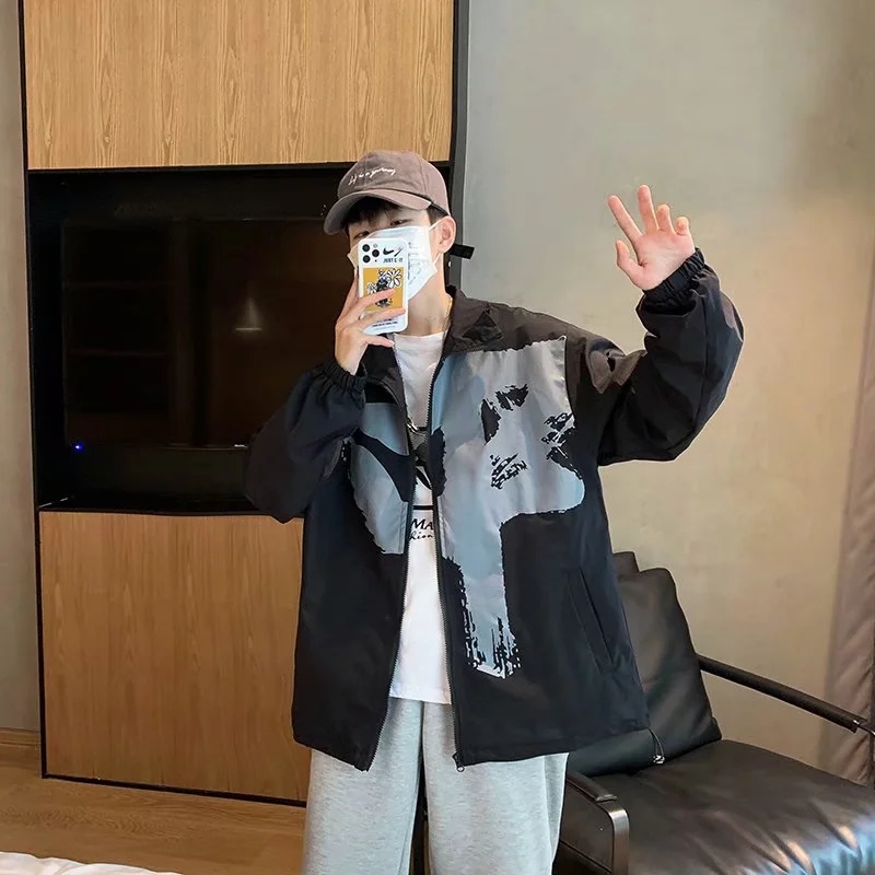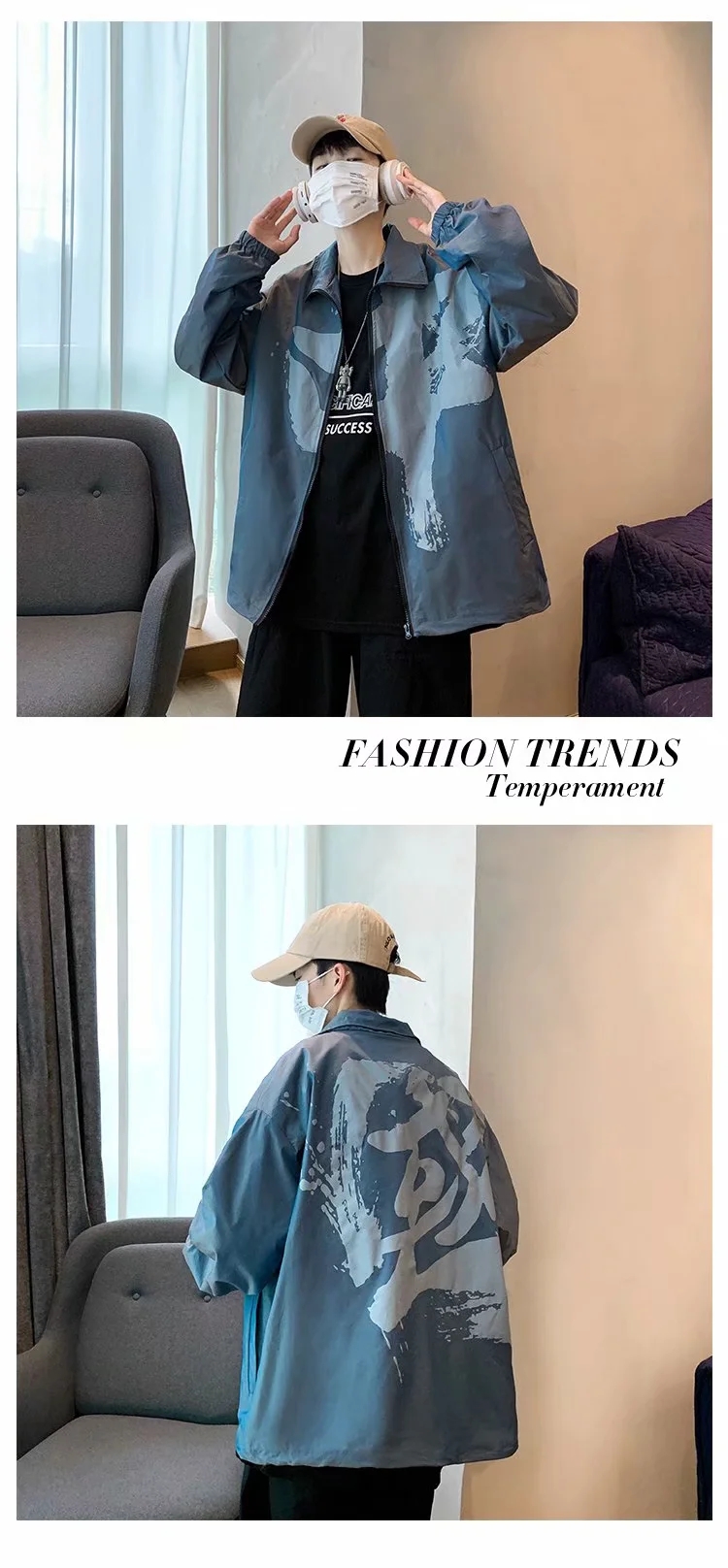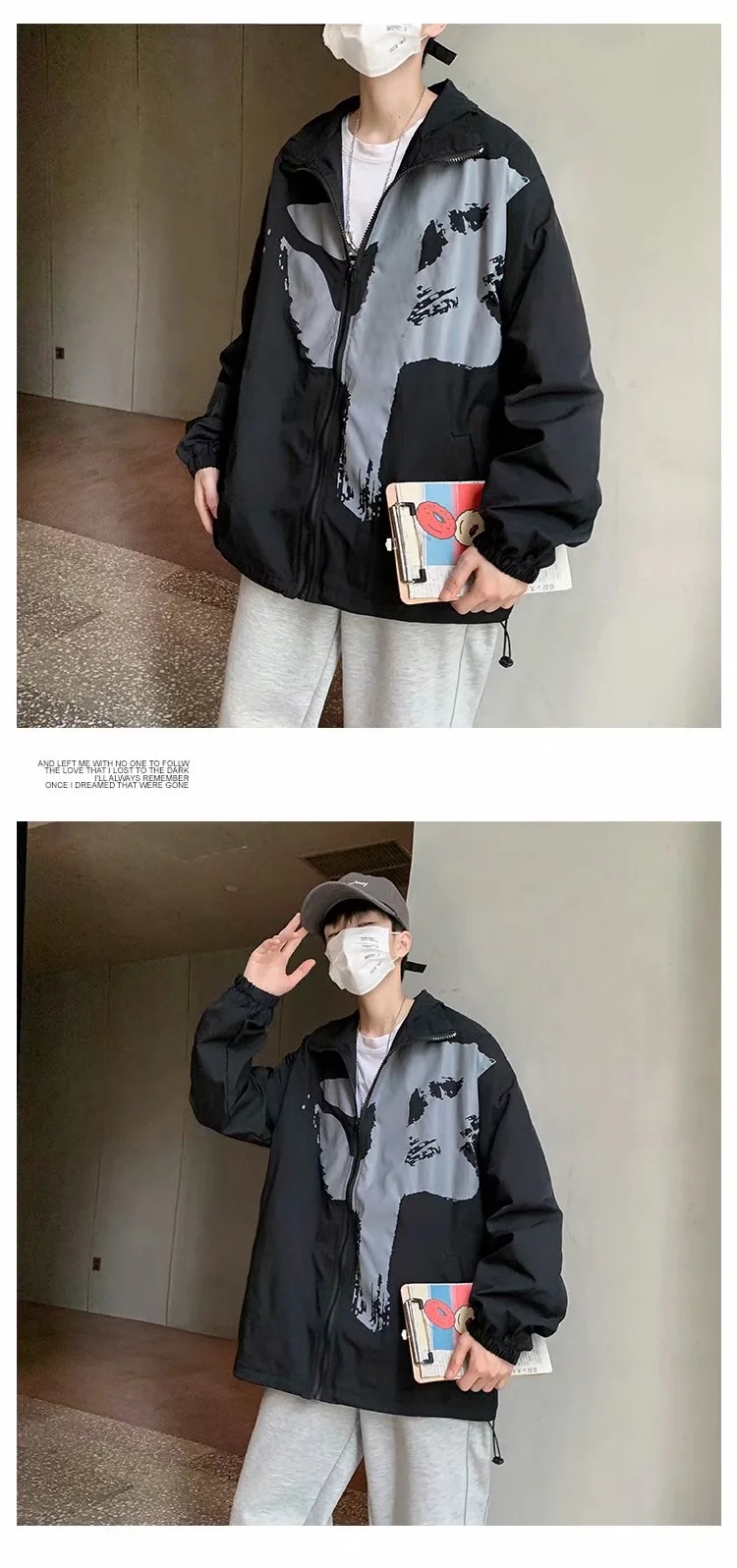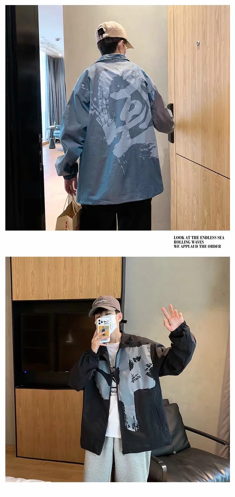 实拍 韩版港风街头潮流印花宽松百搭夹克上衣男日系青年休闲外套