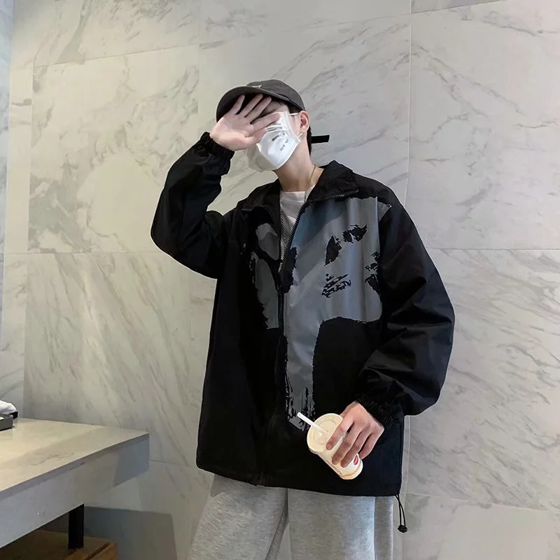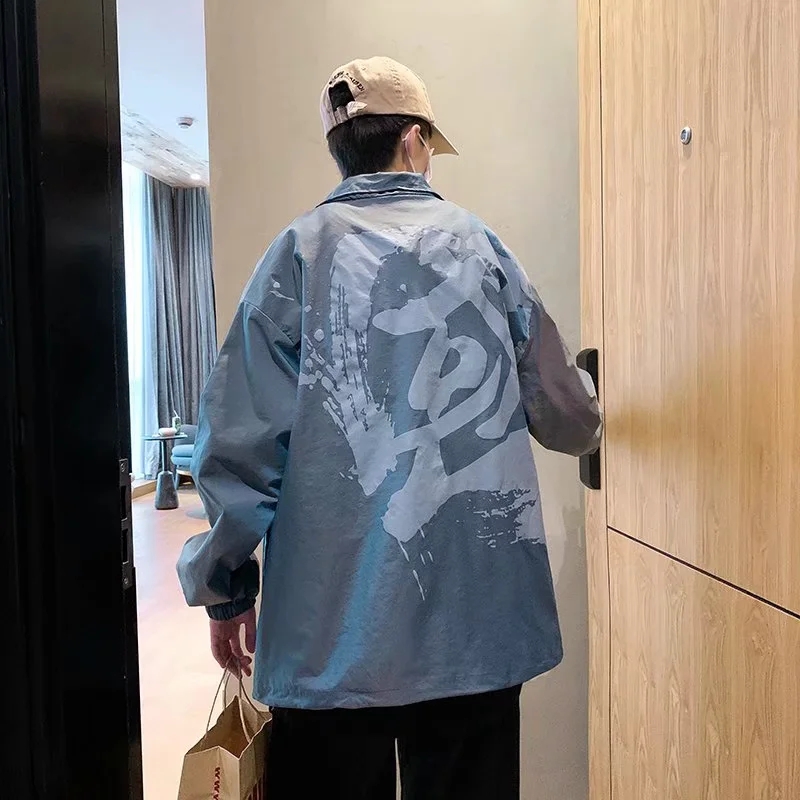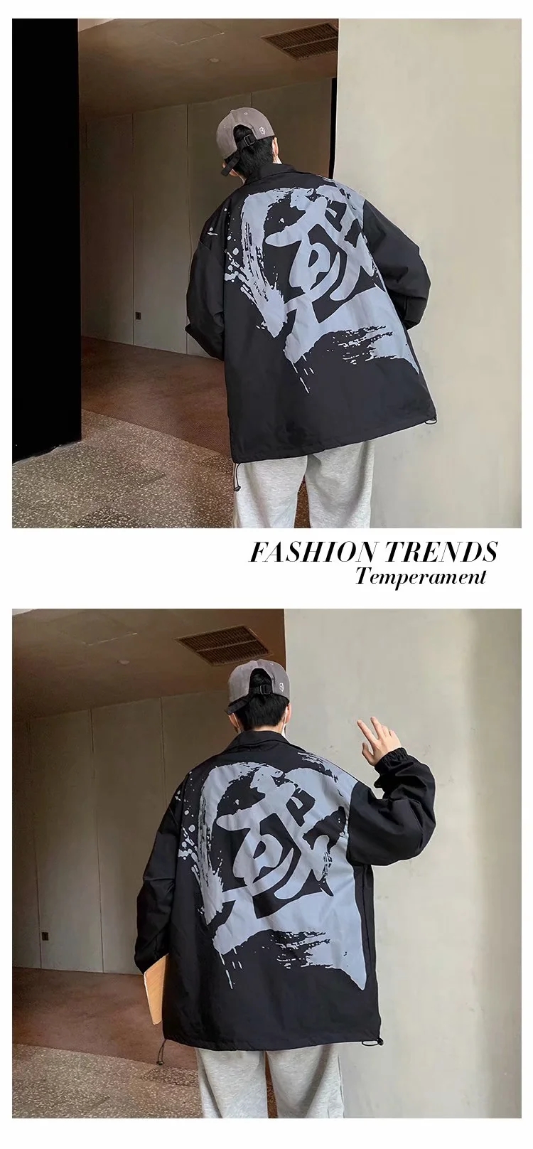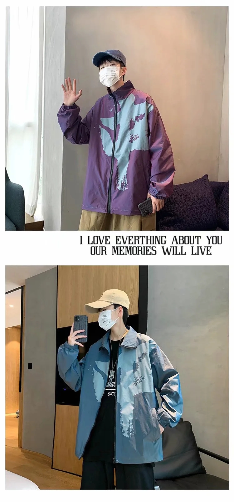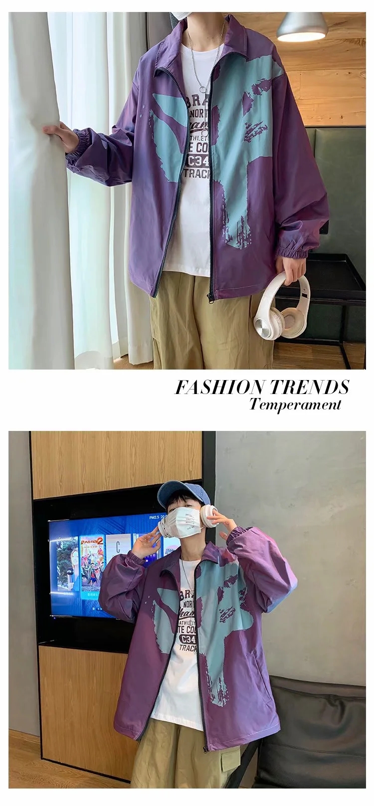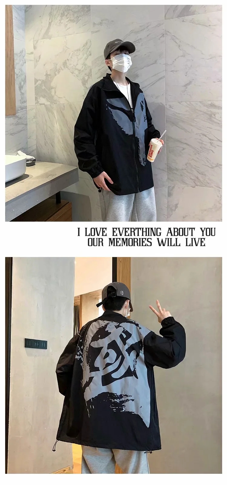 实拍 韩版港风街头潮流印花宽松百搭夹克上衣男日系青年休闲外套