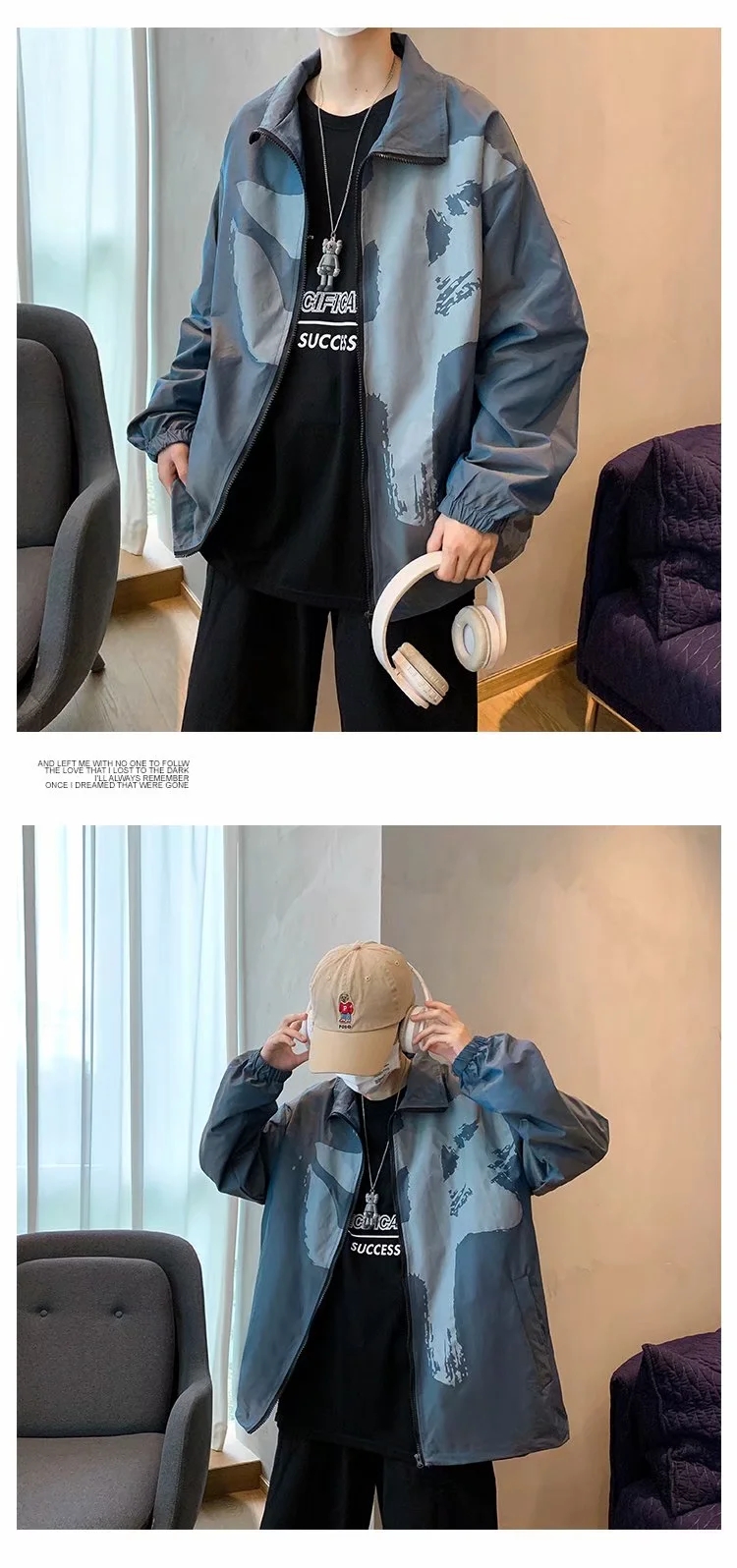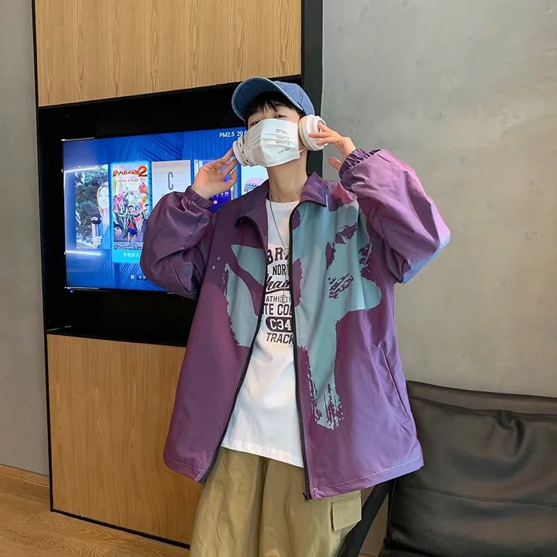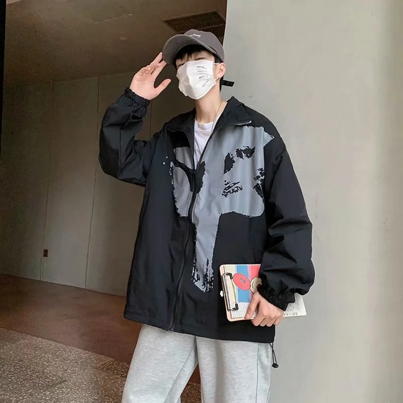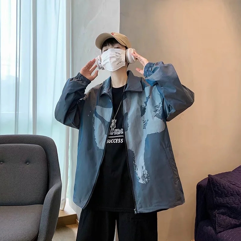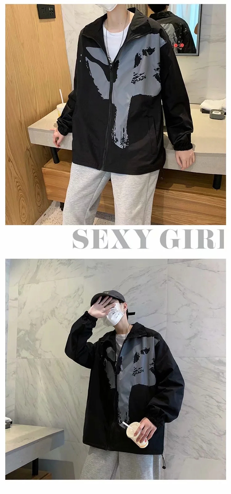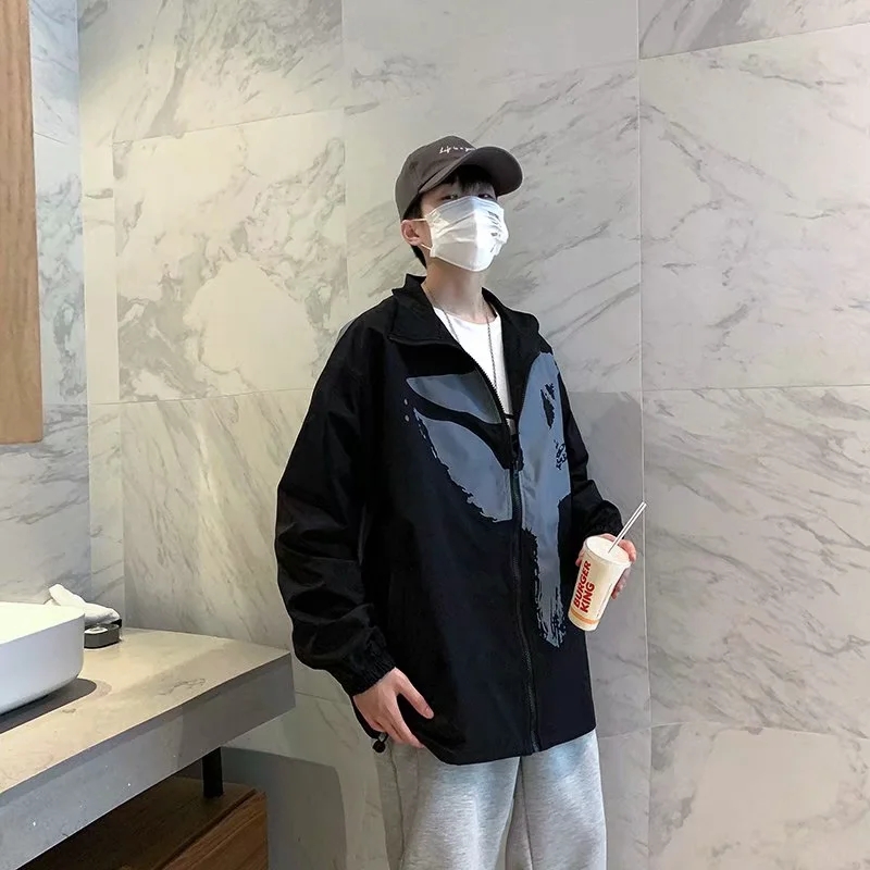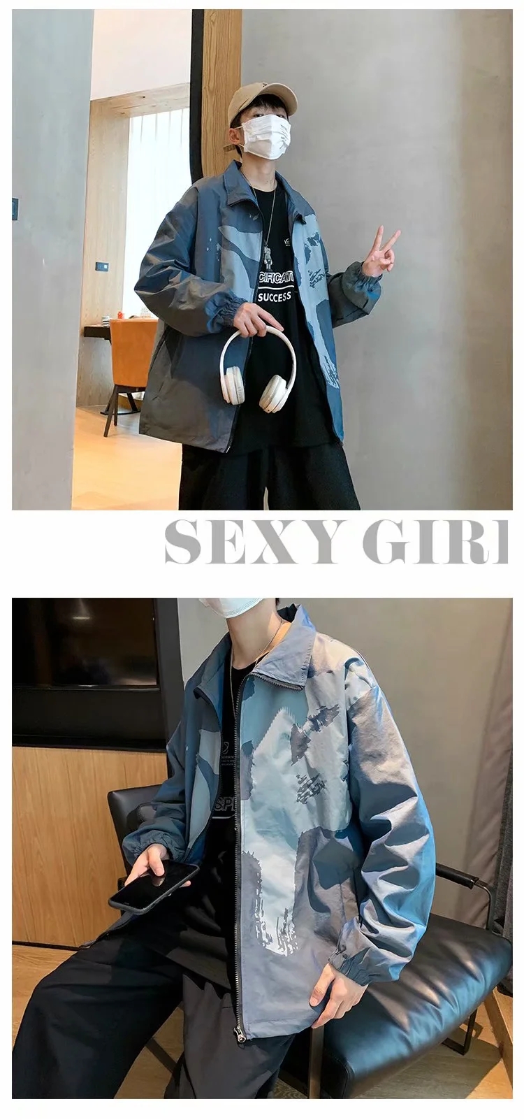 实拍 韩版港风街头潮流印花宽松百搭夹克上衣男日系青年休闲外套