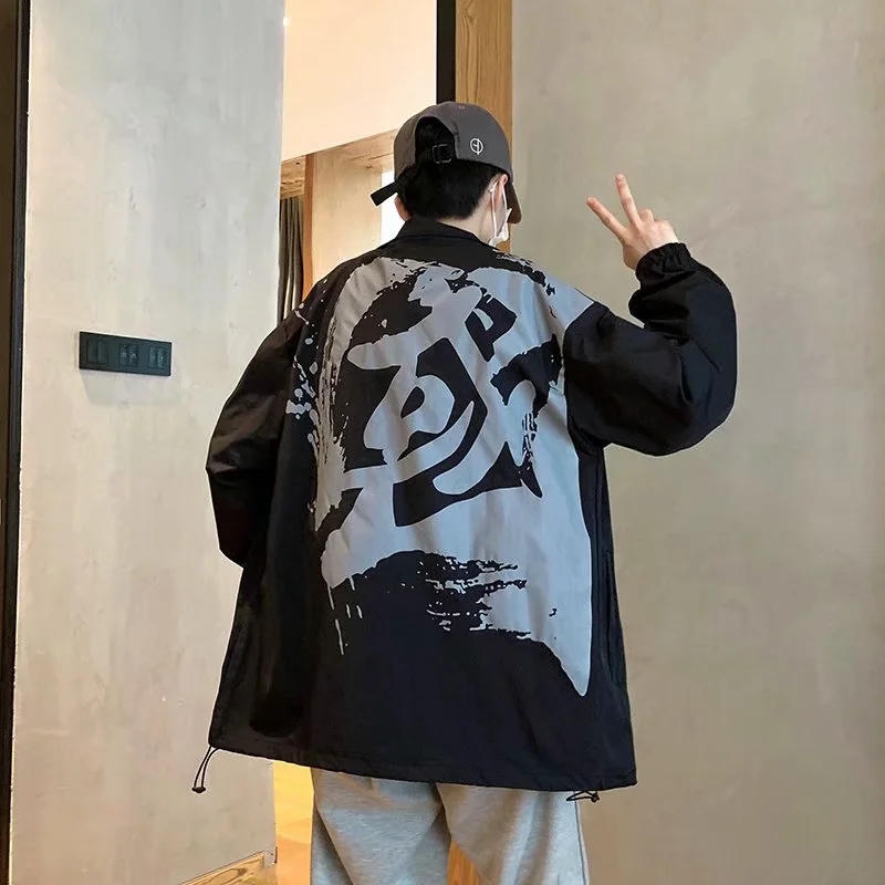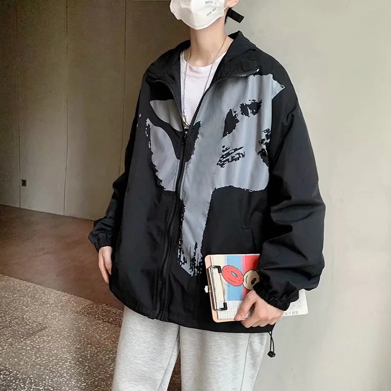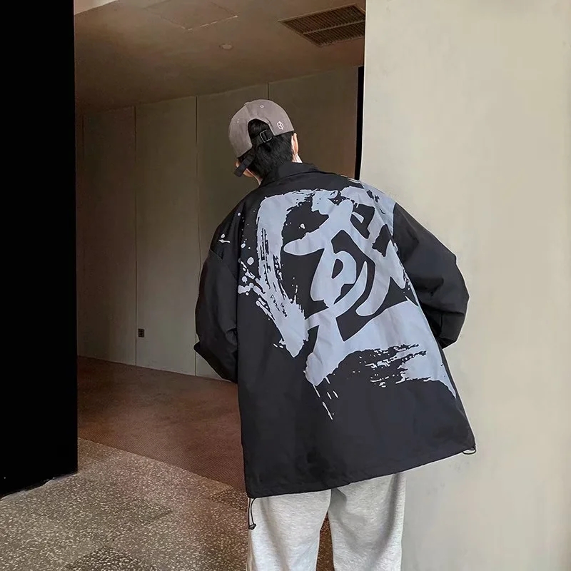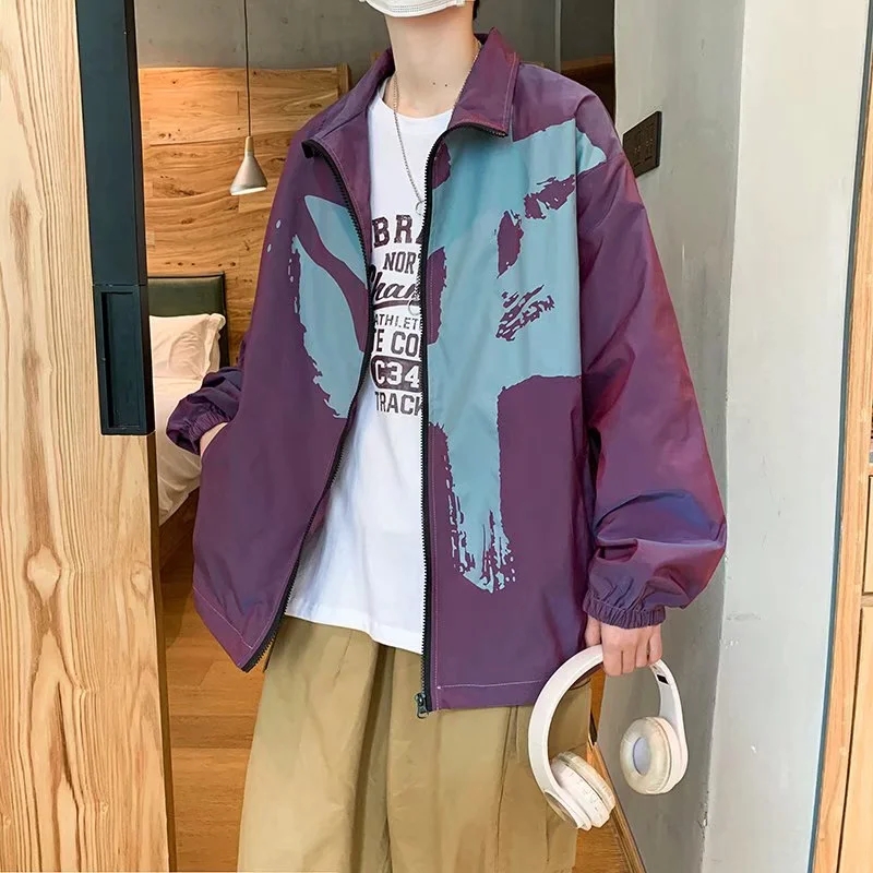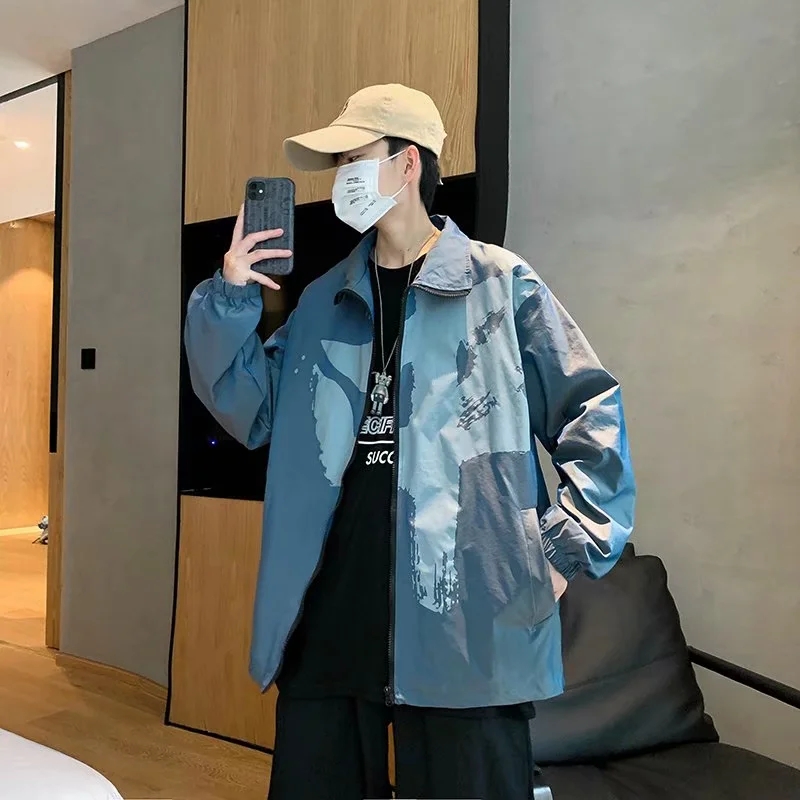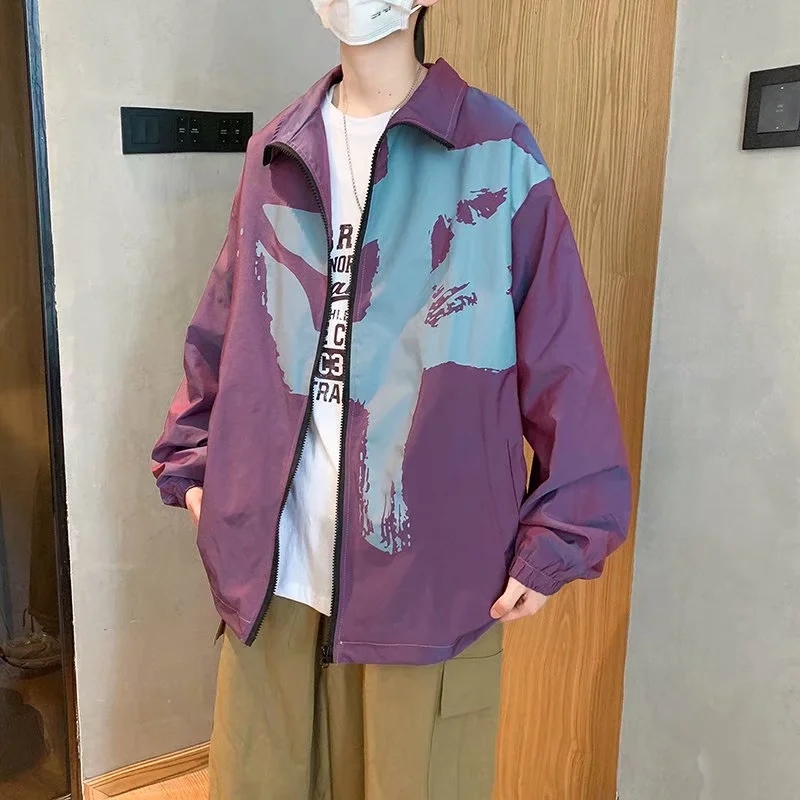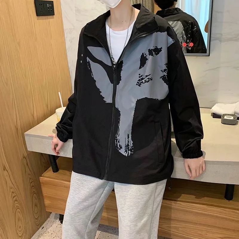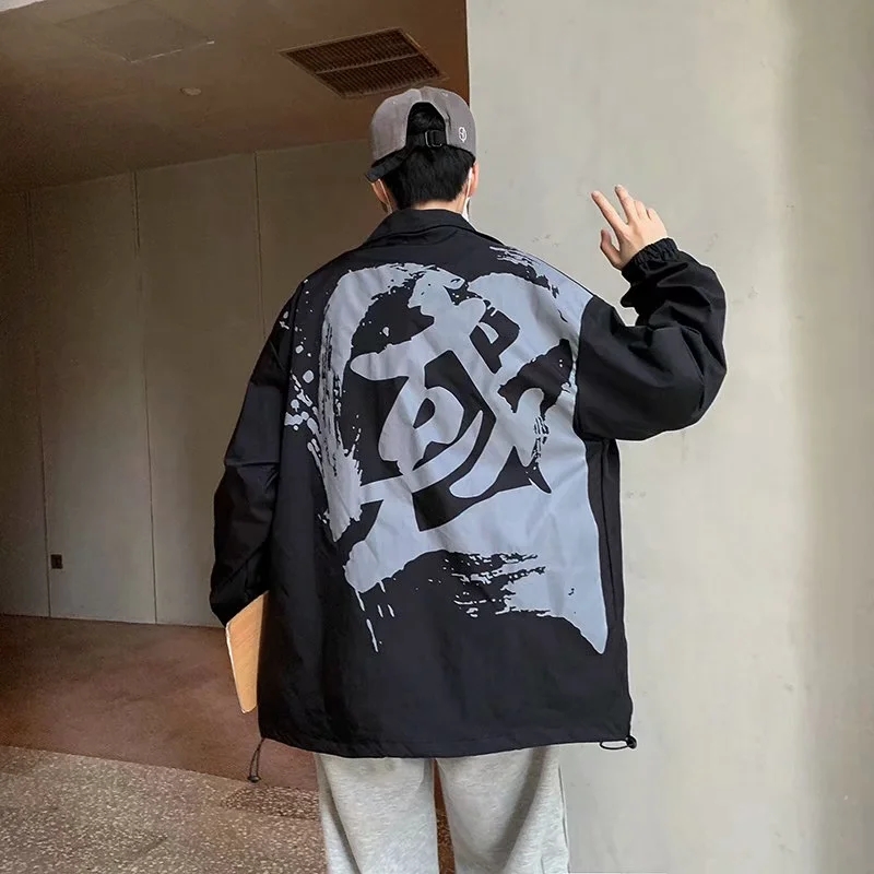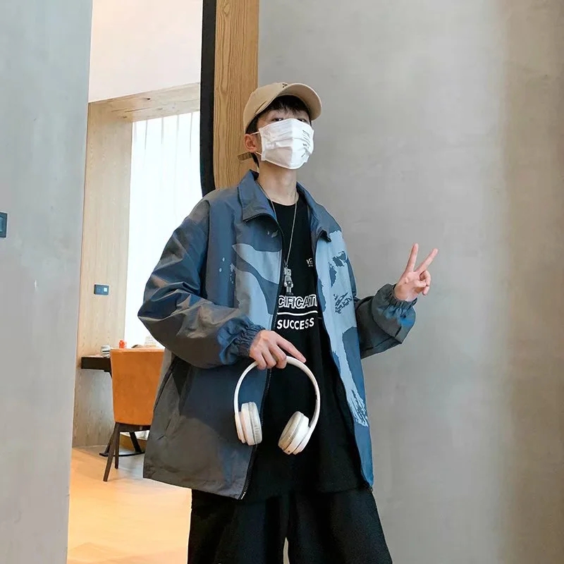 实拍 韩版港风街头潮流印花宽松百搭夹克上衣男日系青年休闲外套