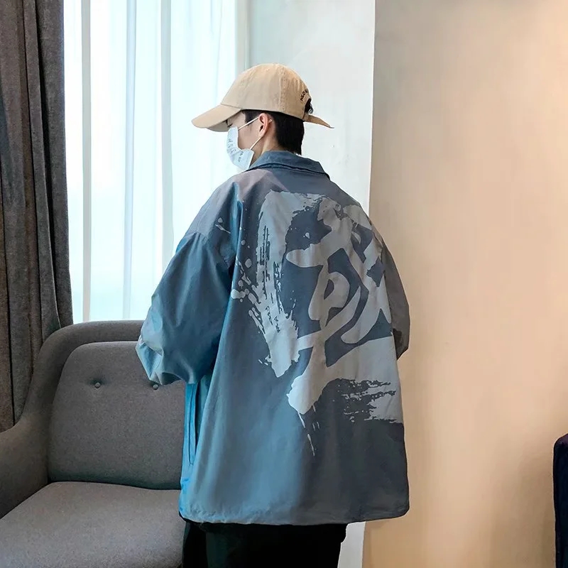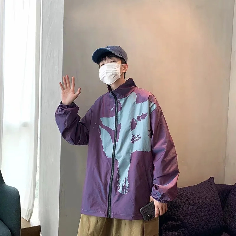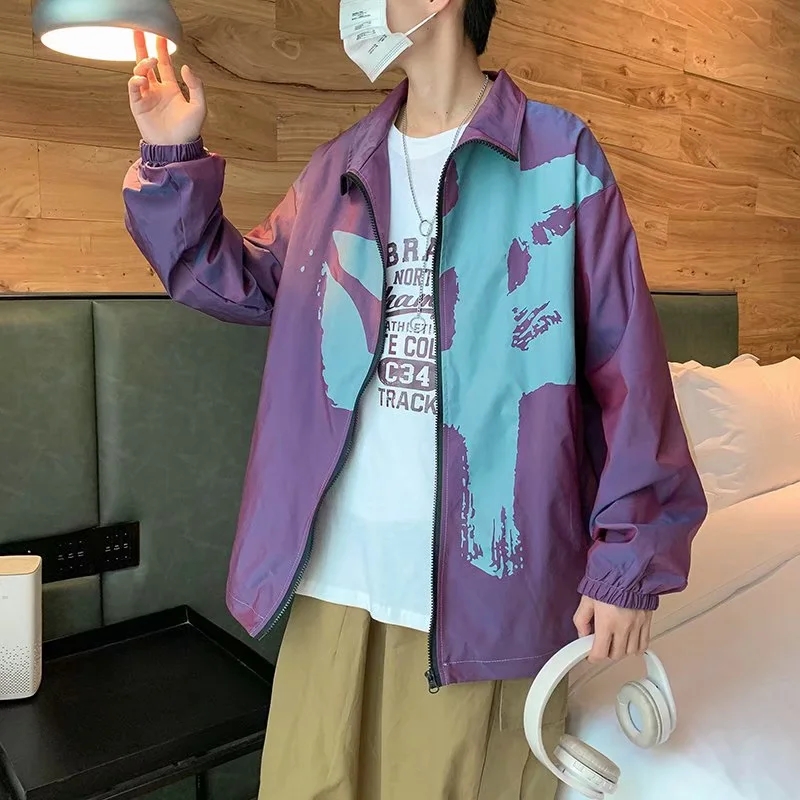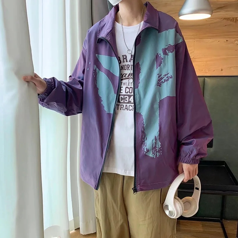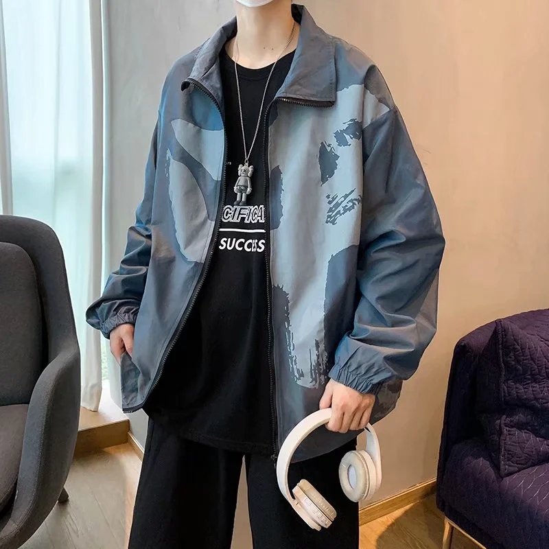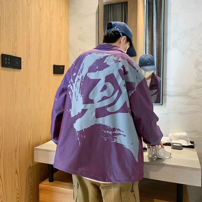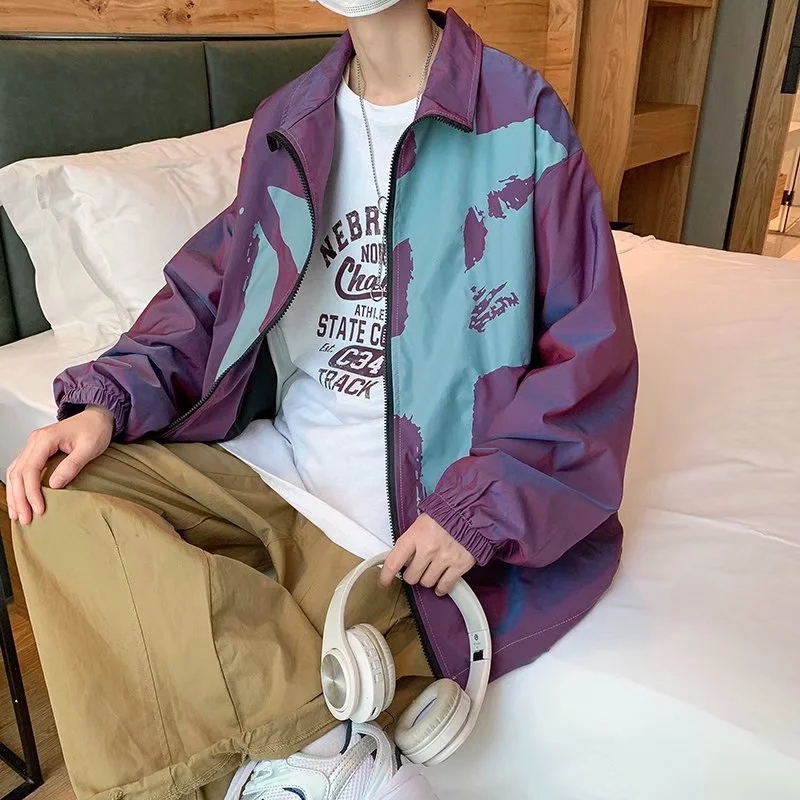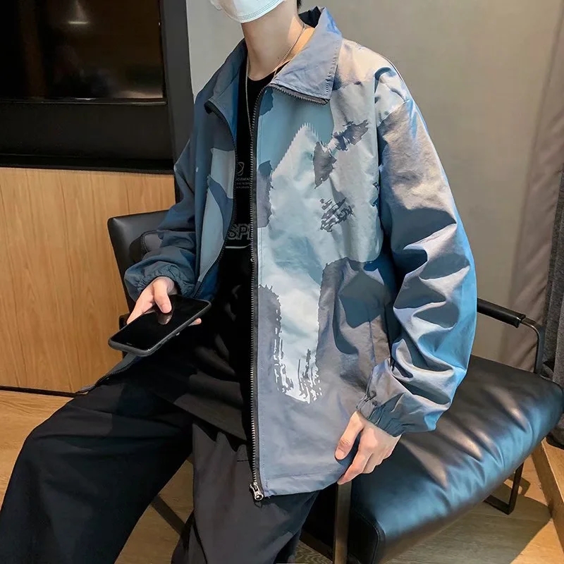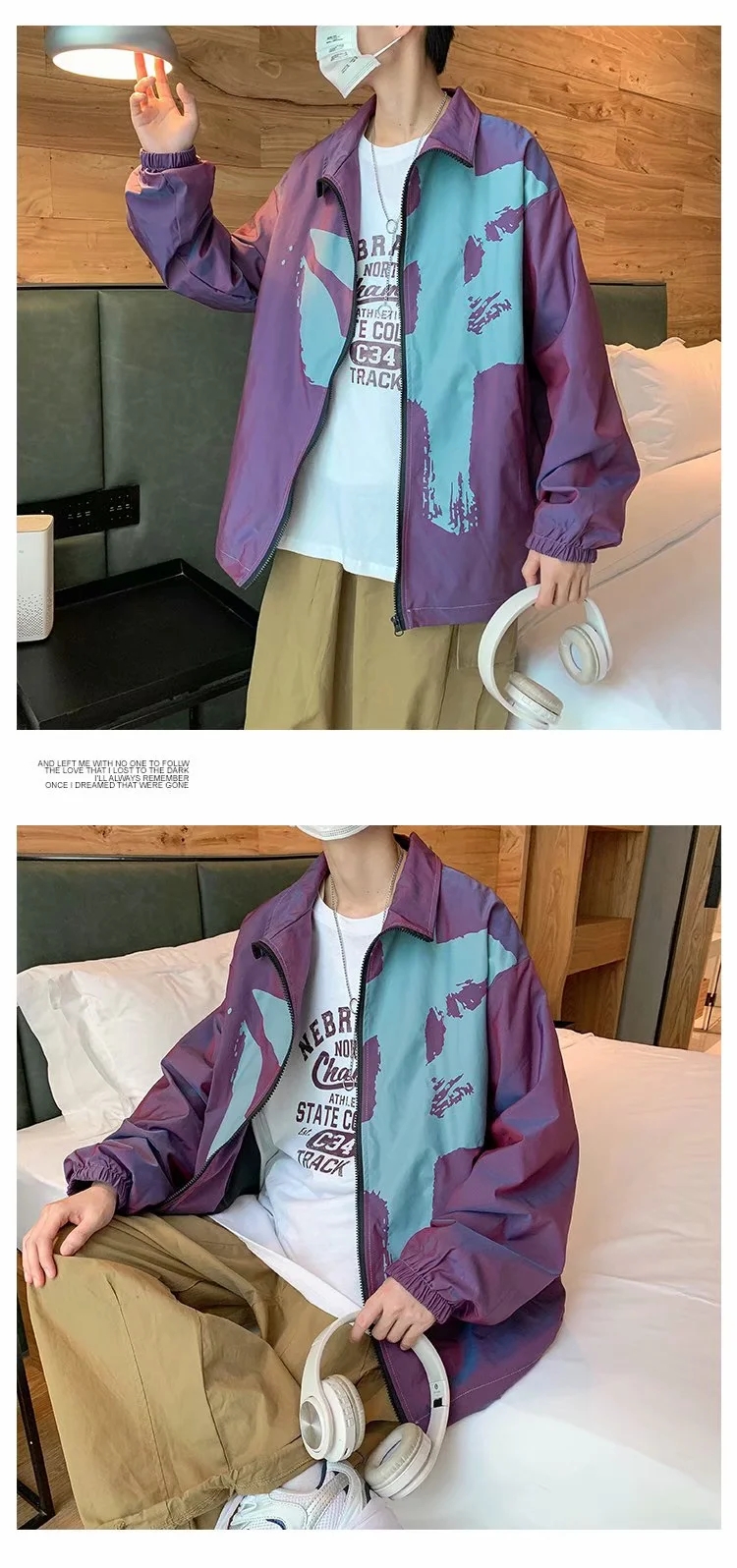 实拍 韩版港风街头潮流印花宽松百搭夹克上衣男日系青年休闲外套