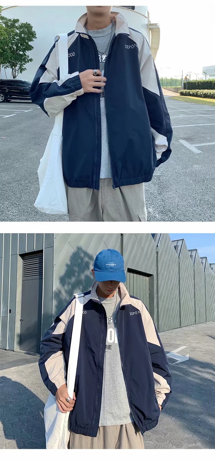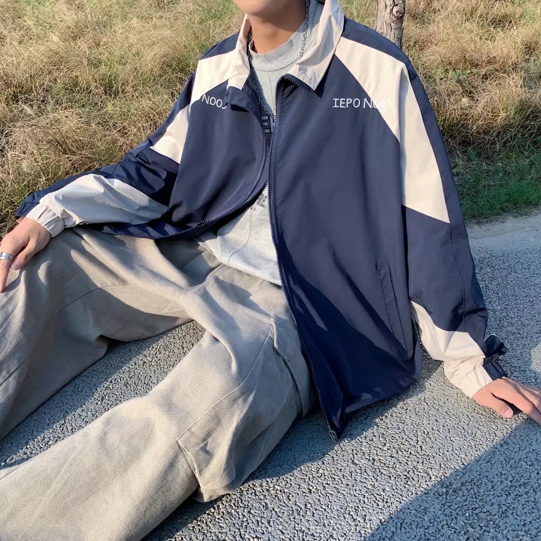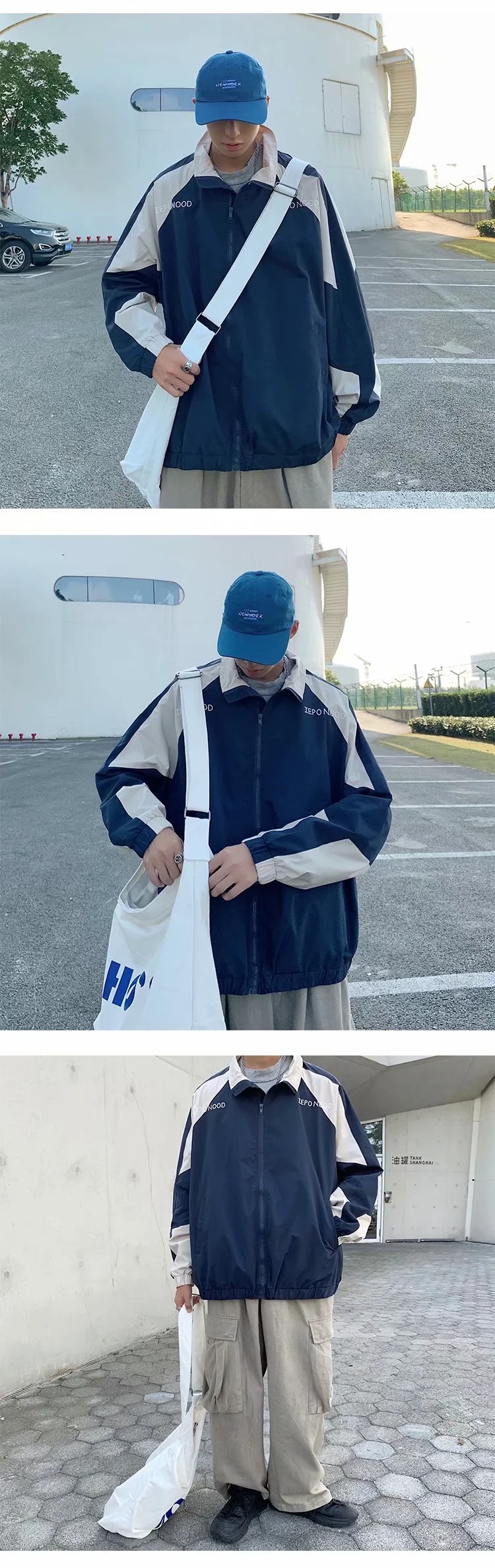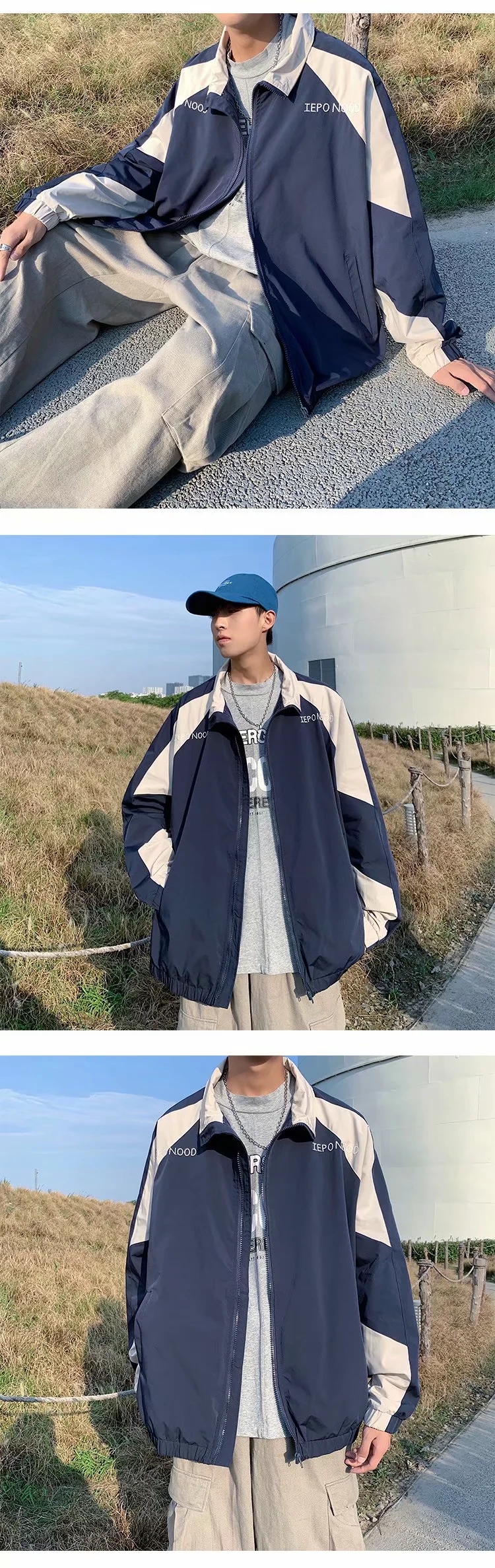 实拍 港风简约街头拼色拼接百搭宽松夹克上衣男韩版日系棒球服潮