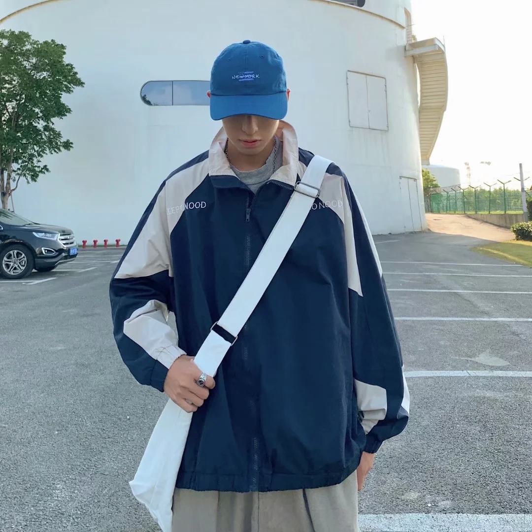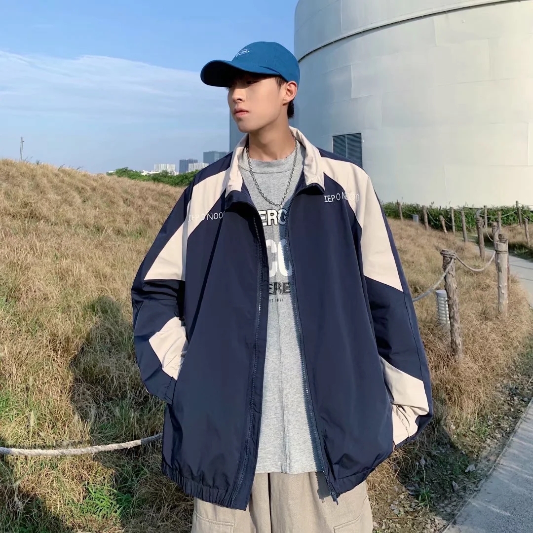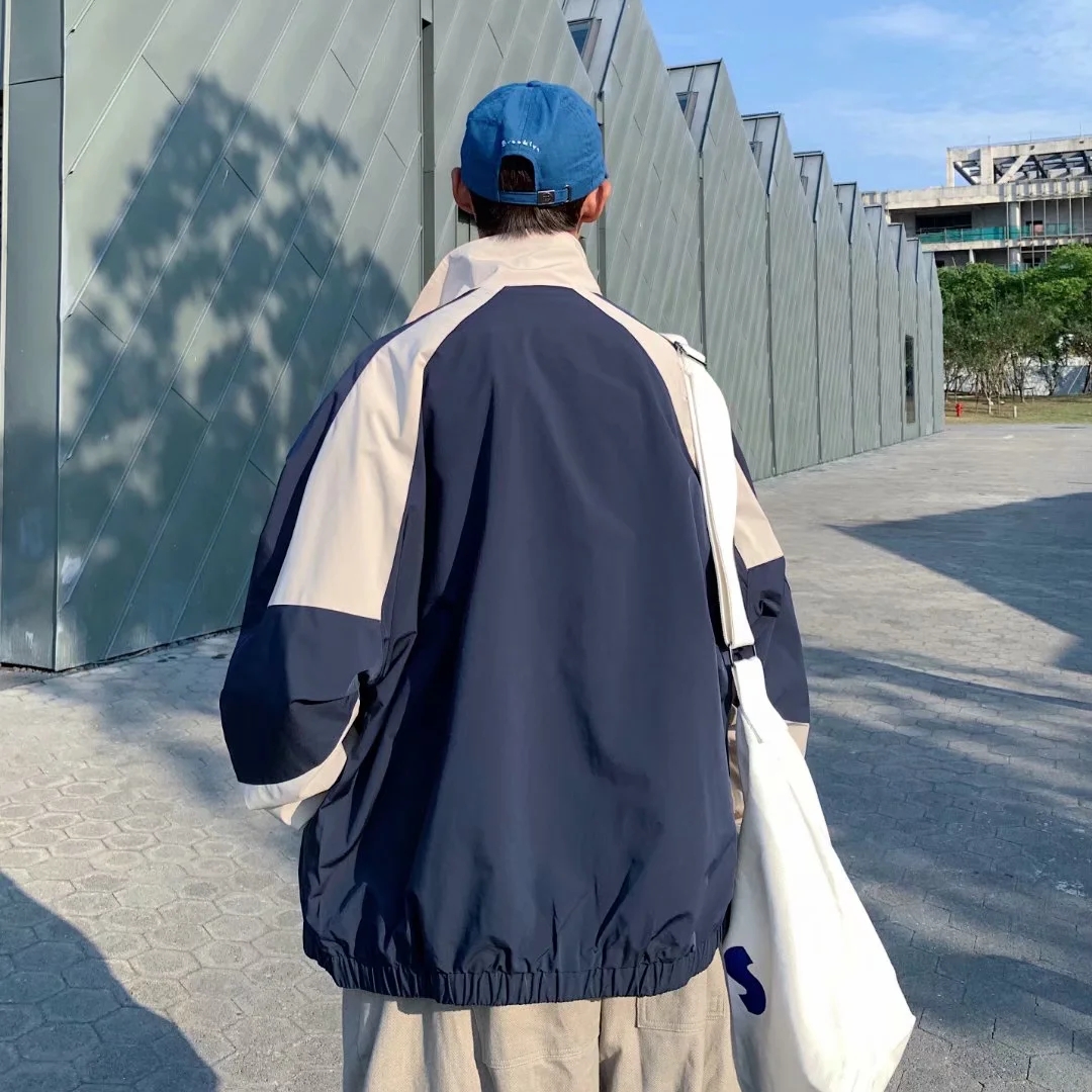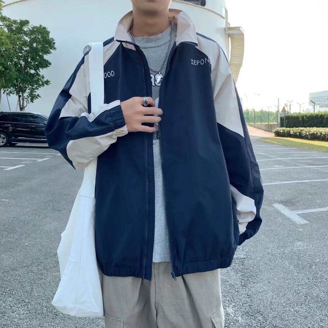 实拍 港风简约街头拼色拼接百搭宽松夹克上衣男韩版日系棒球服潮