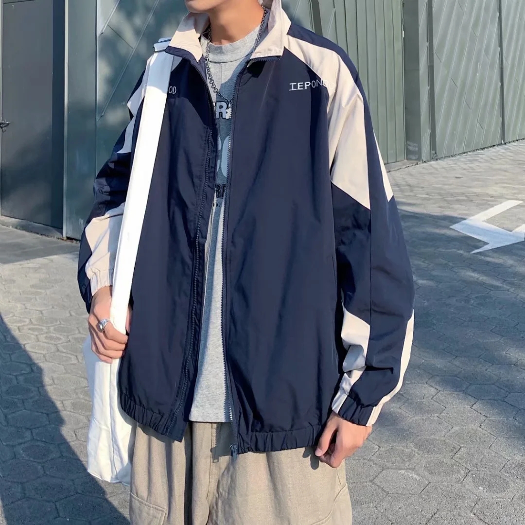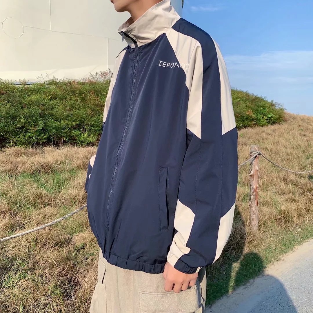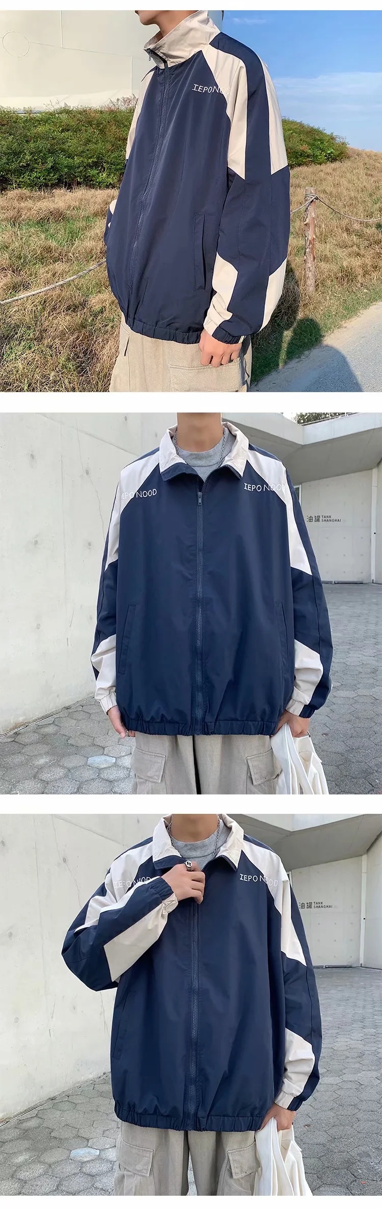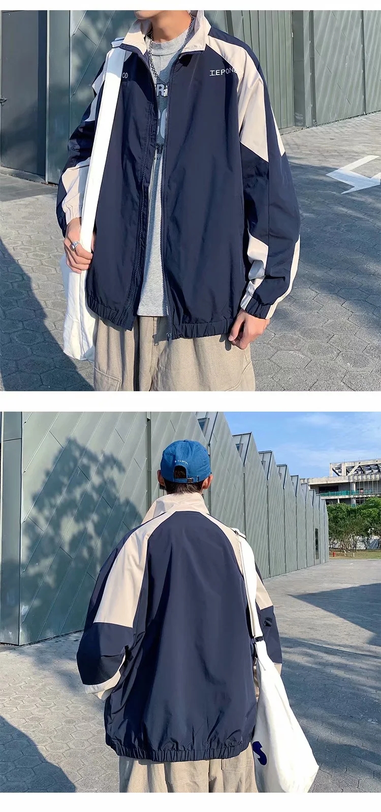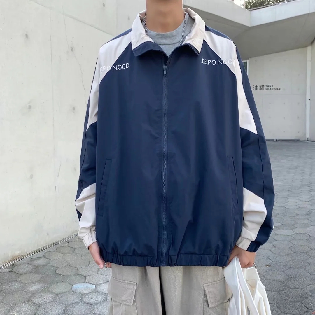 实拍 港风简约街头拼色拼接百搭宽松夹克上衣男韩版日系棒球服潮
