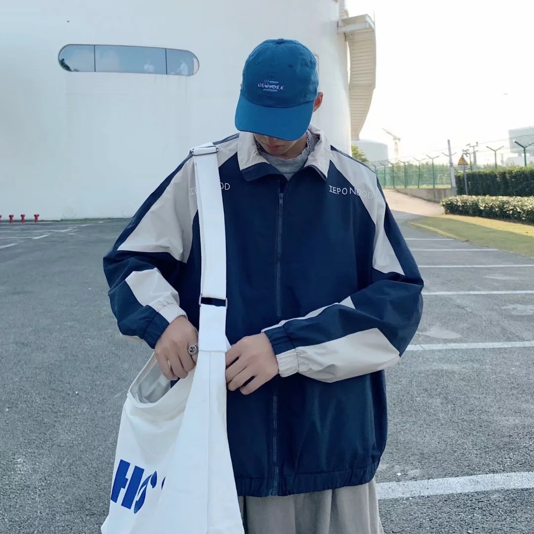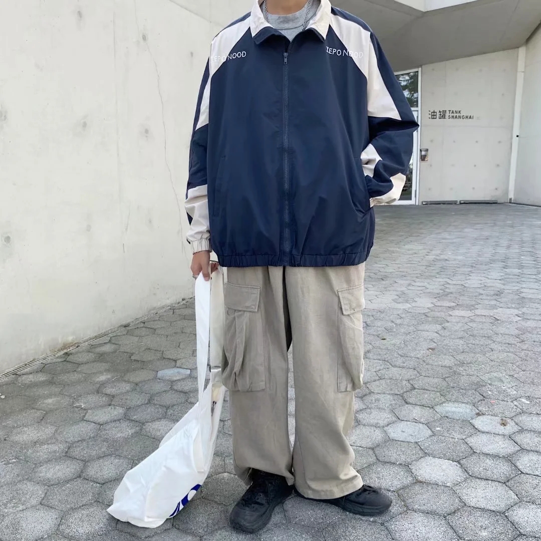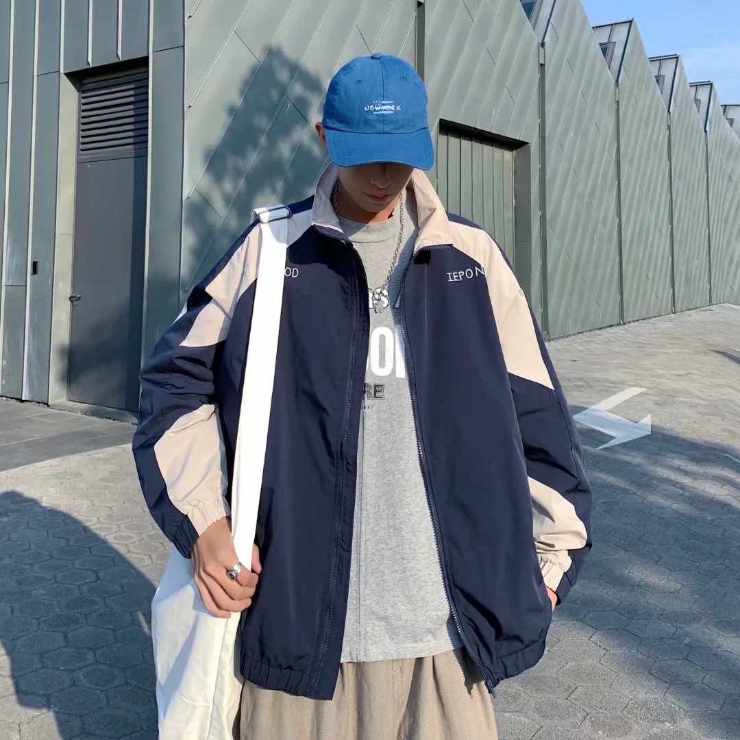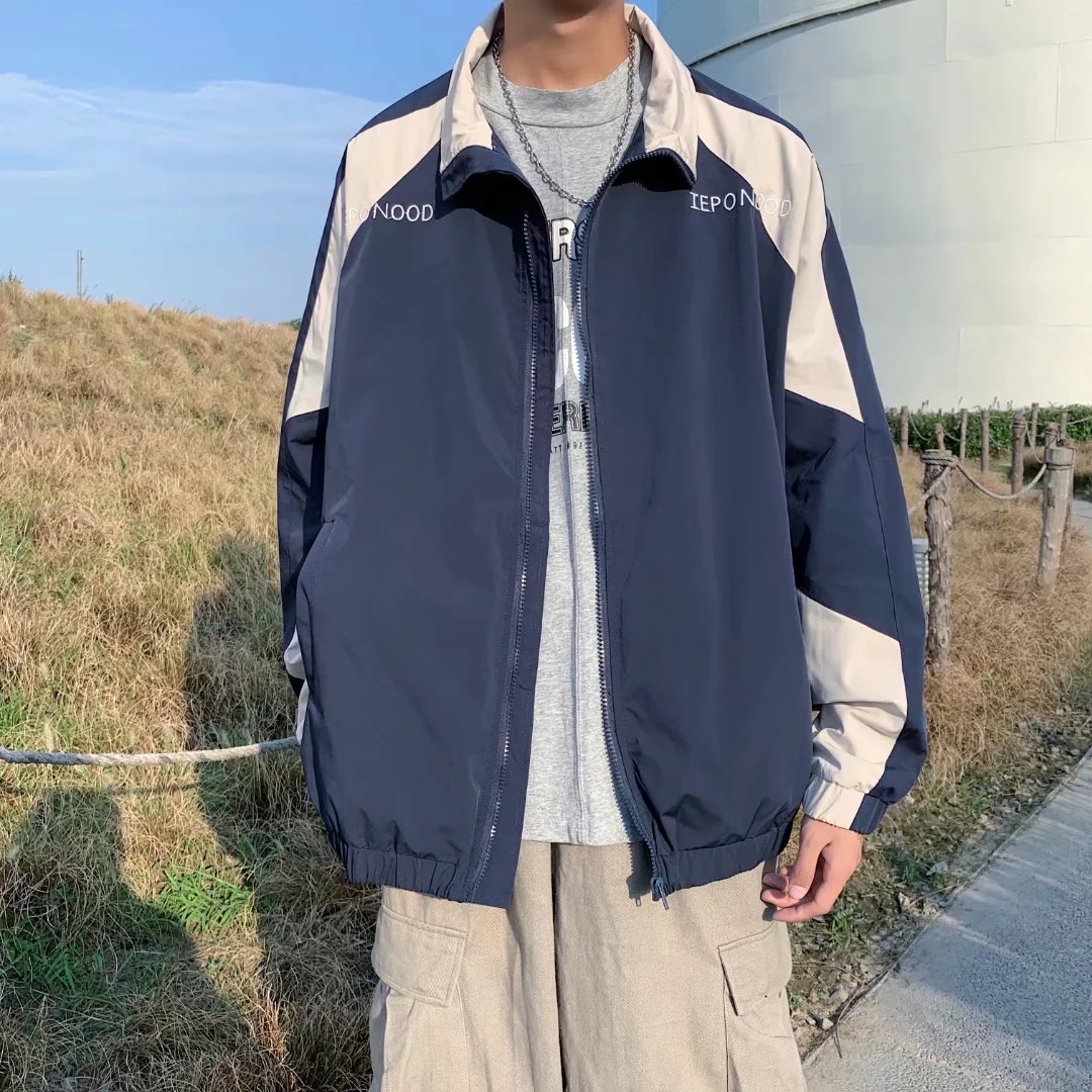 实拍 港风简约街头拼色拼接百搭宽松夹克上衣男韩版日系棒球服潮
