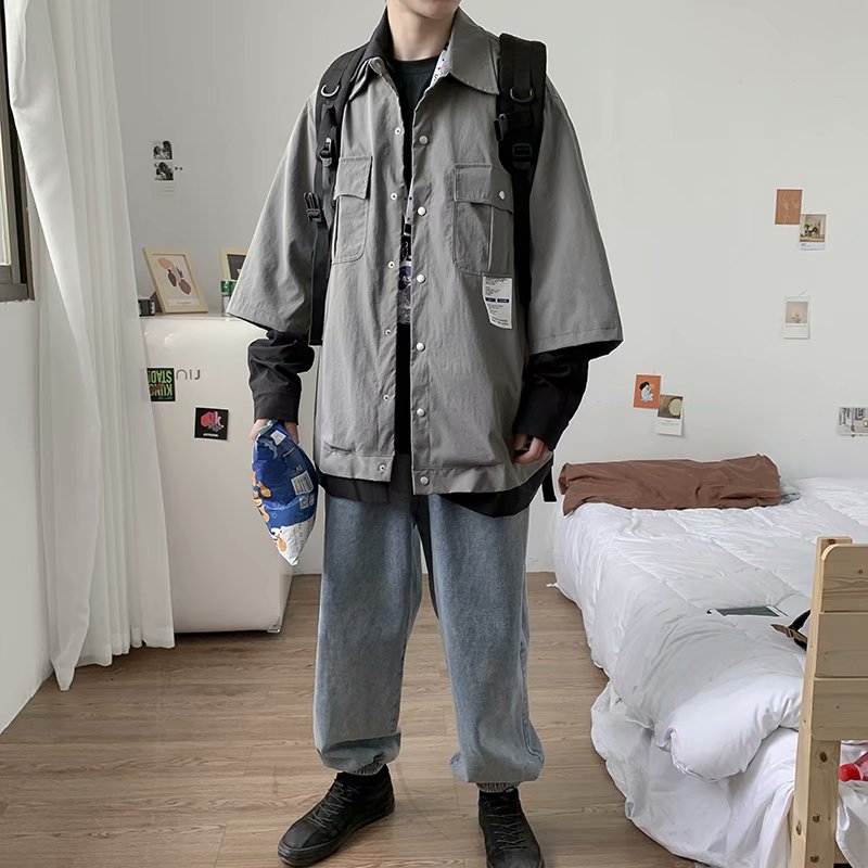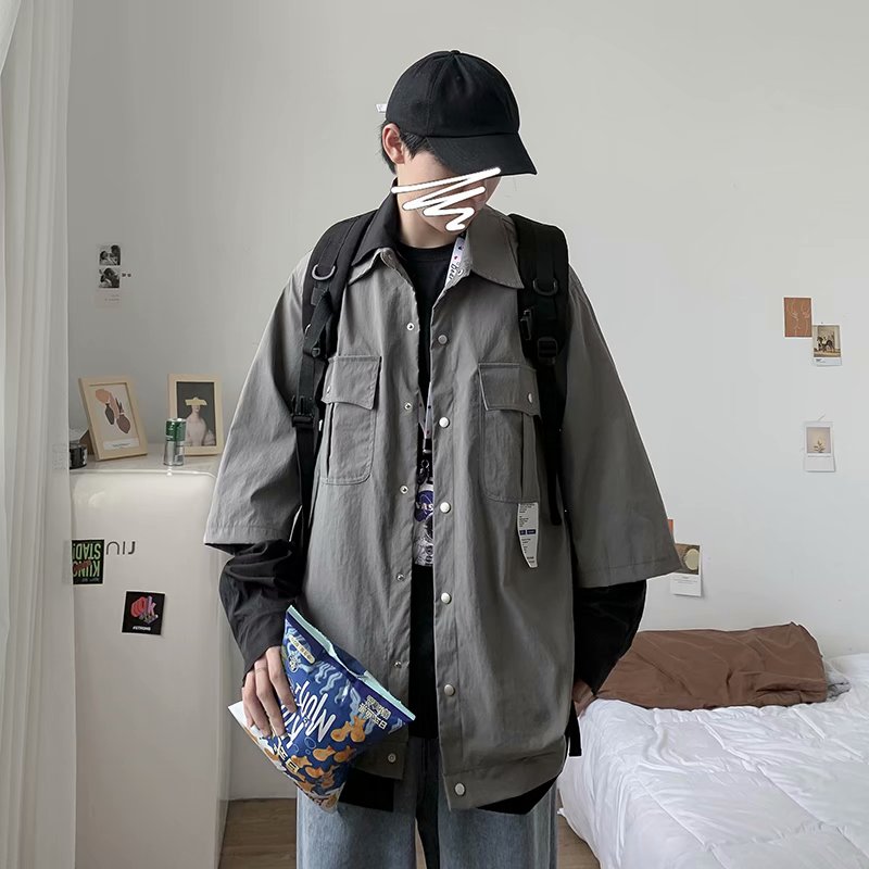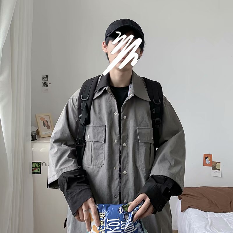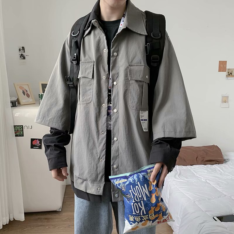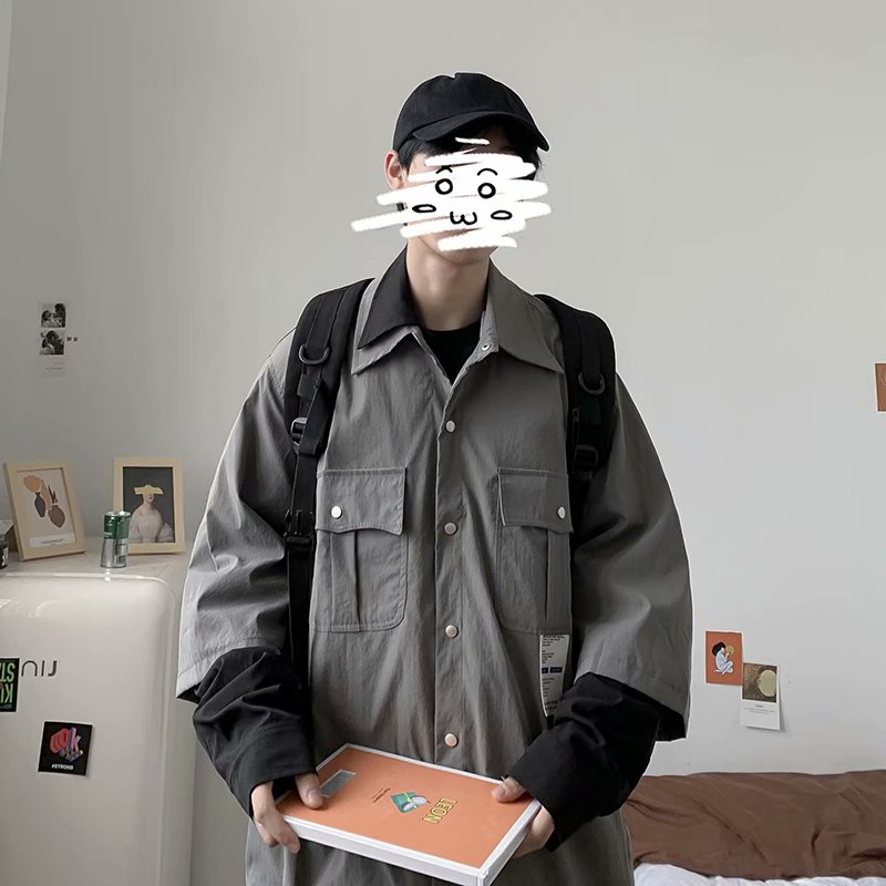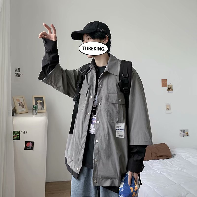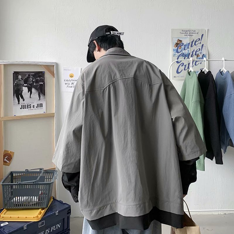 实拍 日系纯色百搭假两件简约港风宽松街头夹克上衣韩版休闲外套