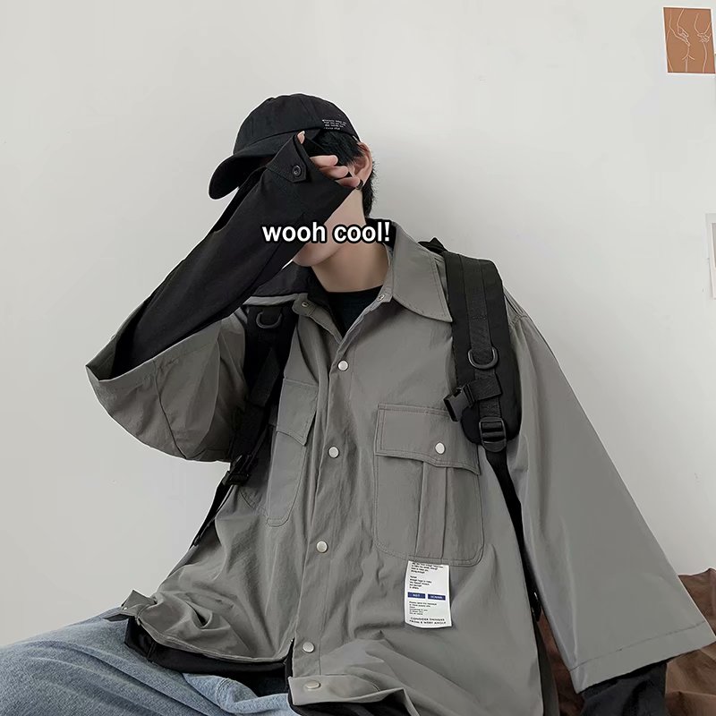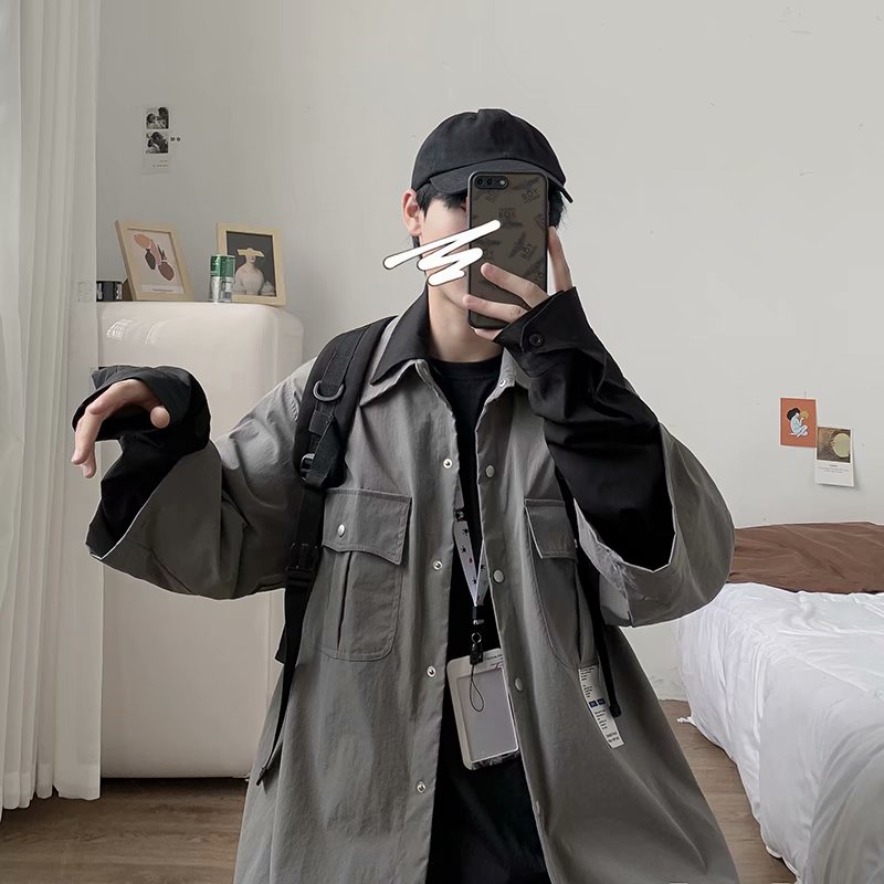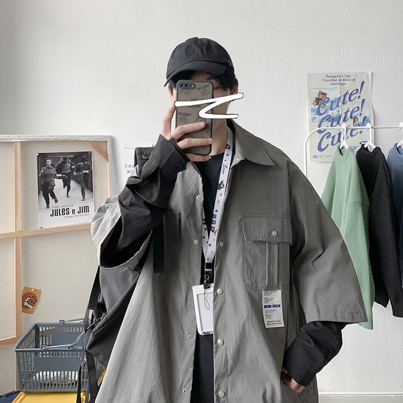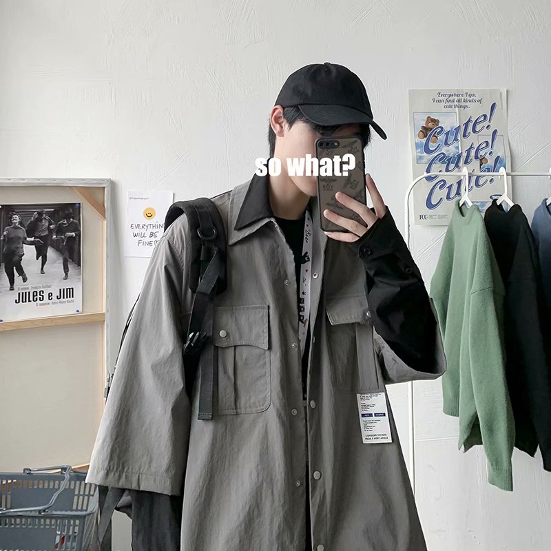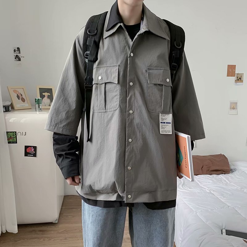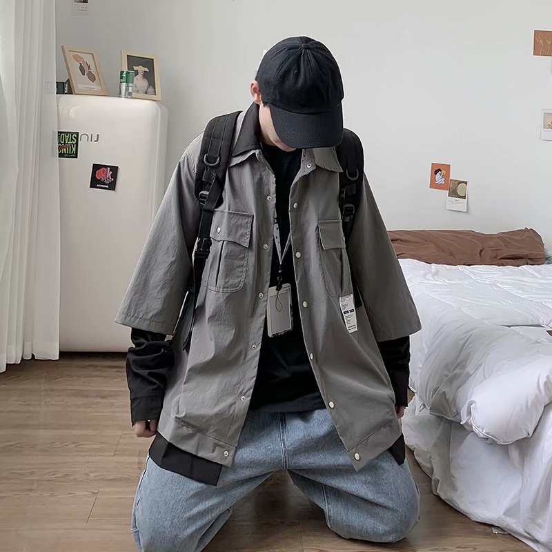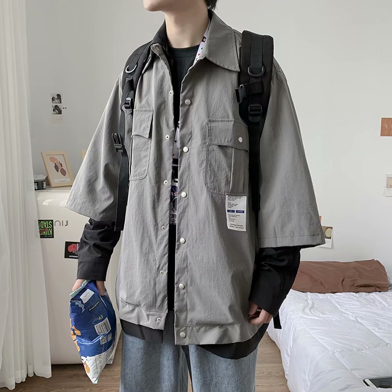实拍 日系纯色百搭假两件简约港风宽松街头夹克上衣韩版休闲外套