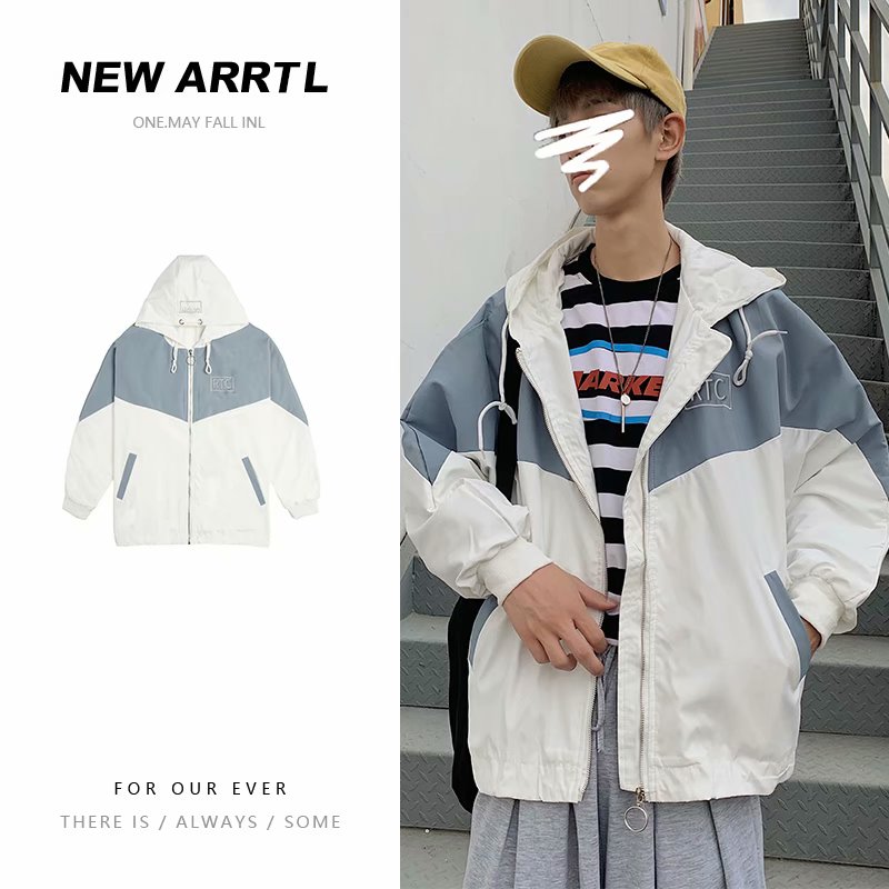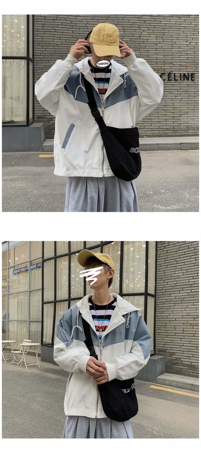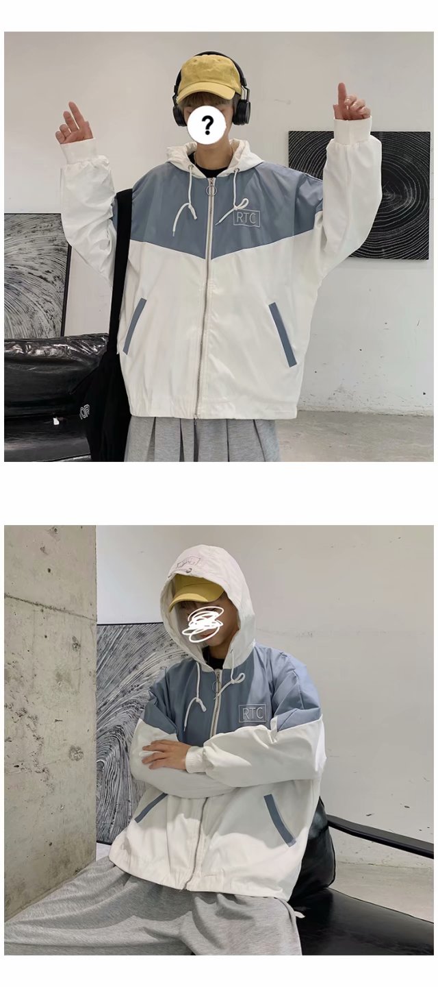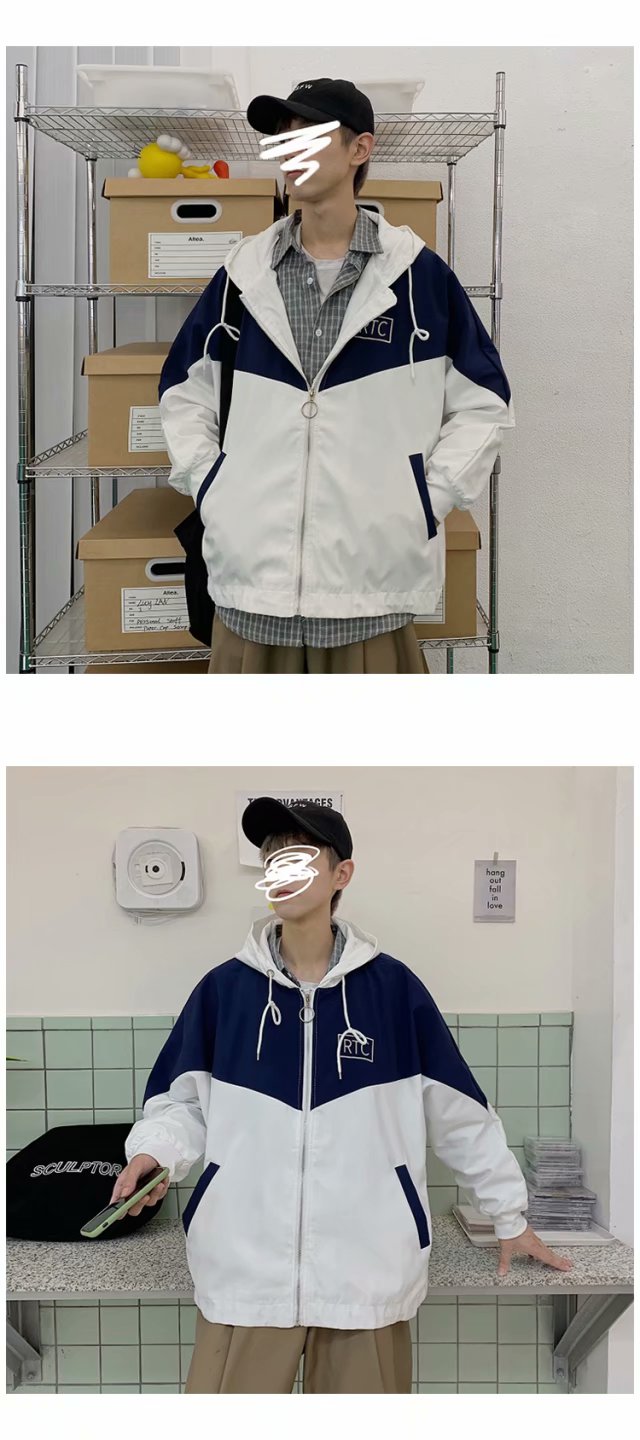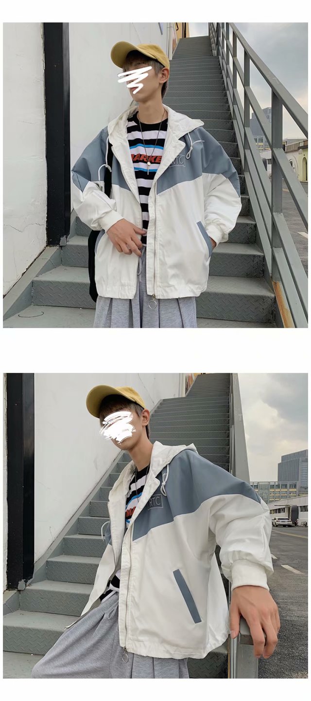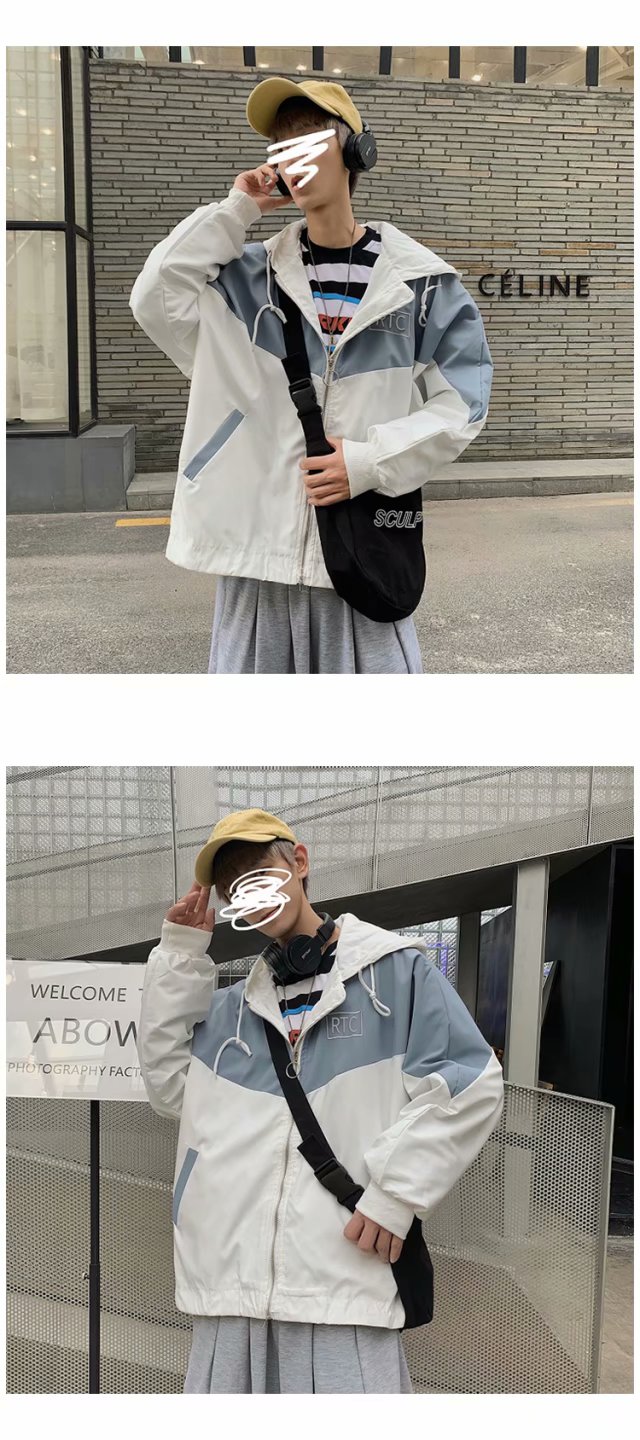 实拍 韩版街头日系青年宽松拼色上衣港风抽绳连帽百搭学生外套潮