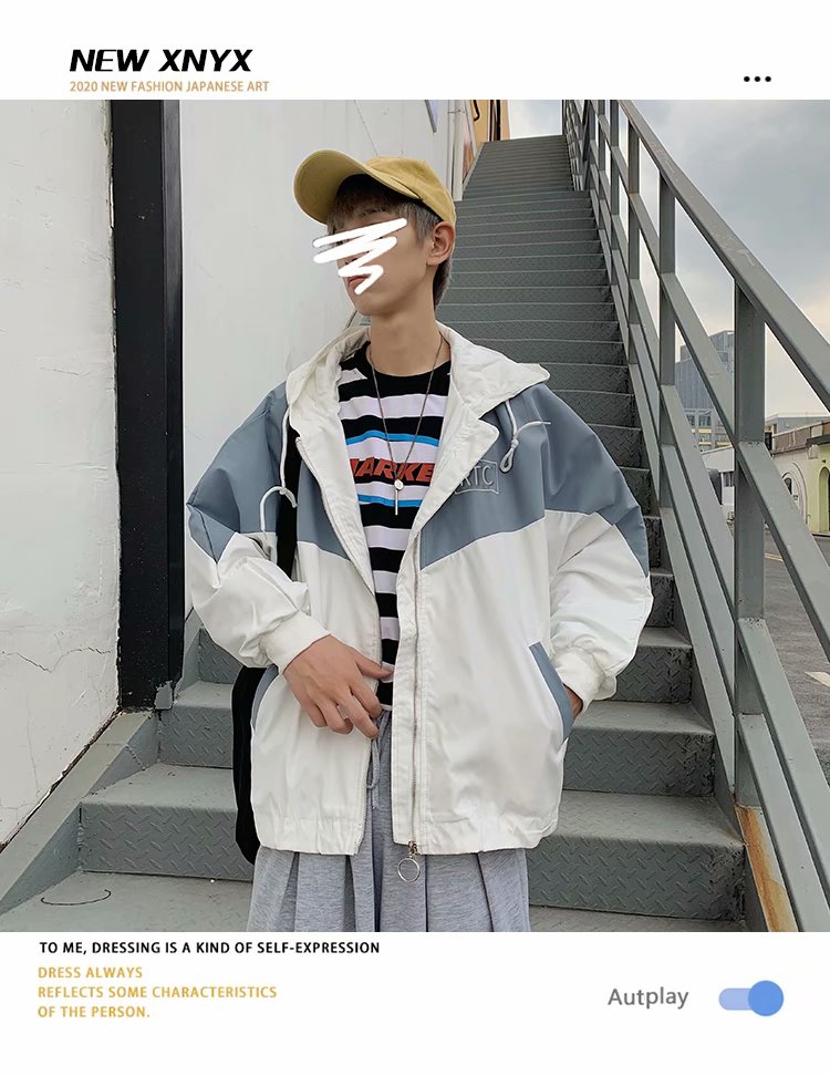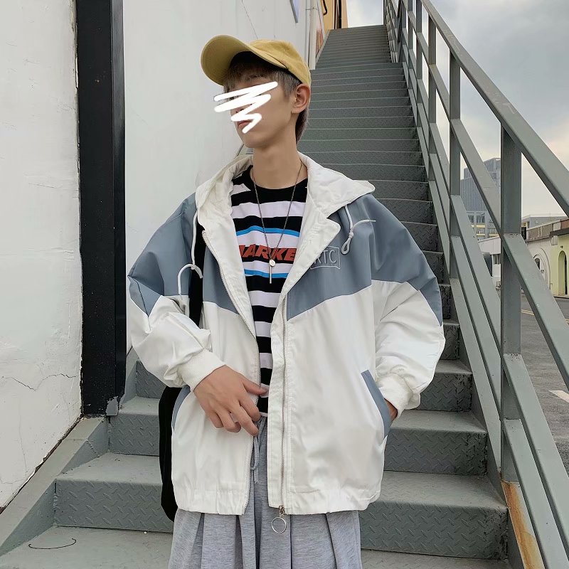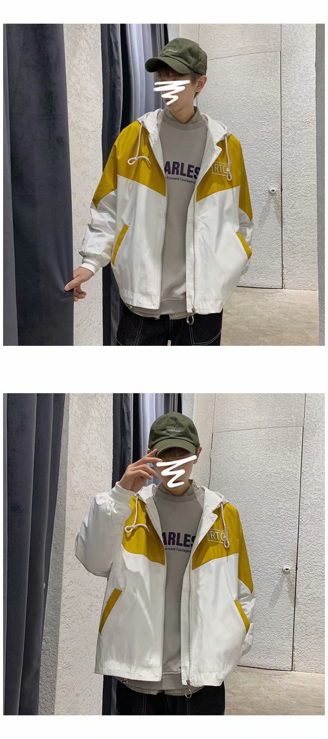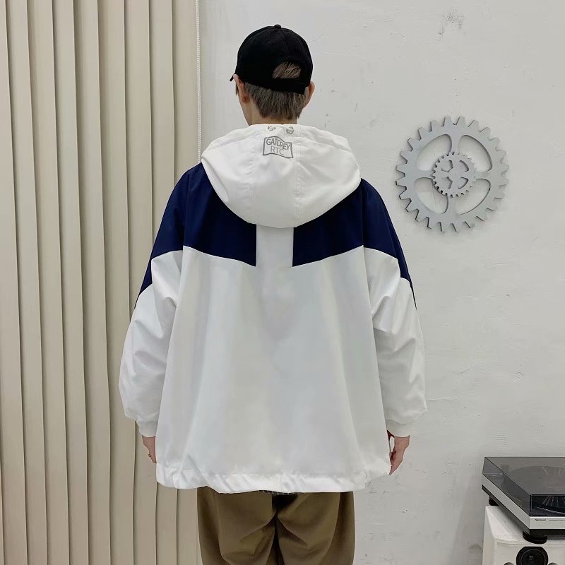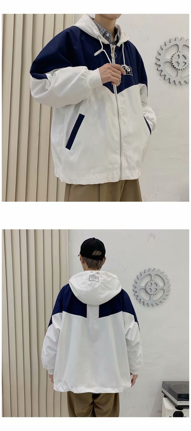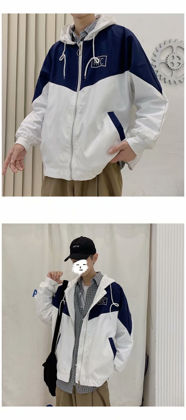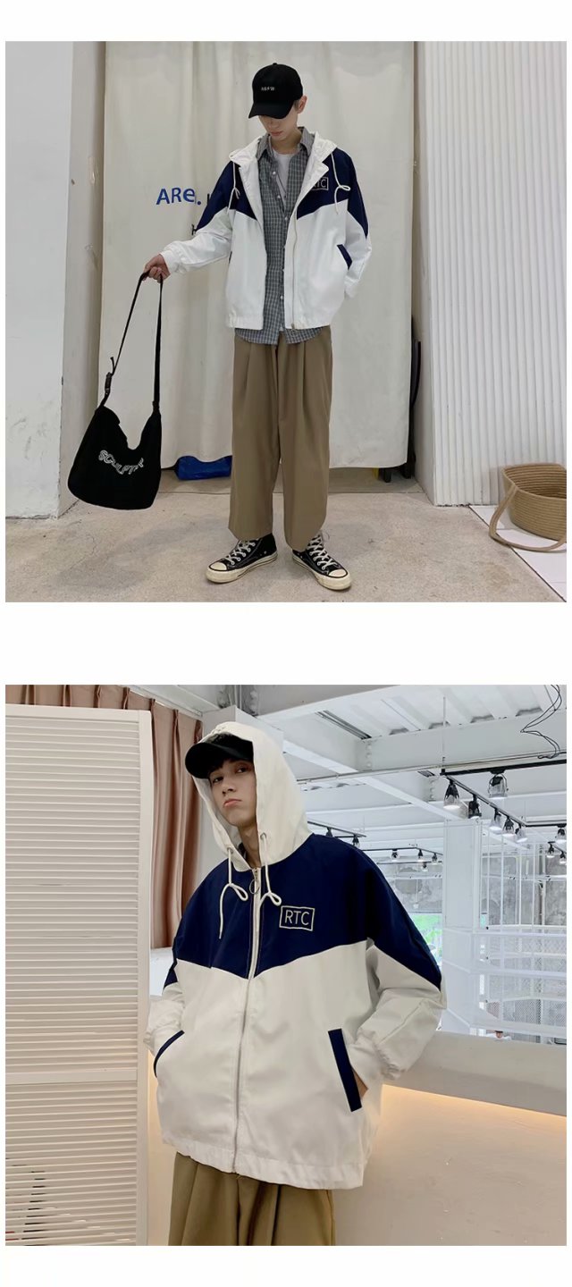 实拍 韩版街头日系青年宽松拼色上衣港风抽绳连帽百搭学生外套潮