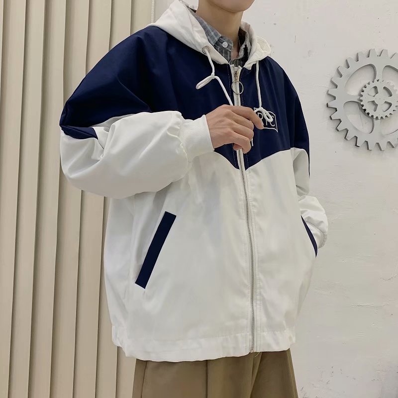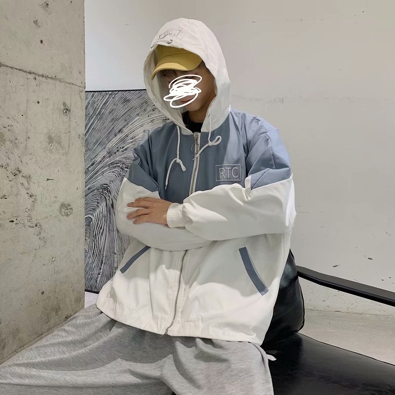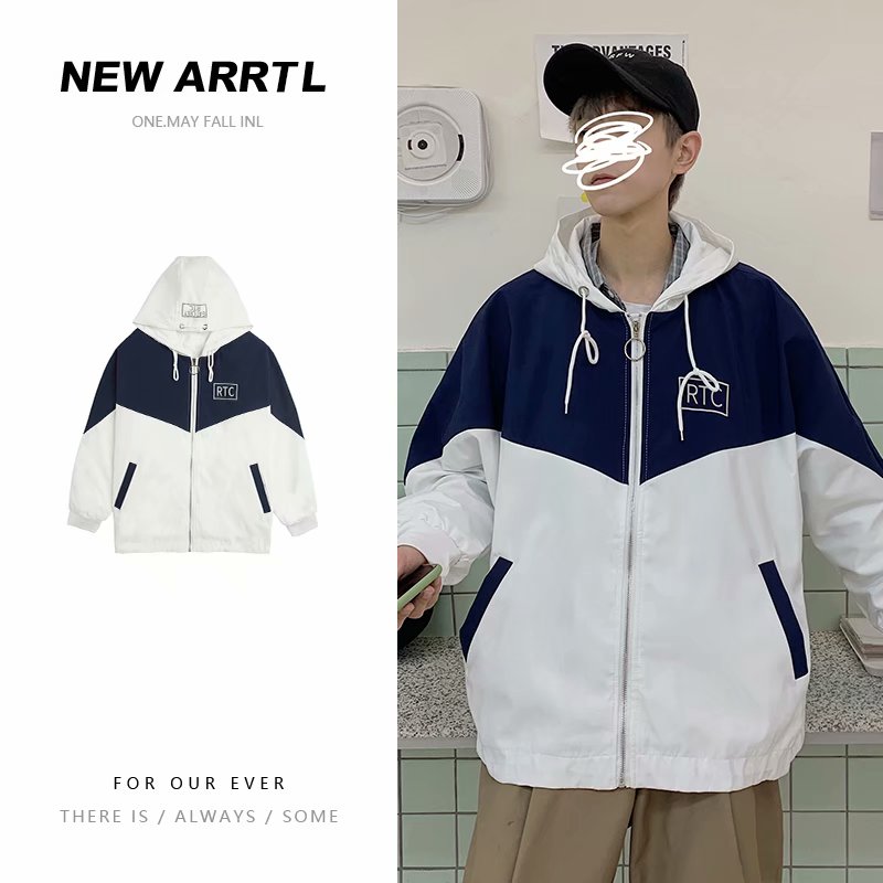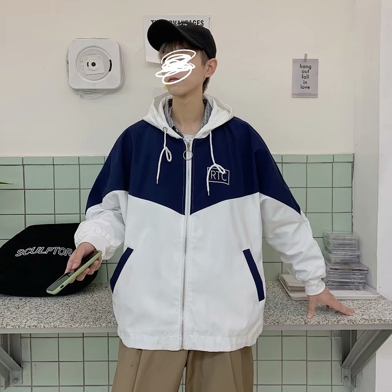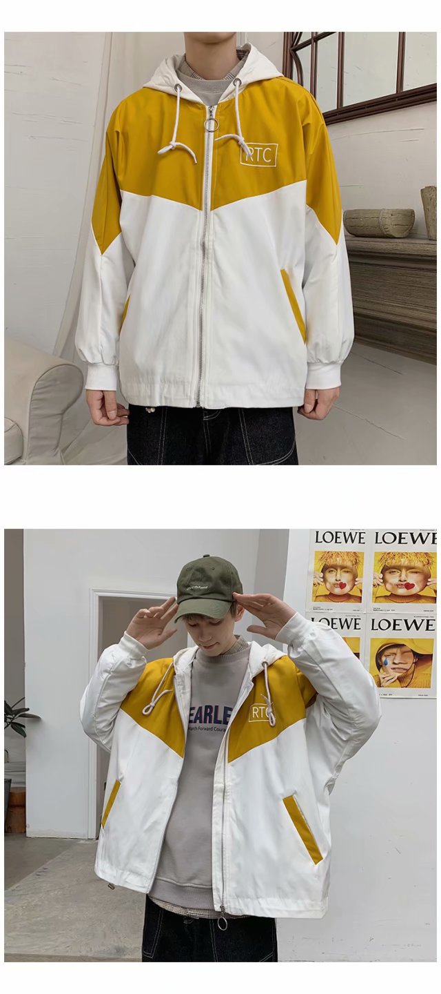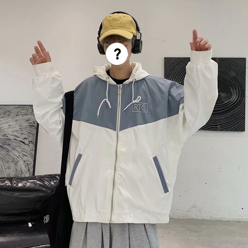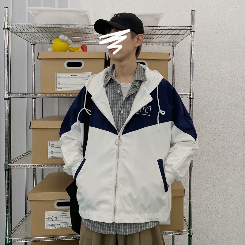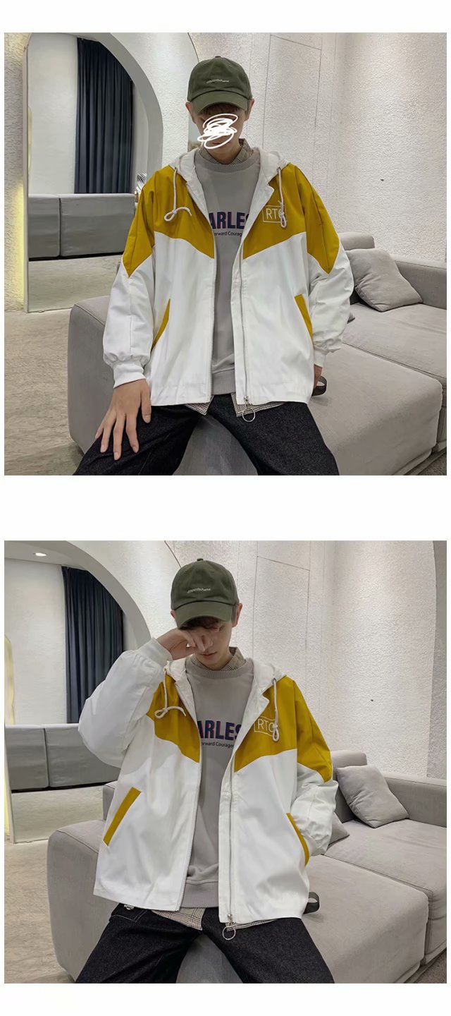 实拍 韩版街头日系青年宽松拼色上衣港风抽绳连帽百搭学生外套潮