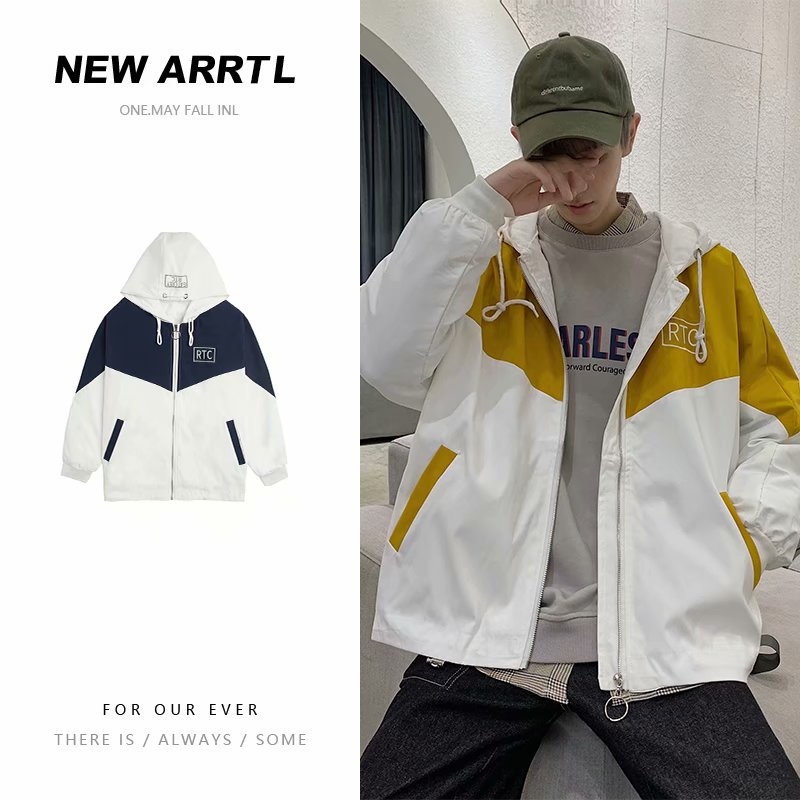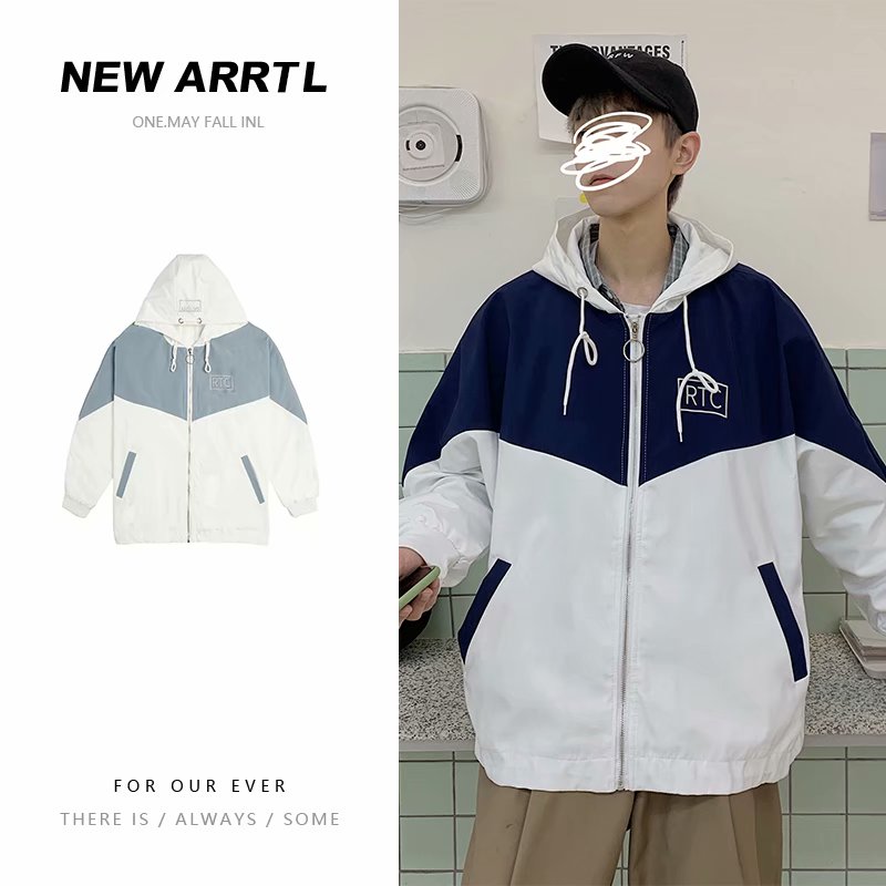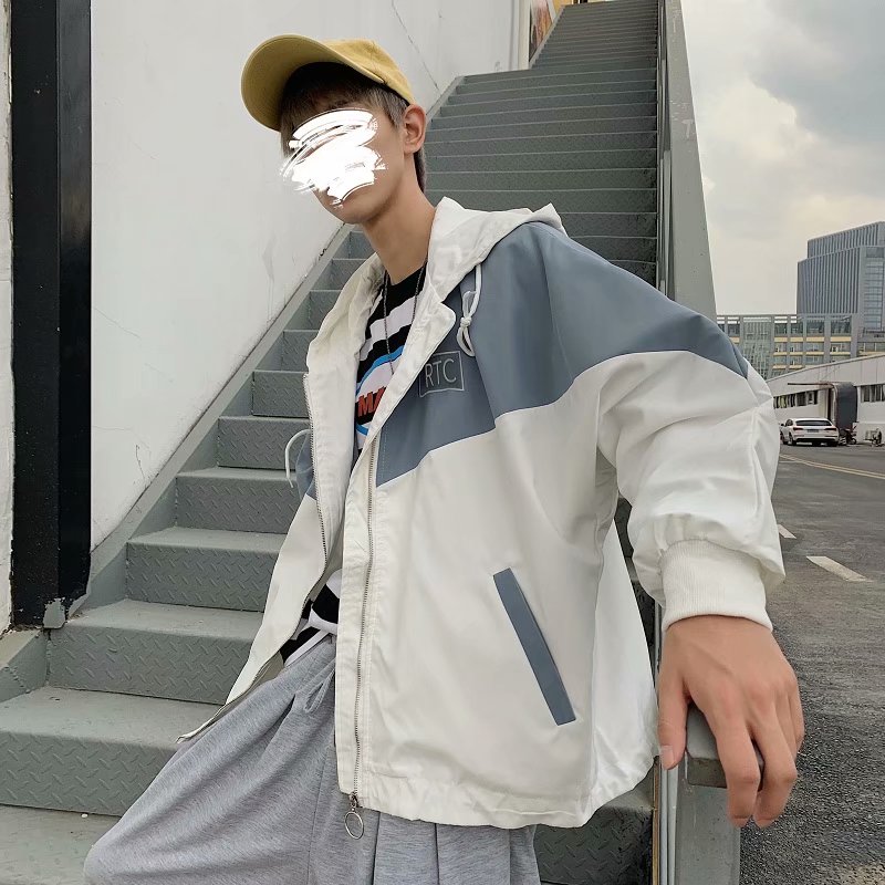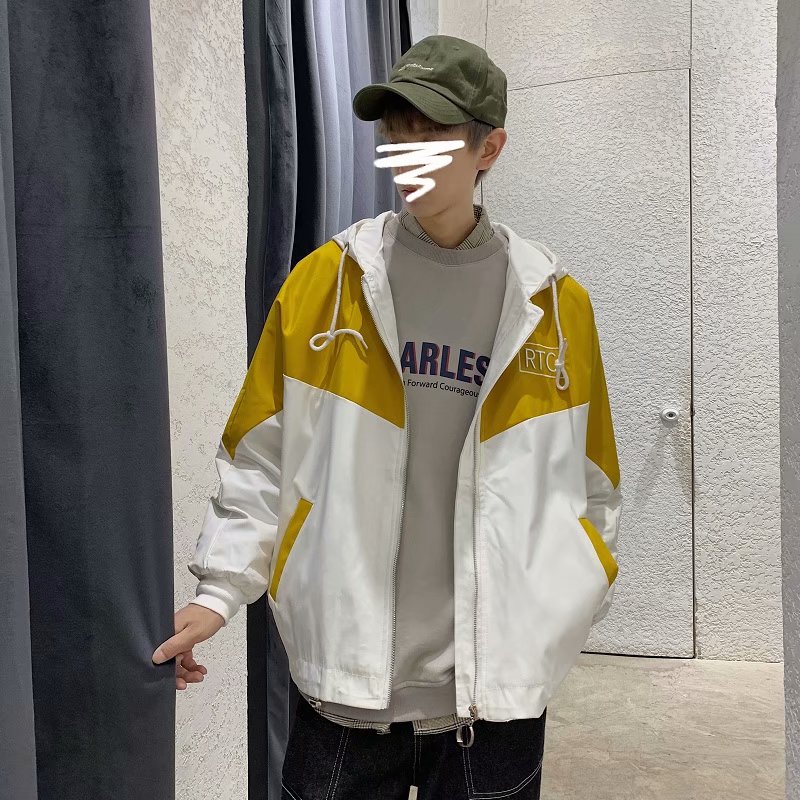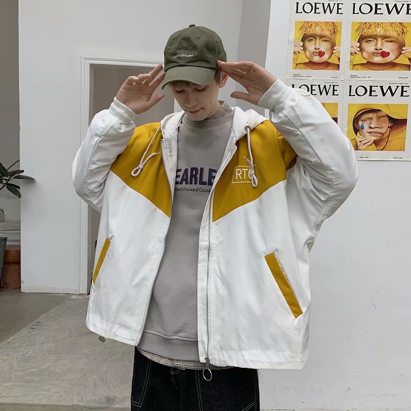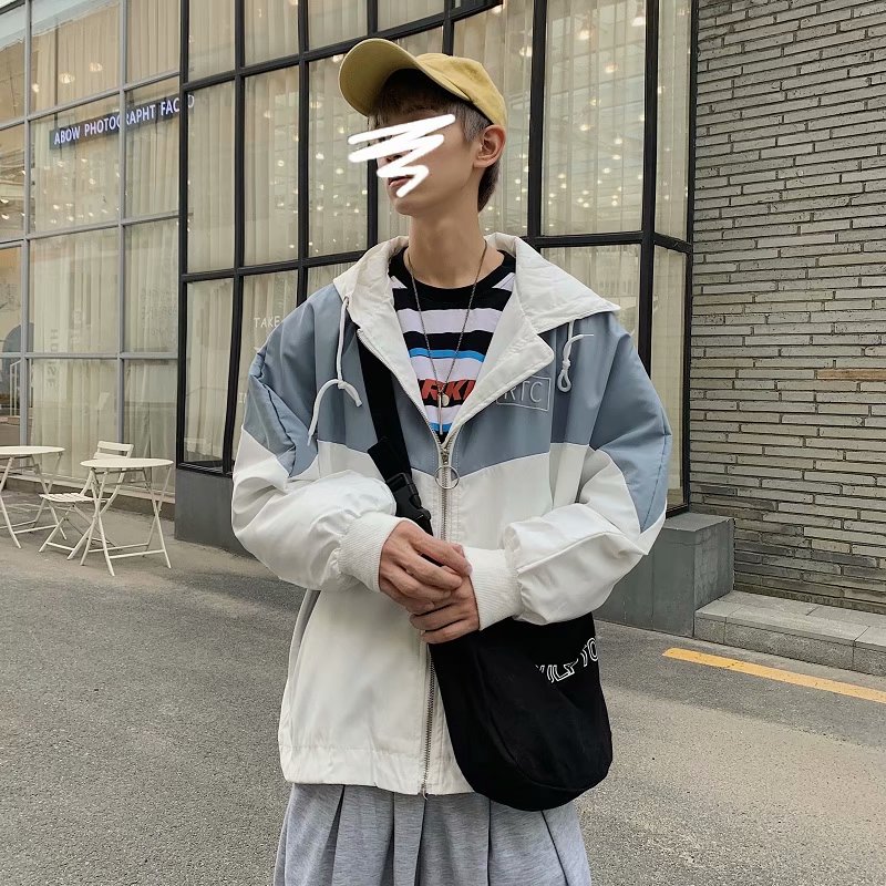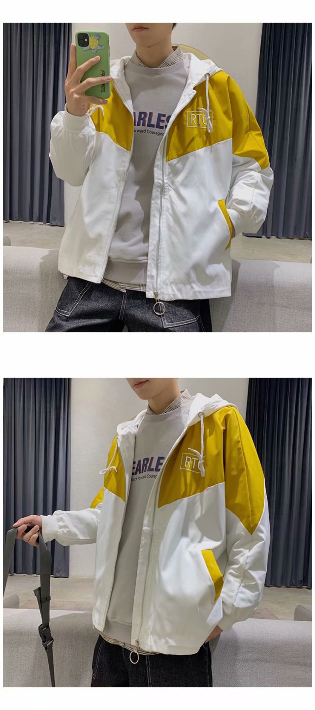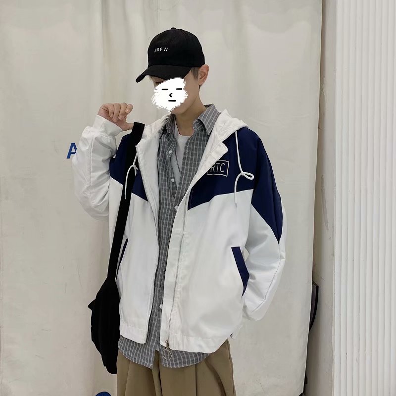 实拍 韩版街头日系青年宽松拼色上衣港风抽绳连帽百搭学生外套潮