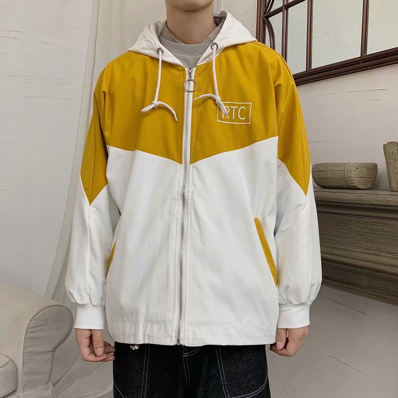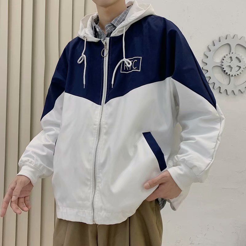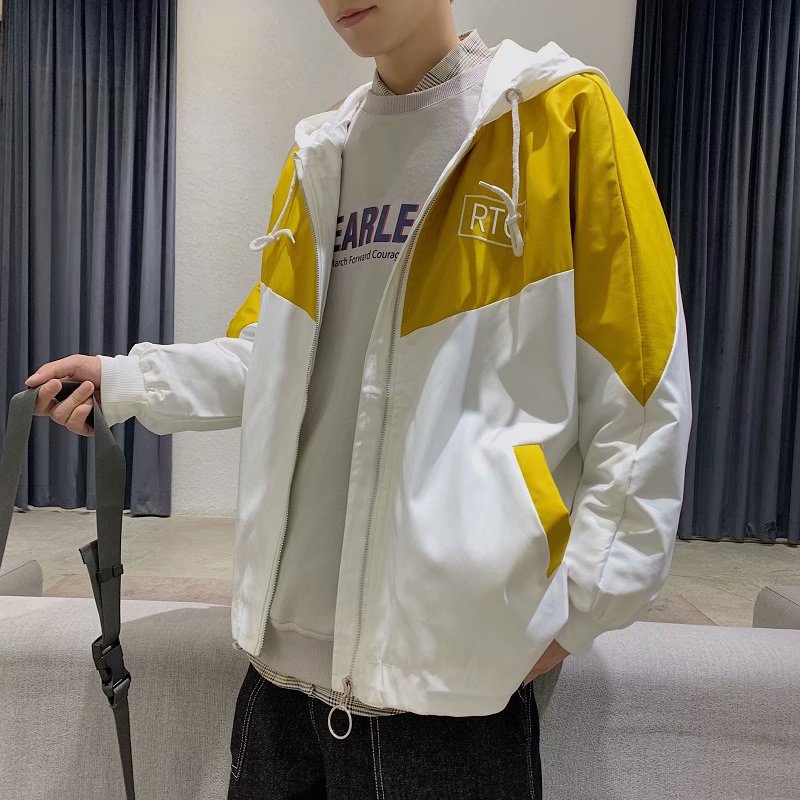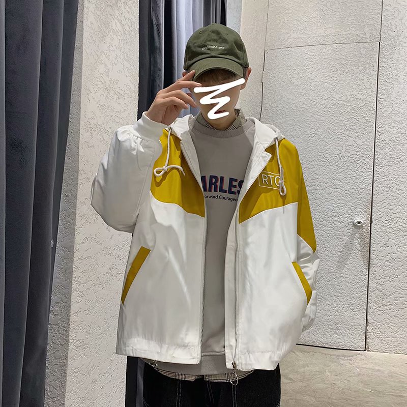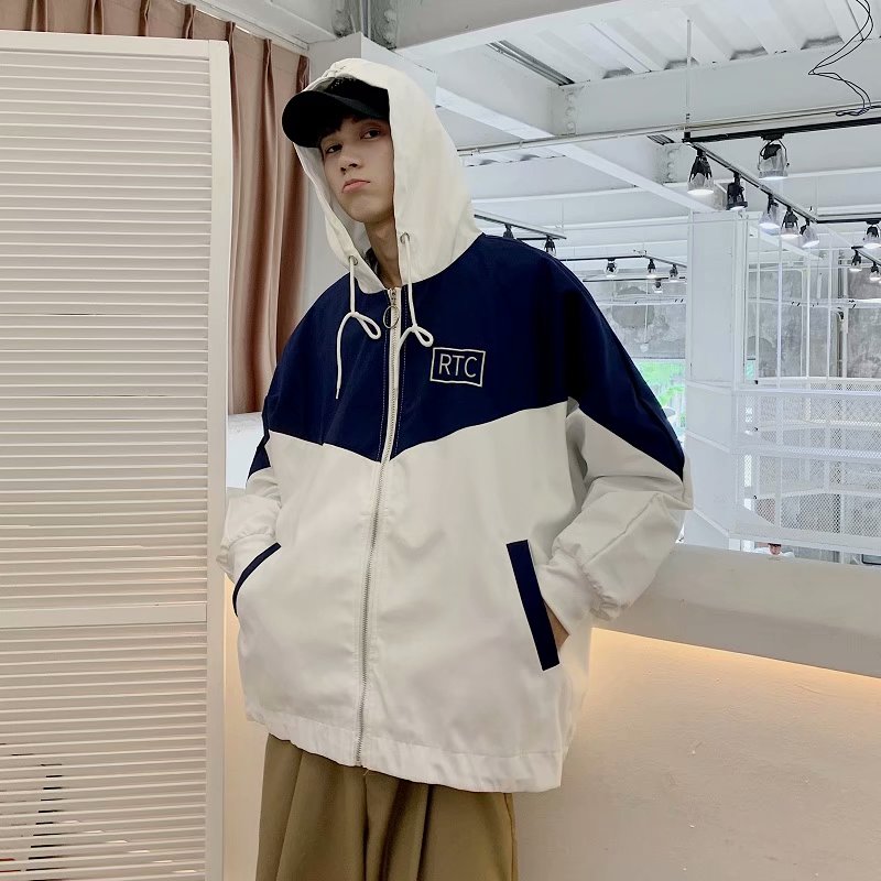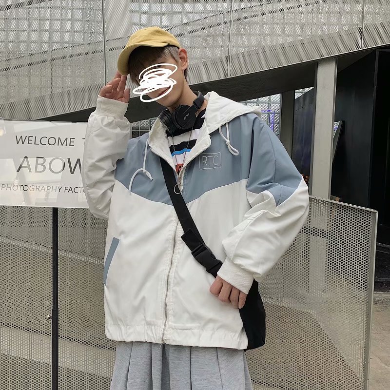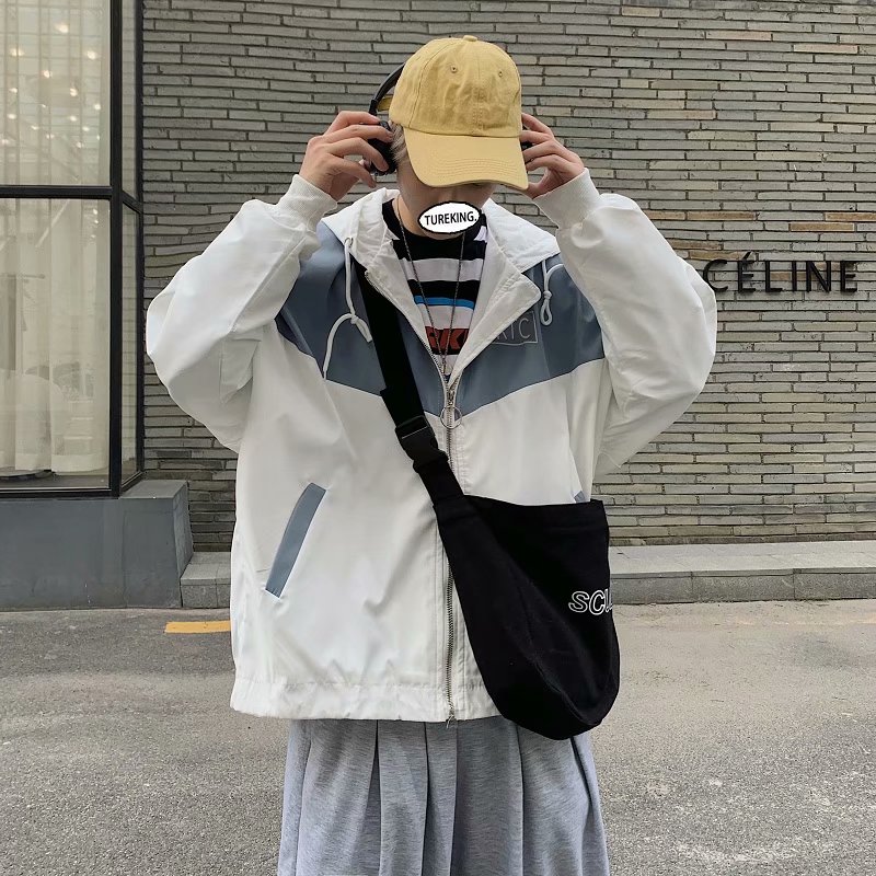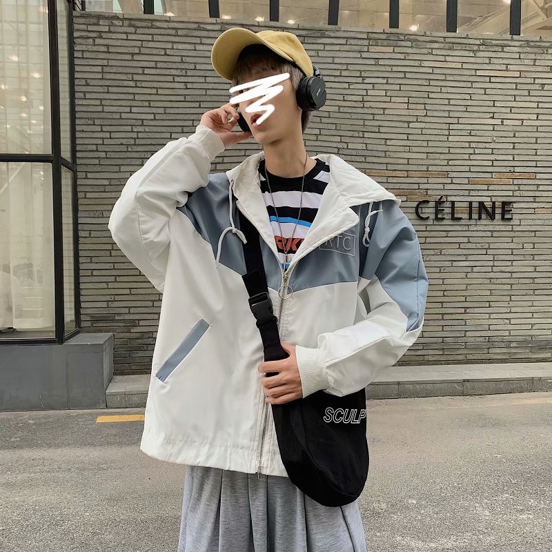 实拍 韩版街头日系青年宽松拼色上衣港风抽绳连帽百搭学生外套潮