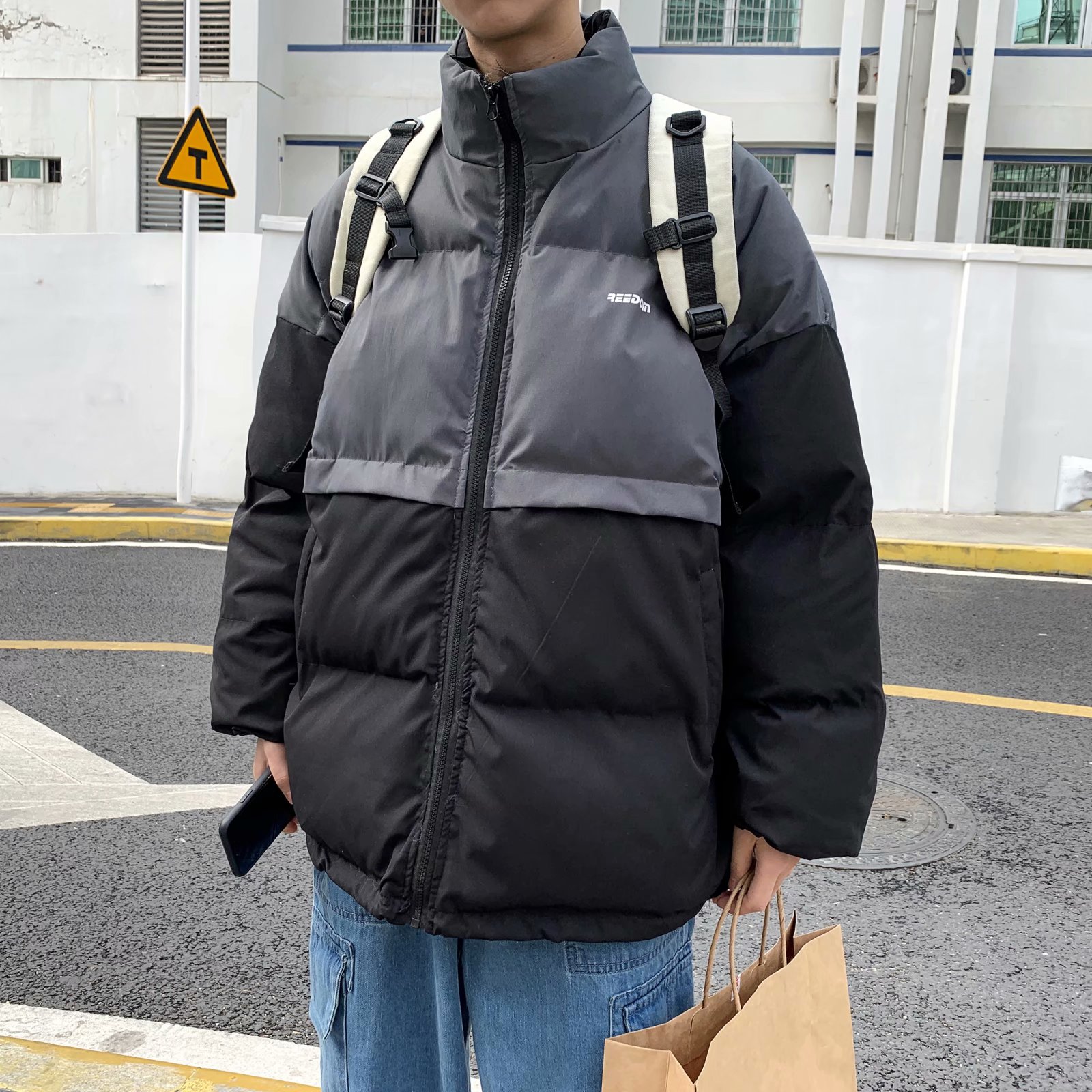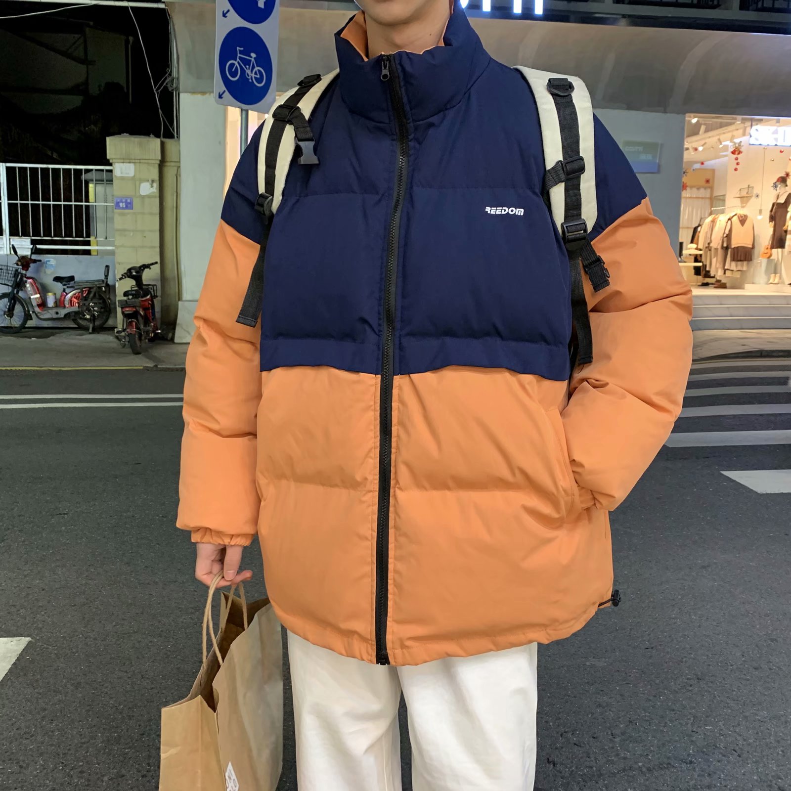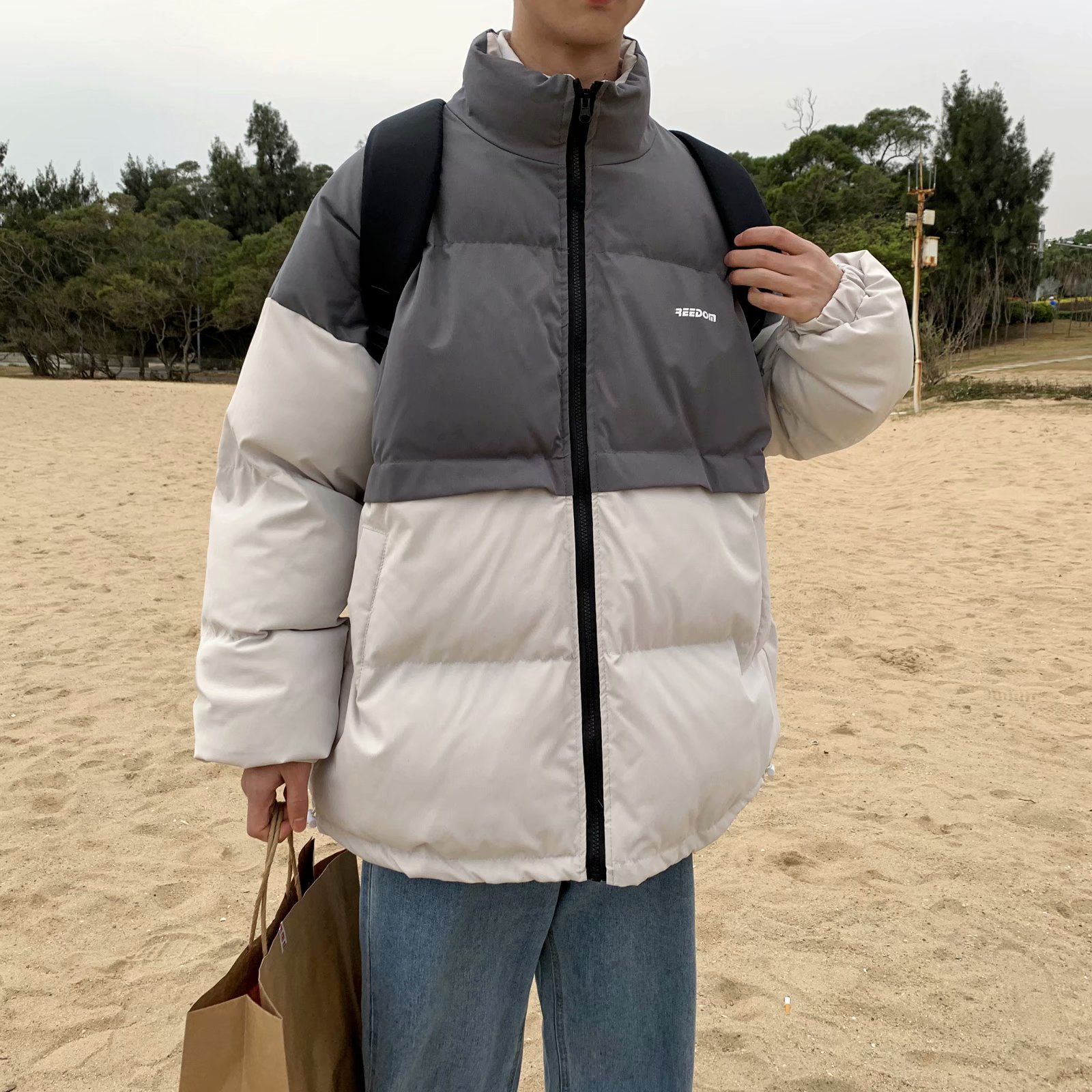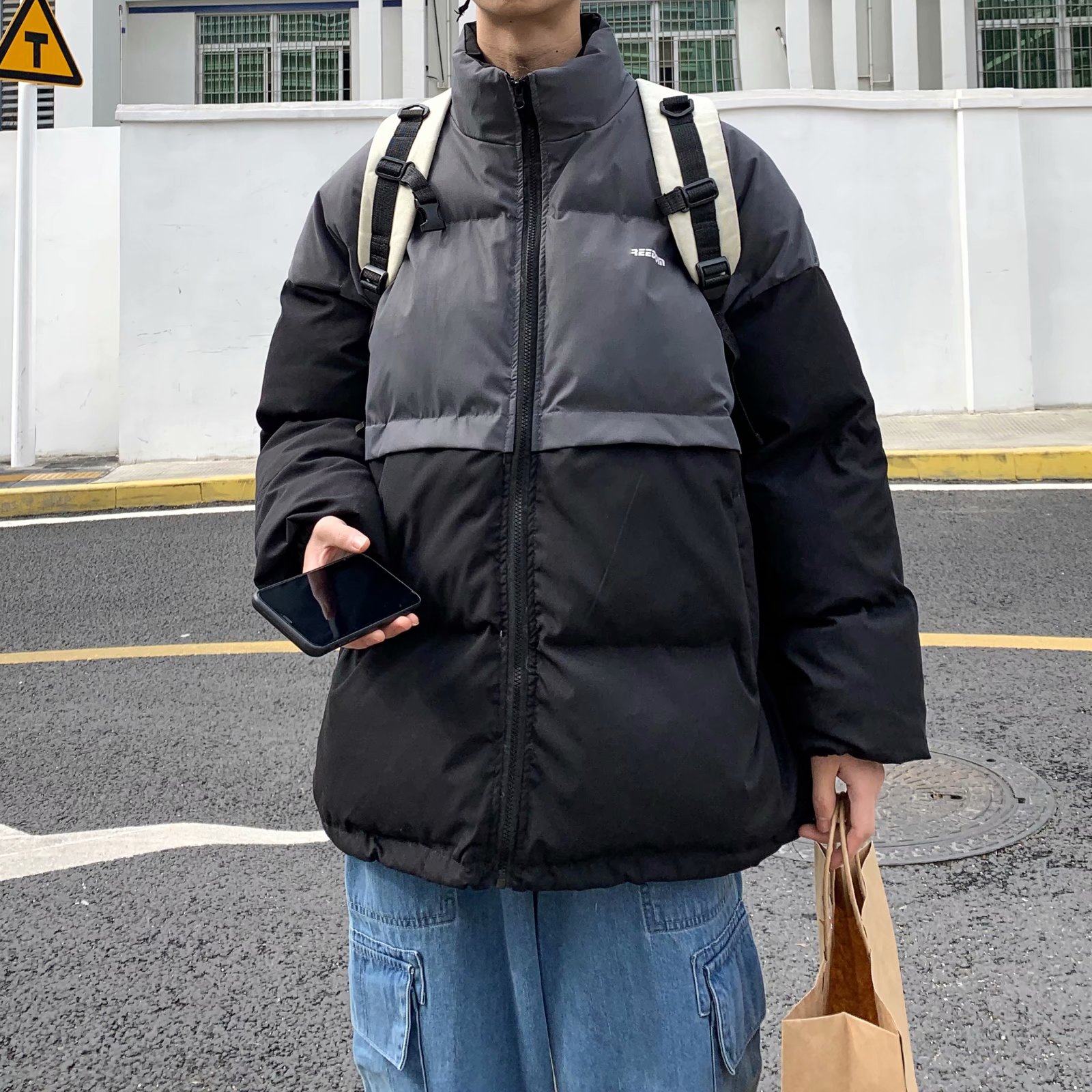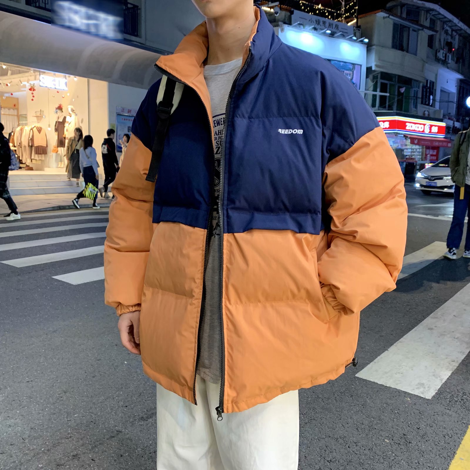 实拍网红外套棉服男学生宽松韩版潮流撞色棉衣情侣外套冬季面包服