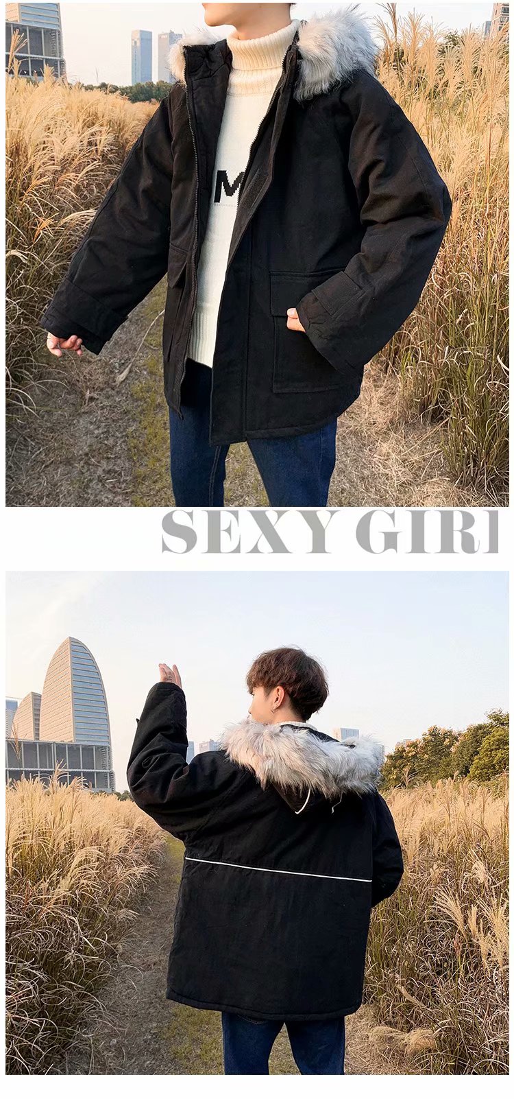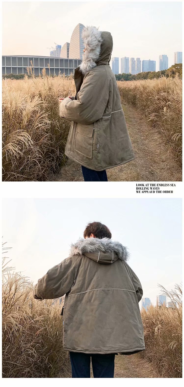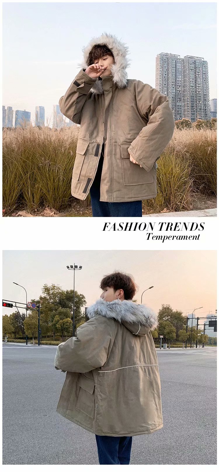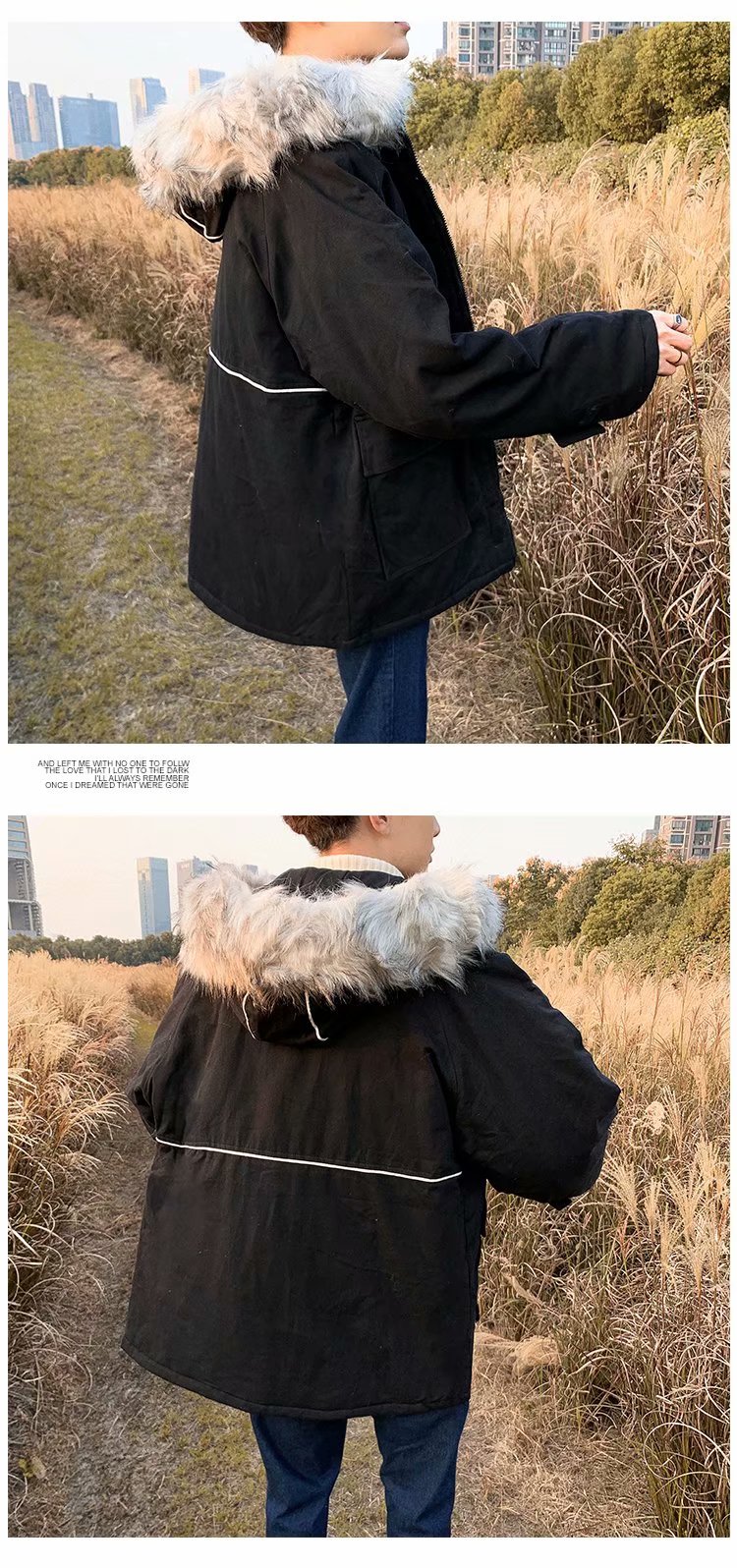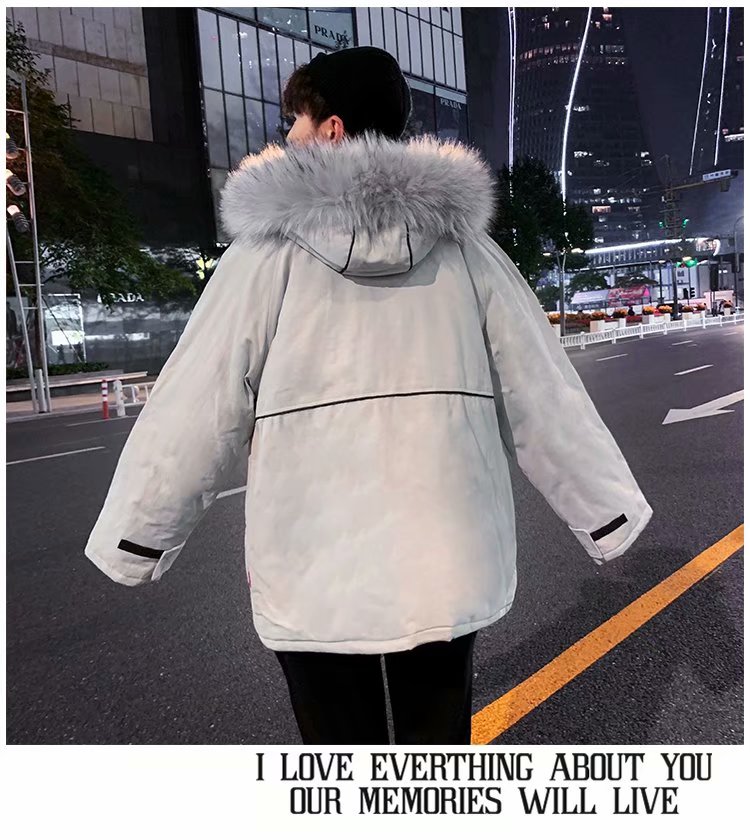 时尚毛领棉服男秋冬新款韩版学生宽松棉袄加绒加厚中长款棉衣外套