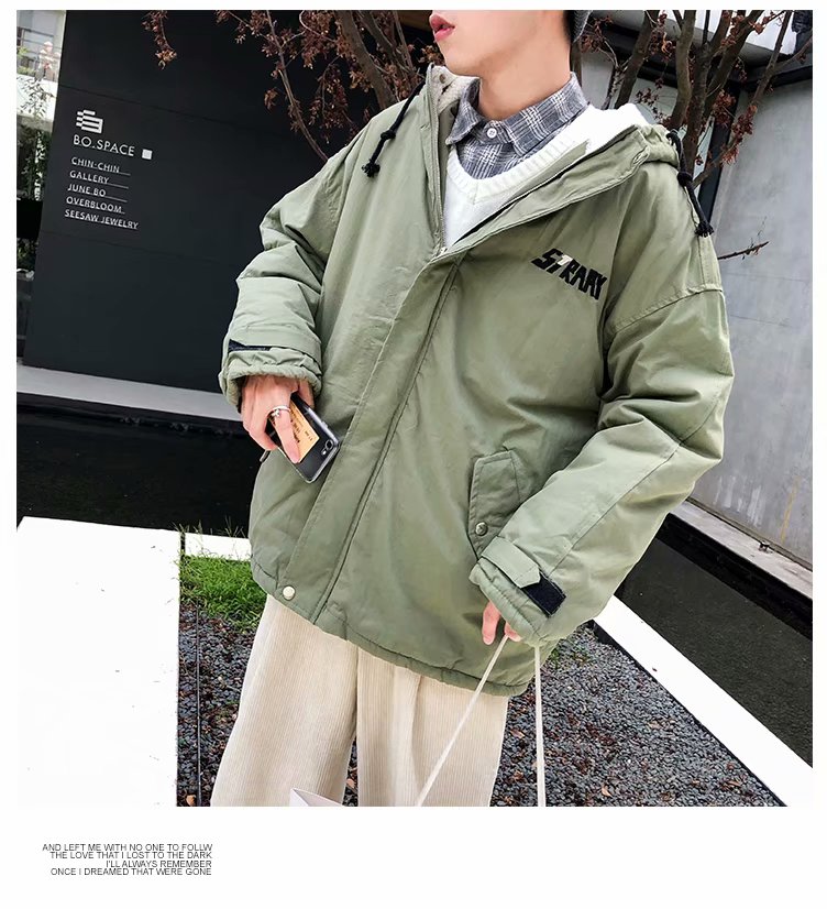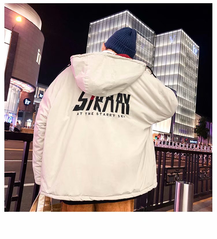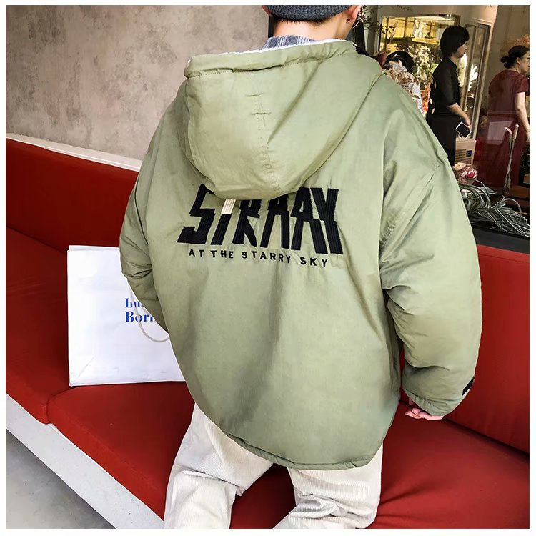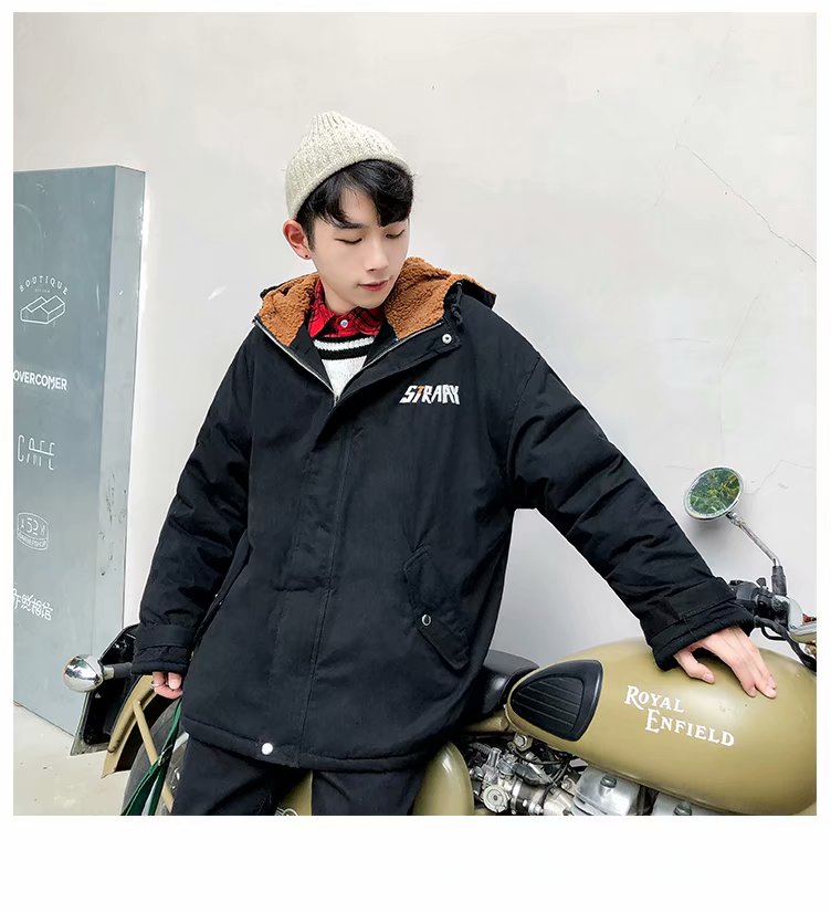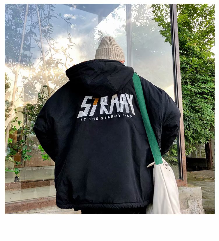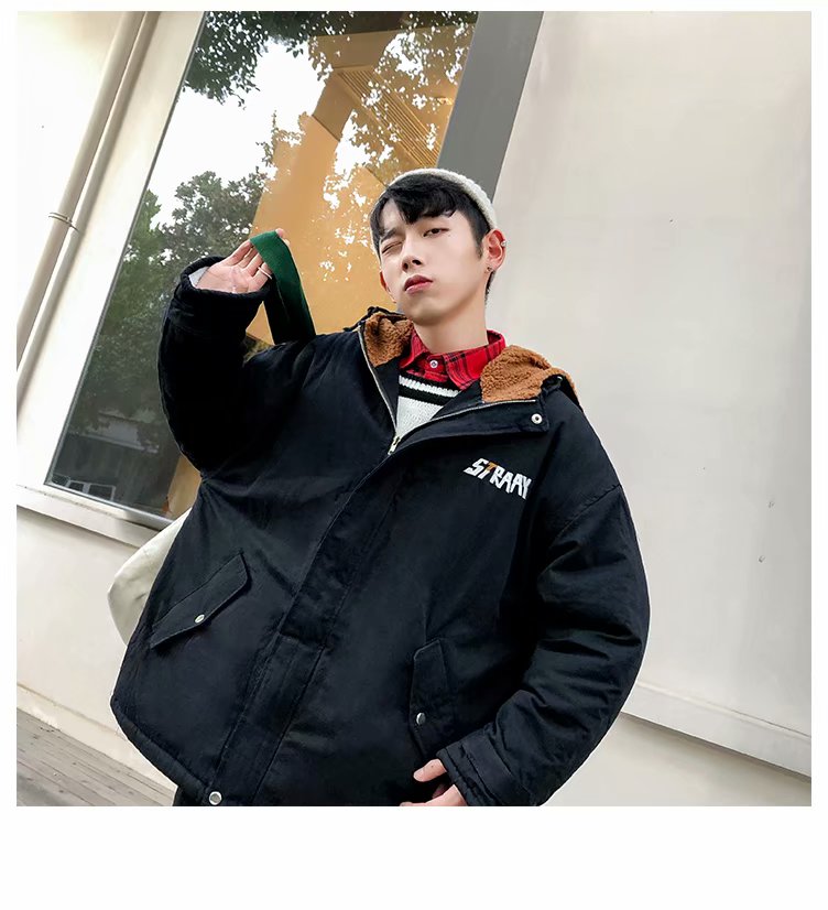 冬季港风chic羊羔毛刺绣字母外套男士韩版潮流学生连帽加厚棉衣男